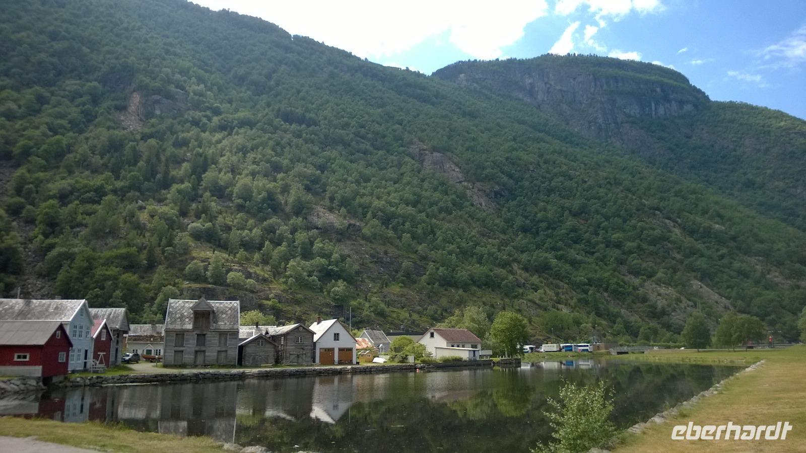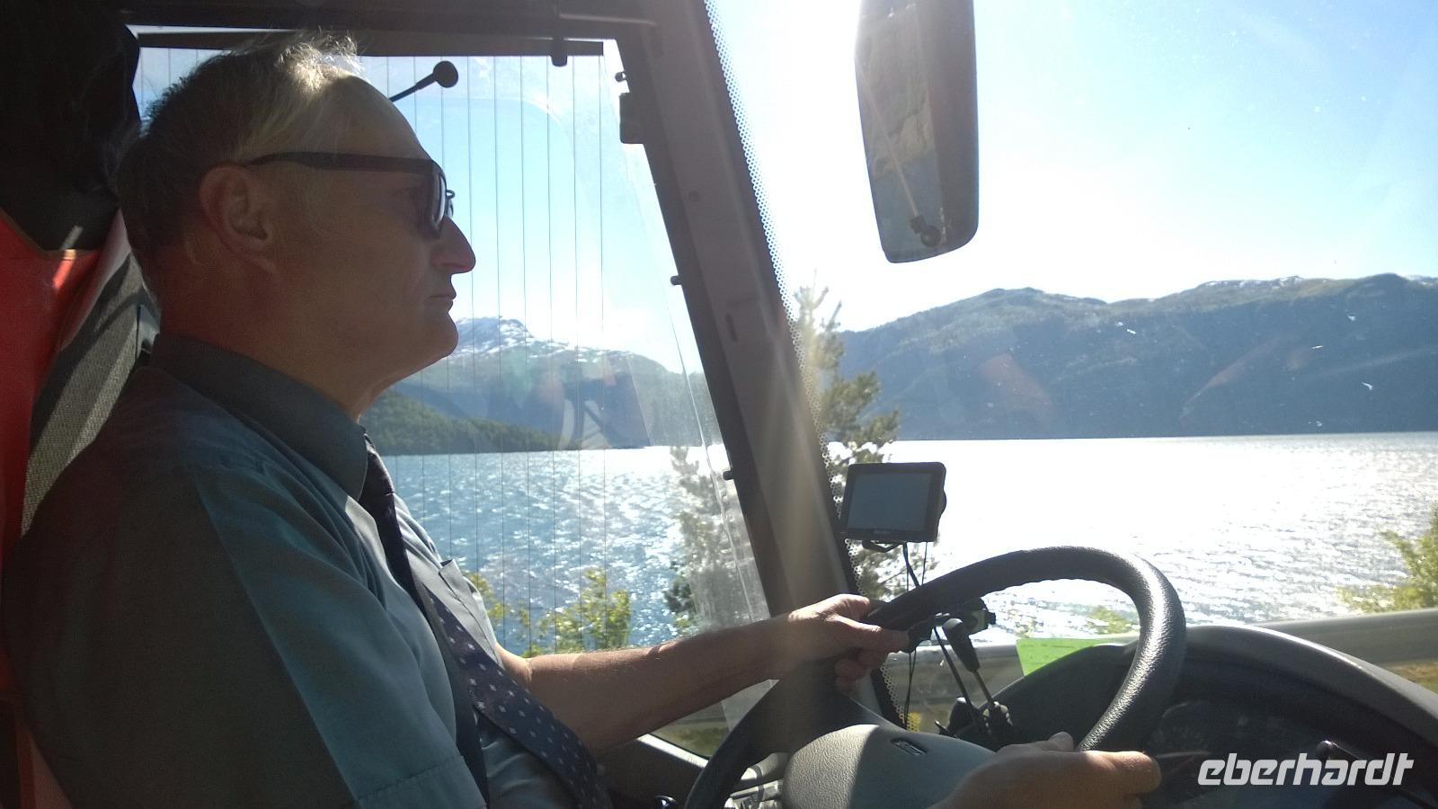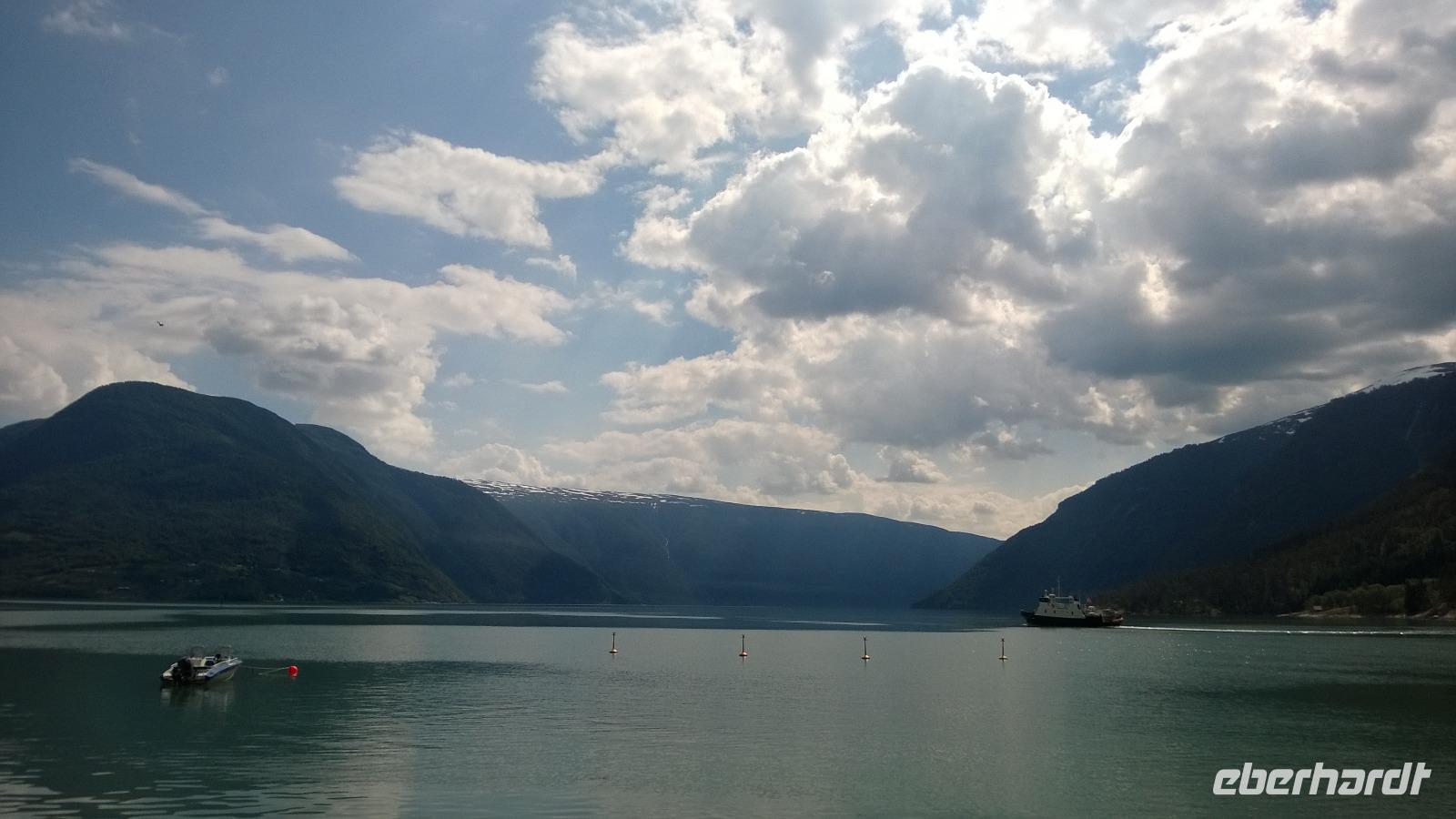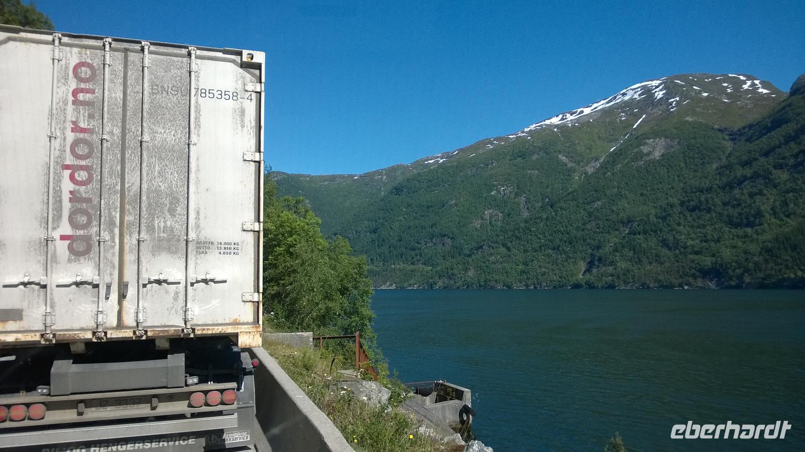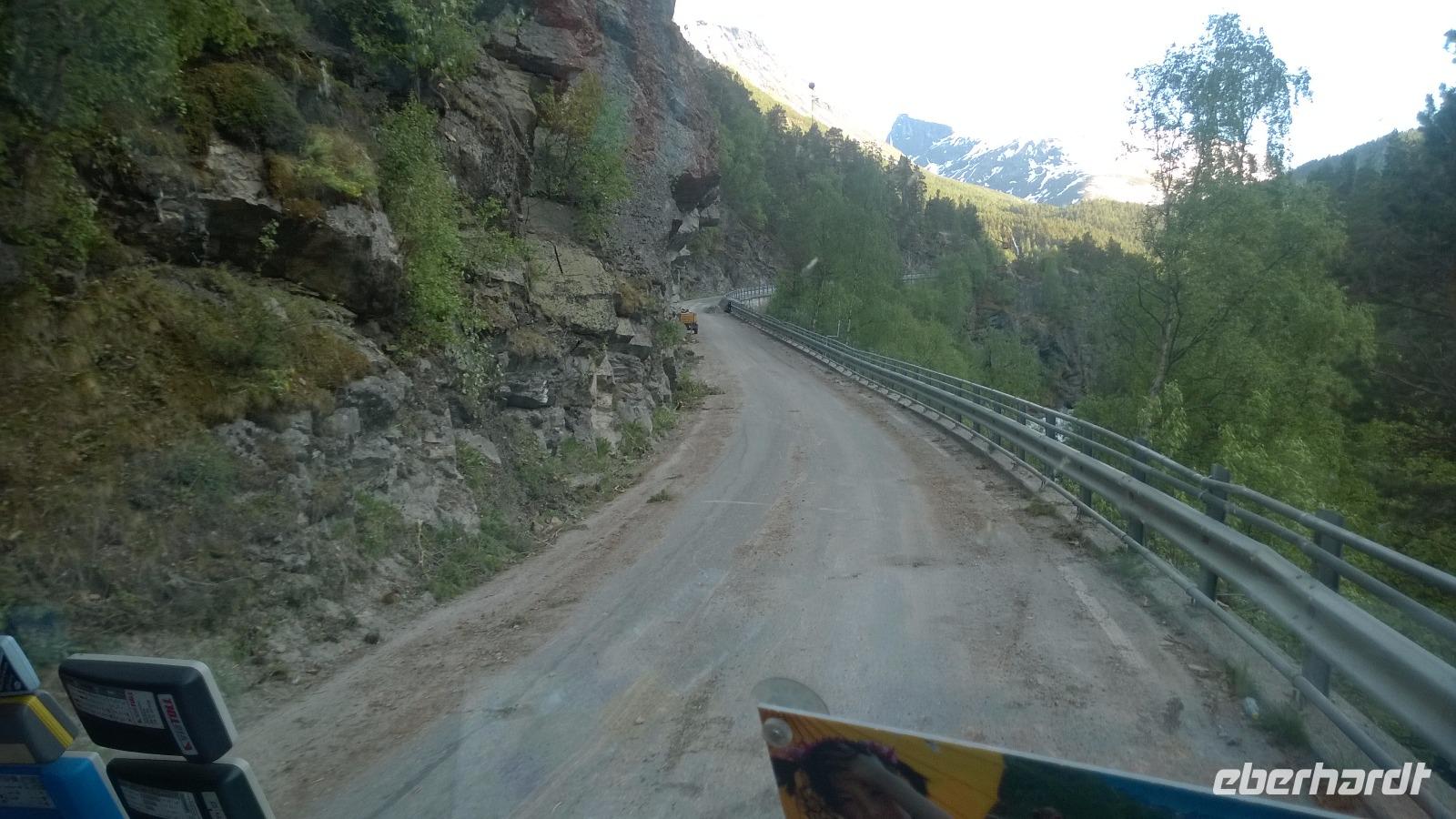 Bald nach dem Wasserfall sind wir weniger beeindruckt, sondern eher ernüchtert. Wir stehen auf einer schmalen Küstenstraße (die Landschaft hört einfach nicht auf, großartig zu sein, aber daran haben wir uns inzwischen schon gewöhnt). Also, wir stehen auf dieser kleinen, schmalen Straße, ganz nahe am Fjord. Vor uns Verkehr, hinter uns Verkehr, aber vor allem Stau. Langsam, ganz langsam bewegen wir uns vorwärts. Teilweise stehen wir auch einfach nur still. Diese kleine, enge Küstenstraße ist doch tatsächlich verstopft, weil nämlich auf einer anderen Zufahrtsstraße zu Bergen Gerölllawinen heruntergekommen sind und der Verkehr über unsere Straße umgeleitet werden muss. Nun werden wir also Zeugen, wie die Norweger ein handfestes Verkehrsproblem selbst in die Hand nehmen. Eine Art Abenteuer ist das gewissermaßen auch.