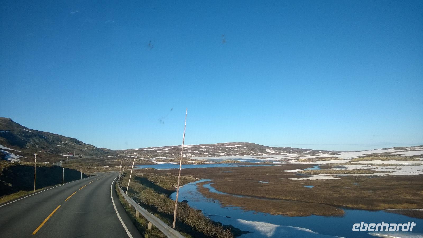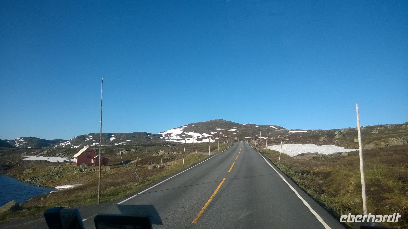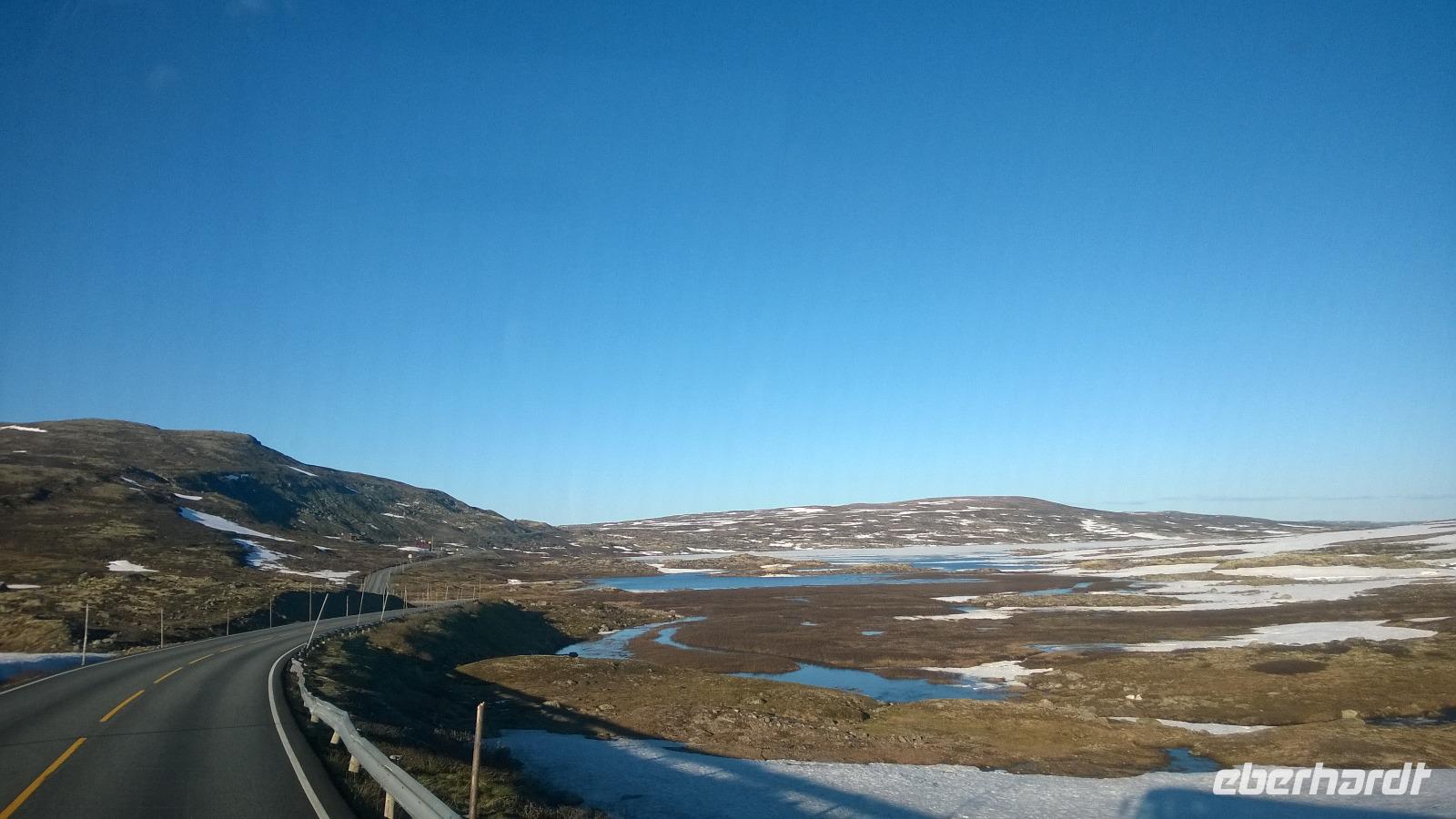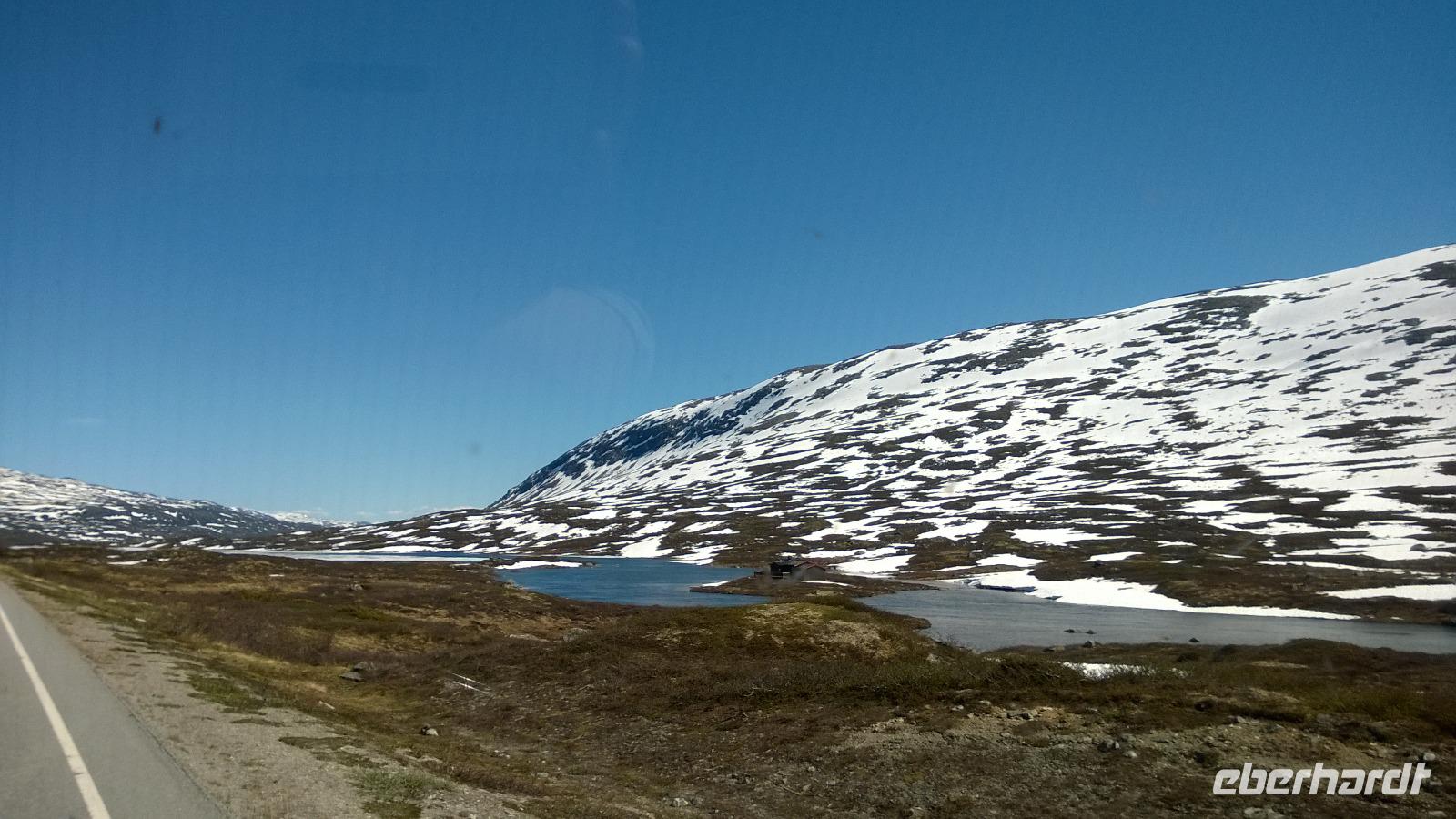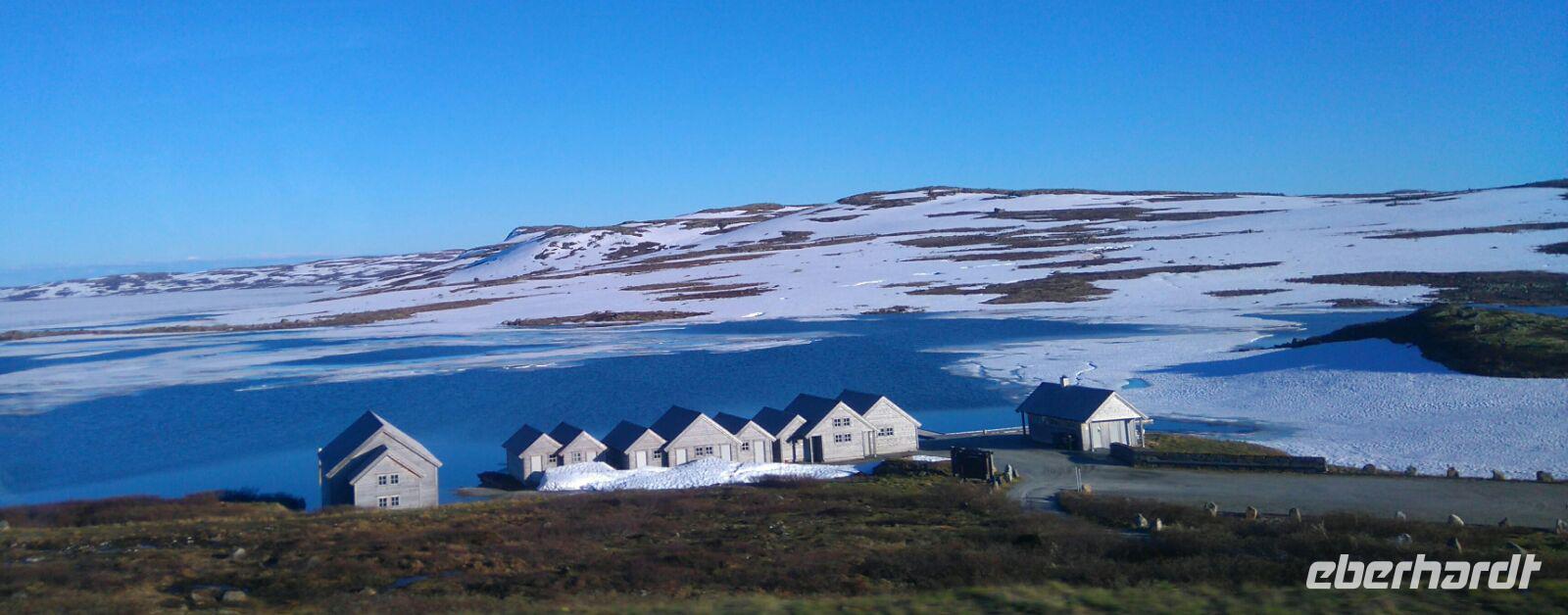 Nach geschlagenen drei Stunden hat sich der gordische Knoten gelöst und wir düsen der Hardangervidda entgegen. Die Hochebene hält für uns schönste Landschaft in einer Mischung aus Schneefeldern, Seen und kleinen idyllischen Hütten parat.