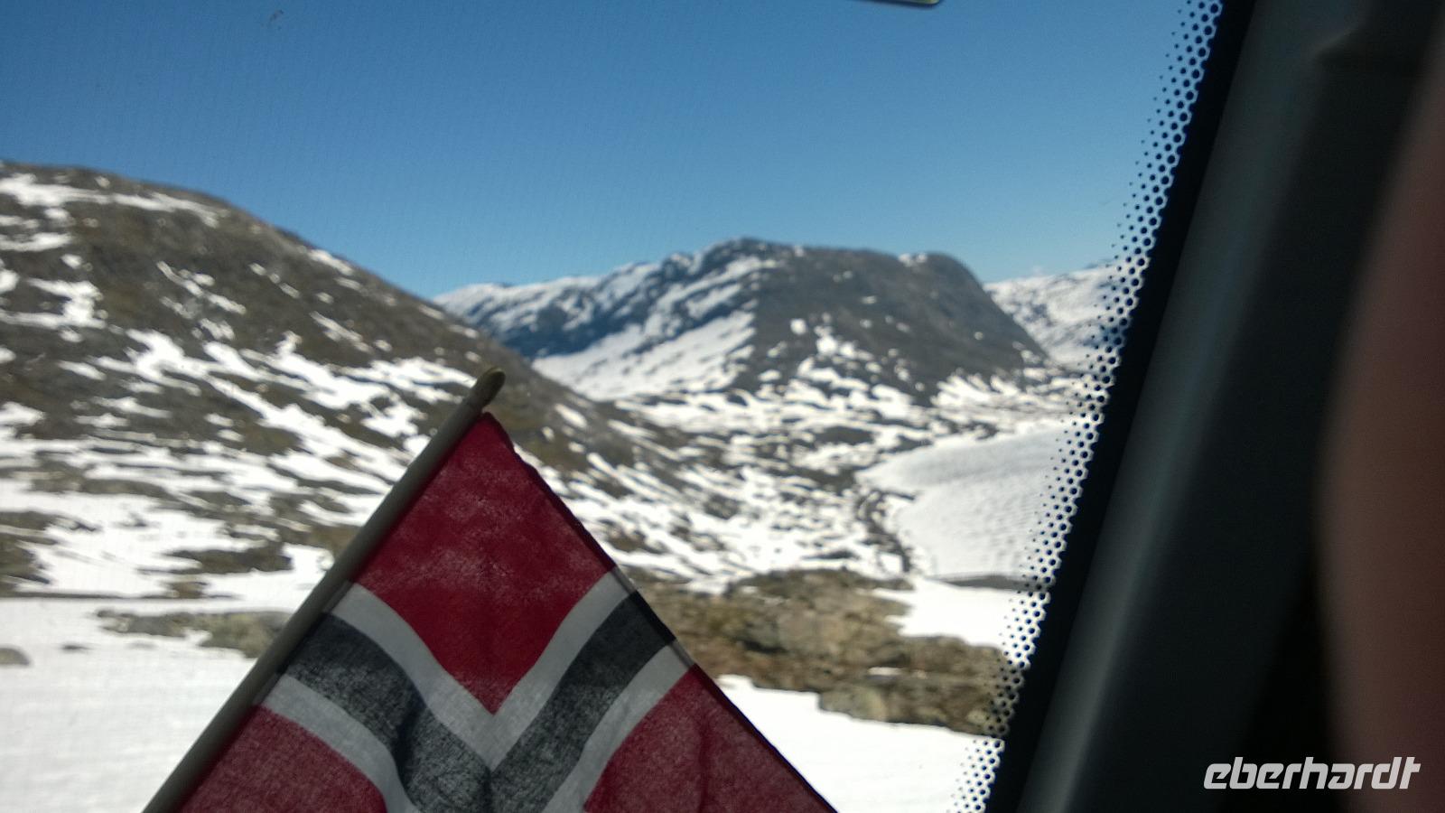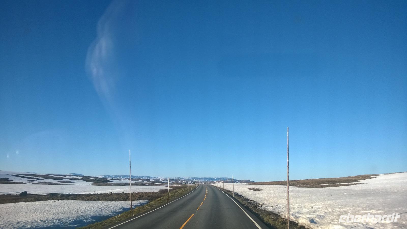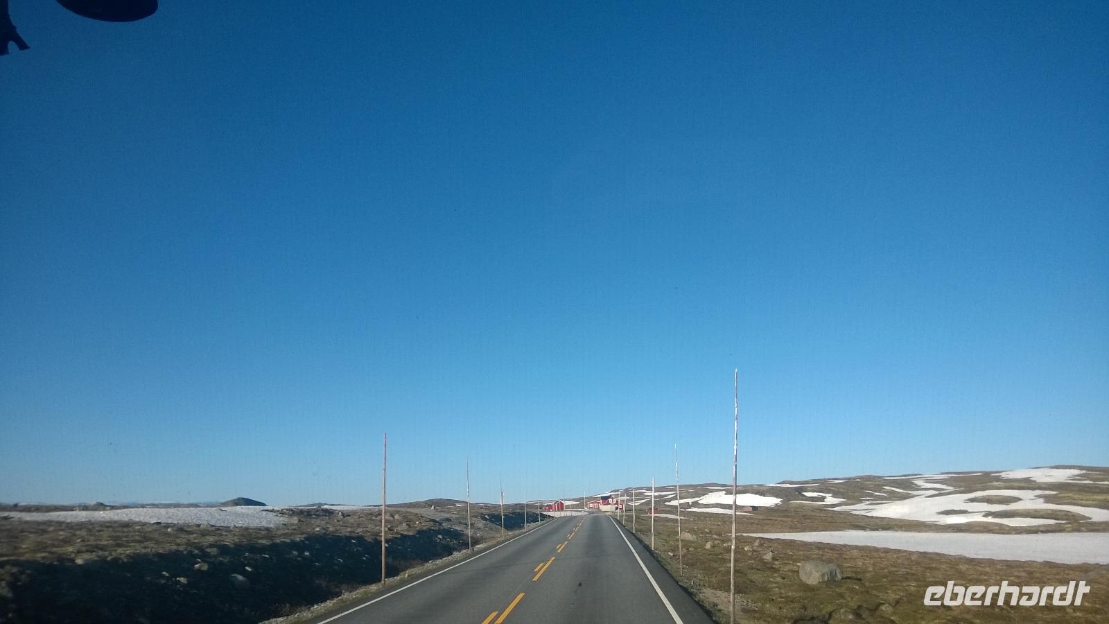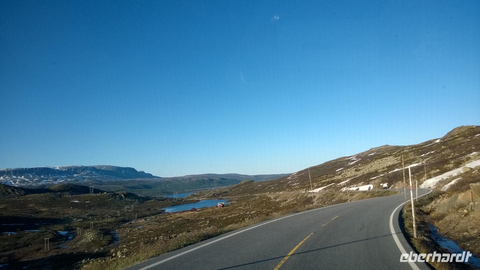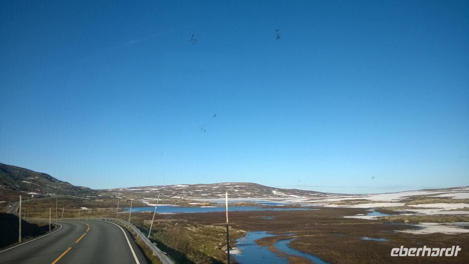 Nach geschlagenen drei Stunden hat sich der gordische Knoten gelöst und wir düsen der Hardangervidda entgegen. Die Hochebene hält für uns schönste Landschaft in einer Mischung aus Schneefeldern, Seen und kleinen idyllischen Hütten parat.