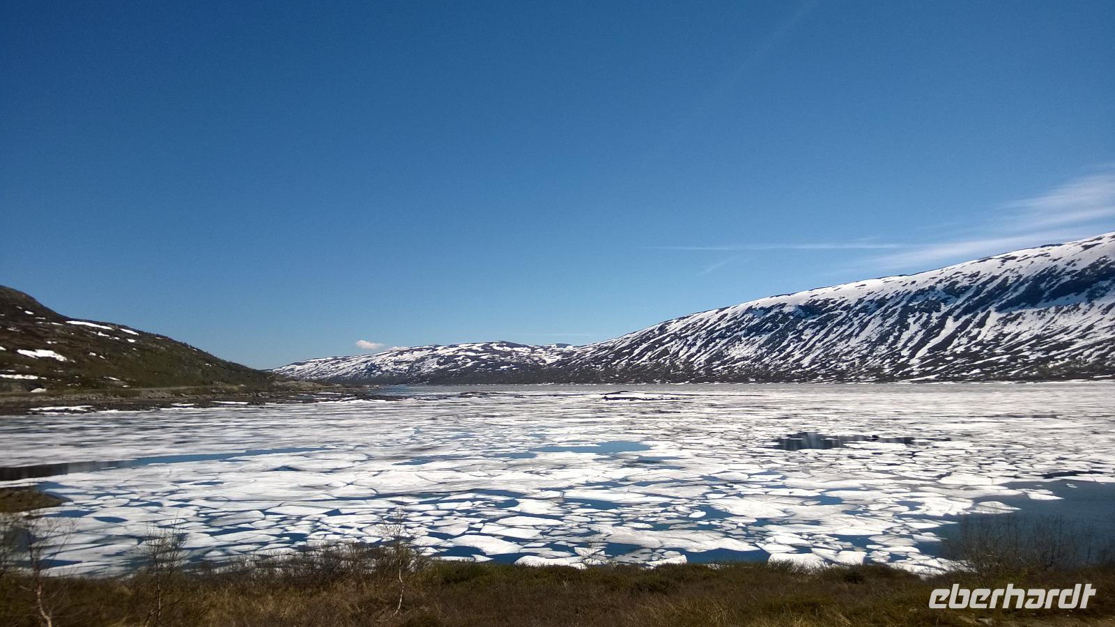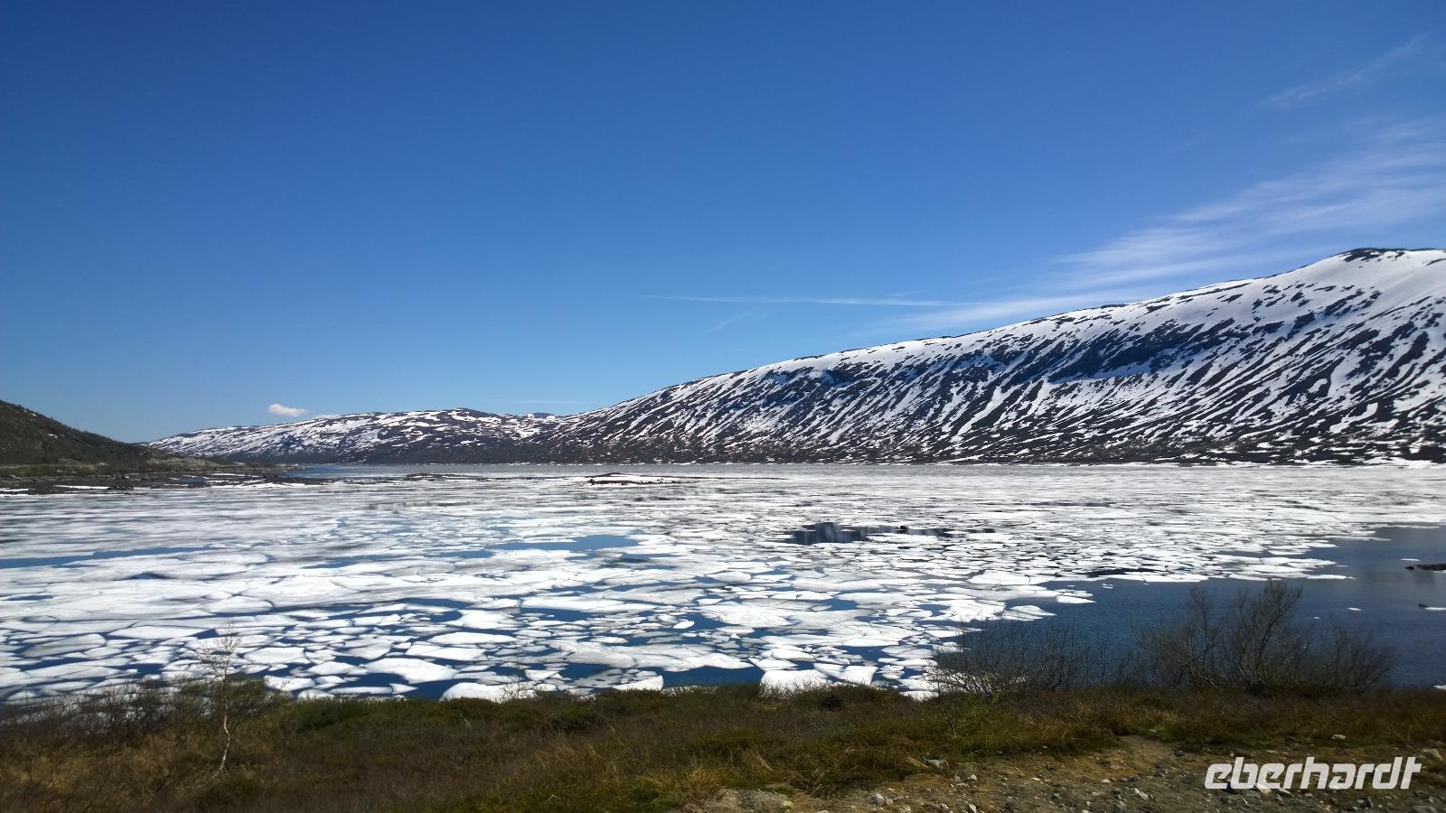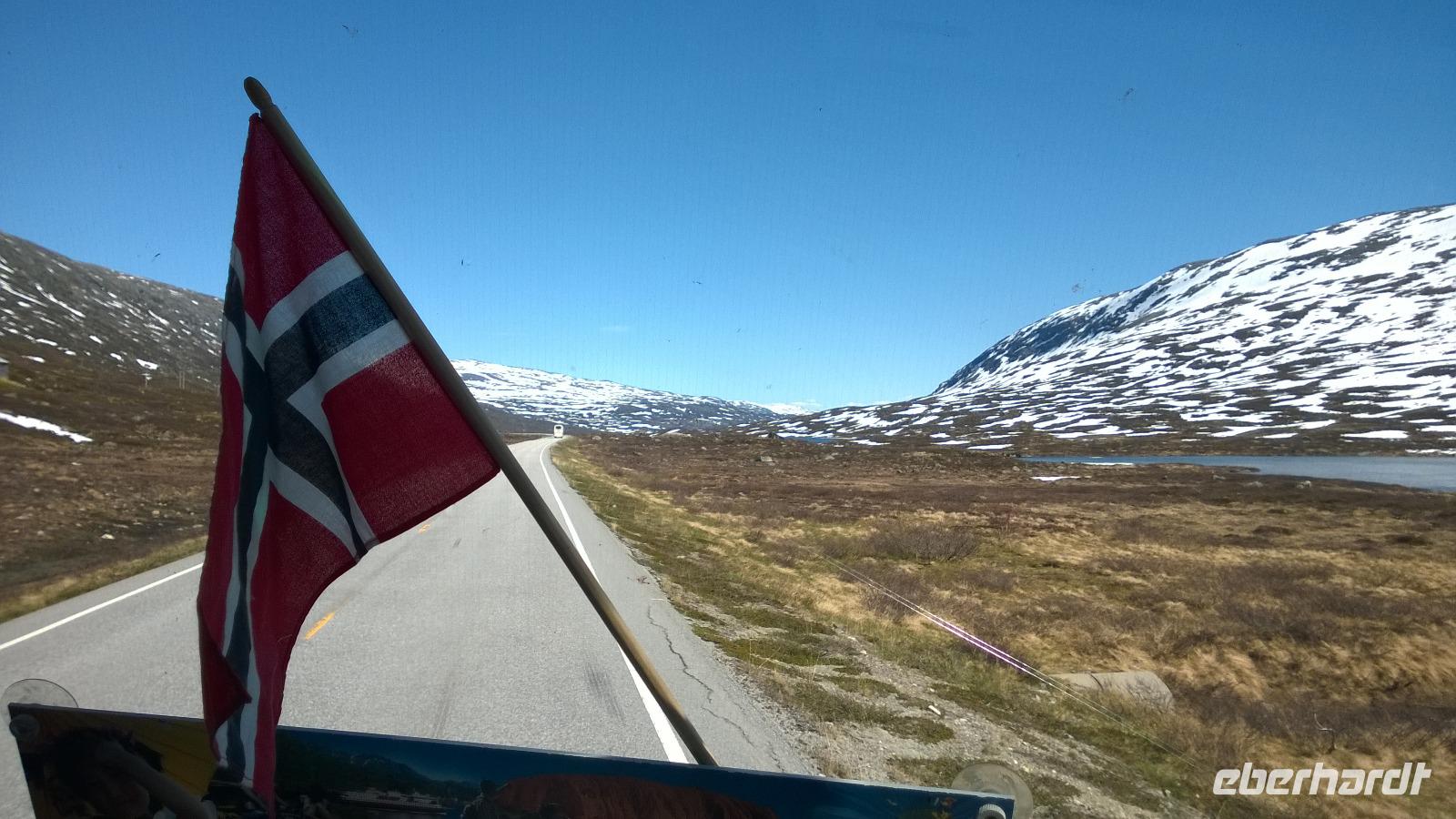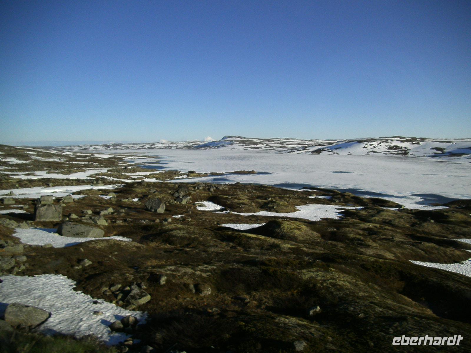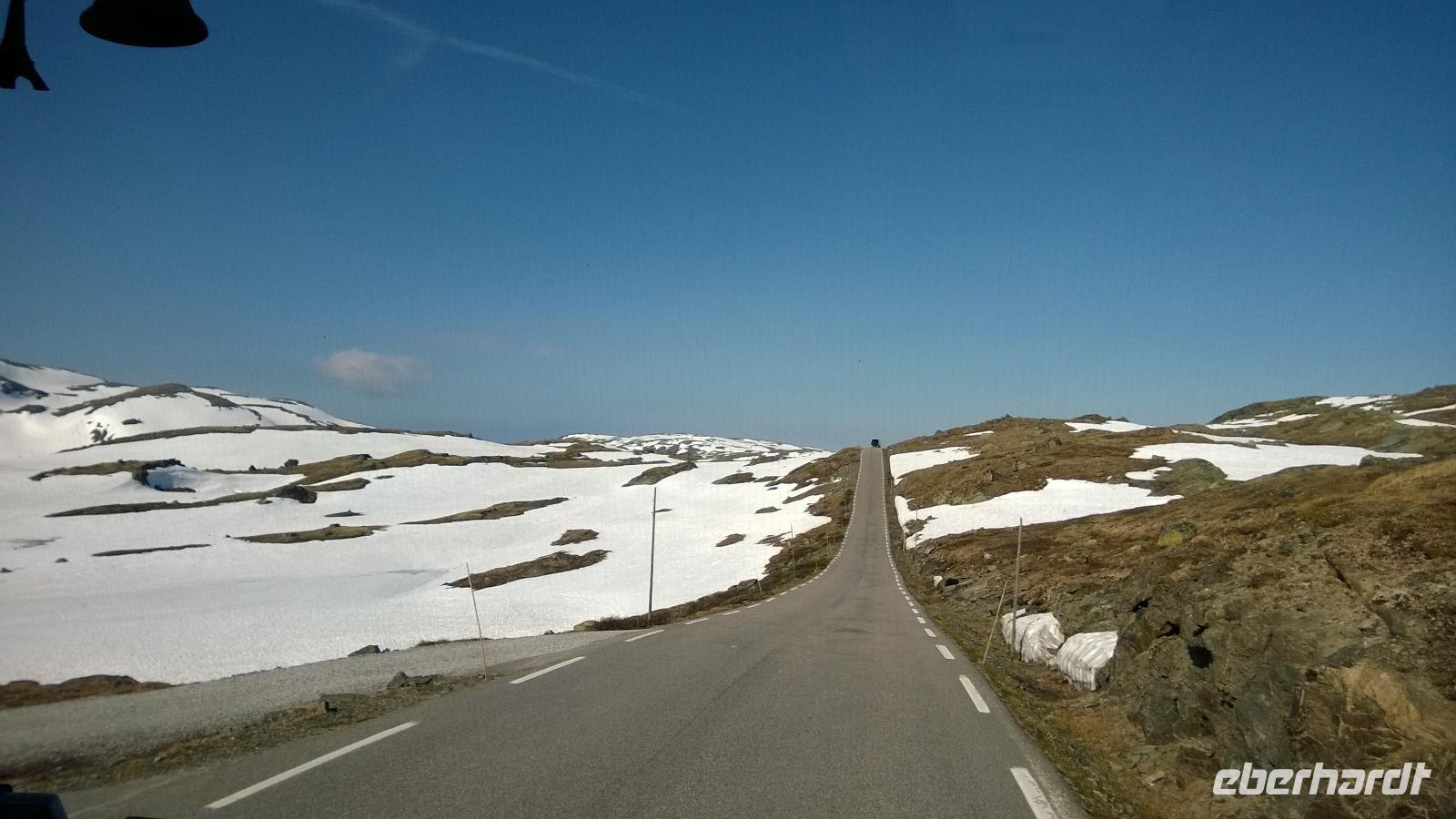Nach geschlagenen drei Stunden hat sich der gordische Knoten gelöst und wir düsen der Hardangervidda entgegen. Die Hochebene hält für uns schönste Landschaft in einer Mischung aus Schneefeldern, Seen und kleinen idyllischen Hütten parat.