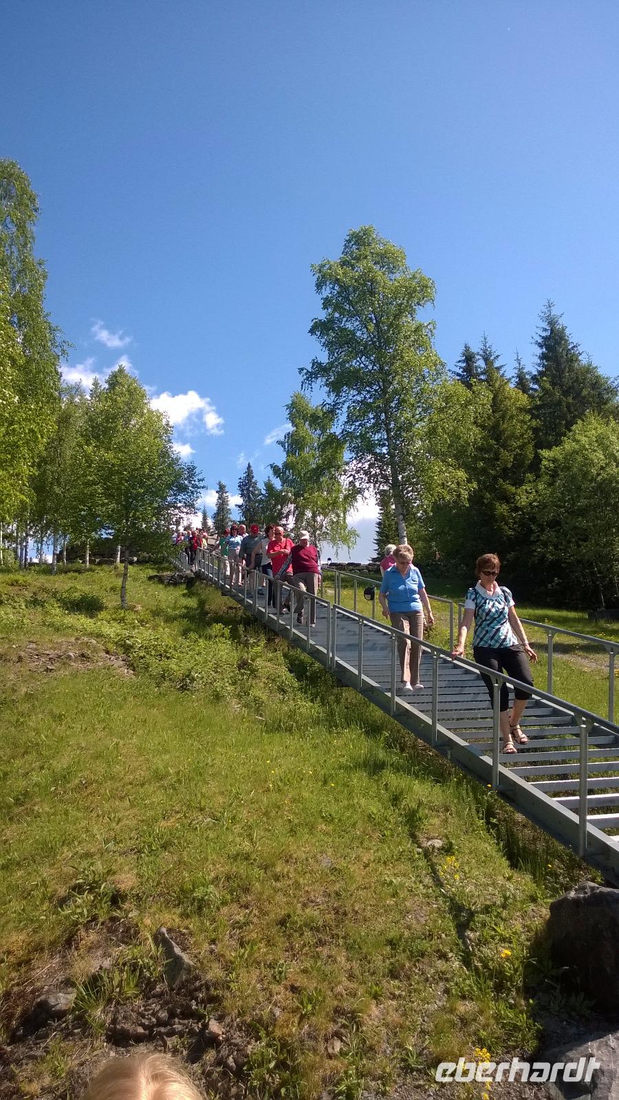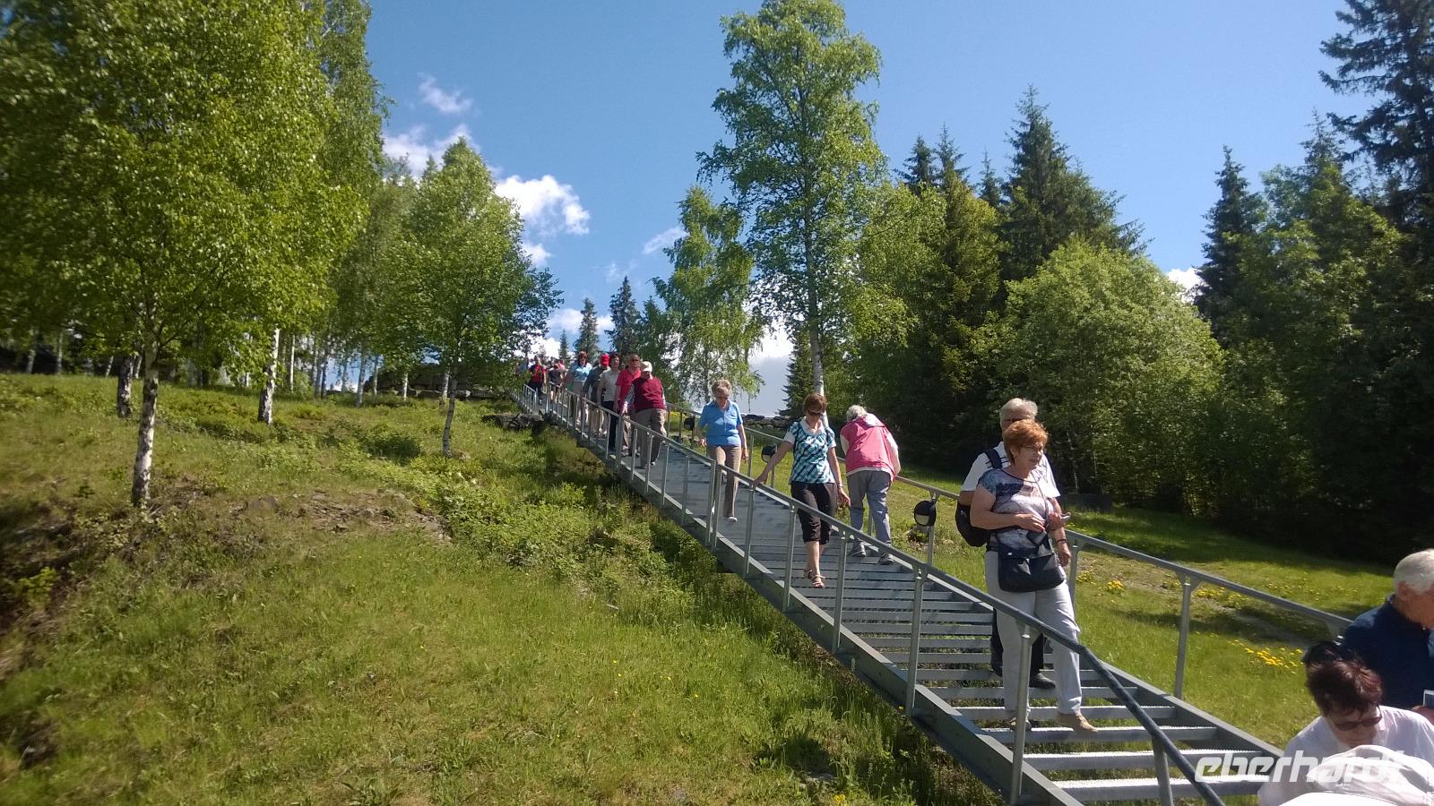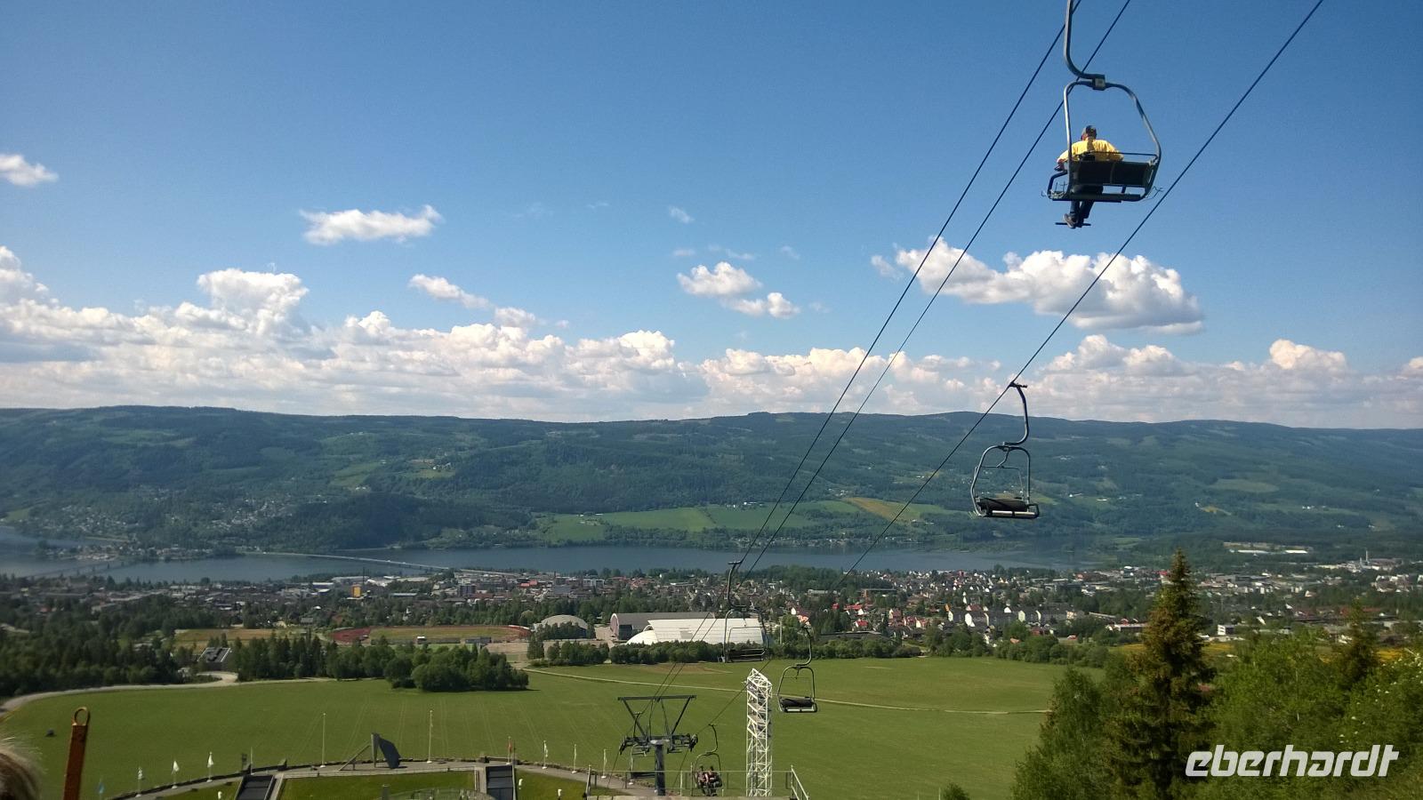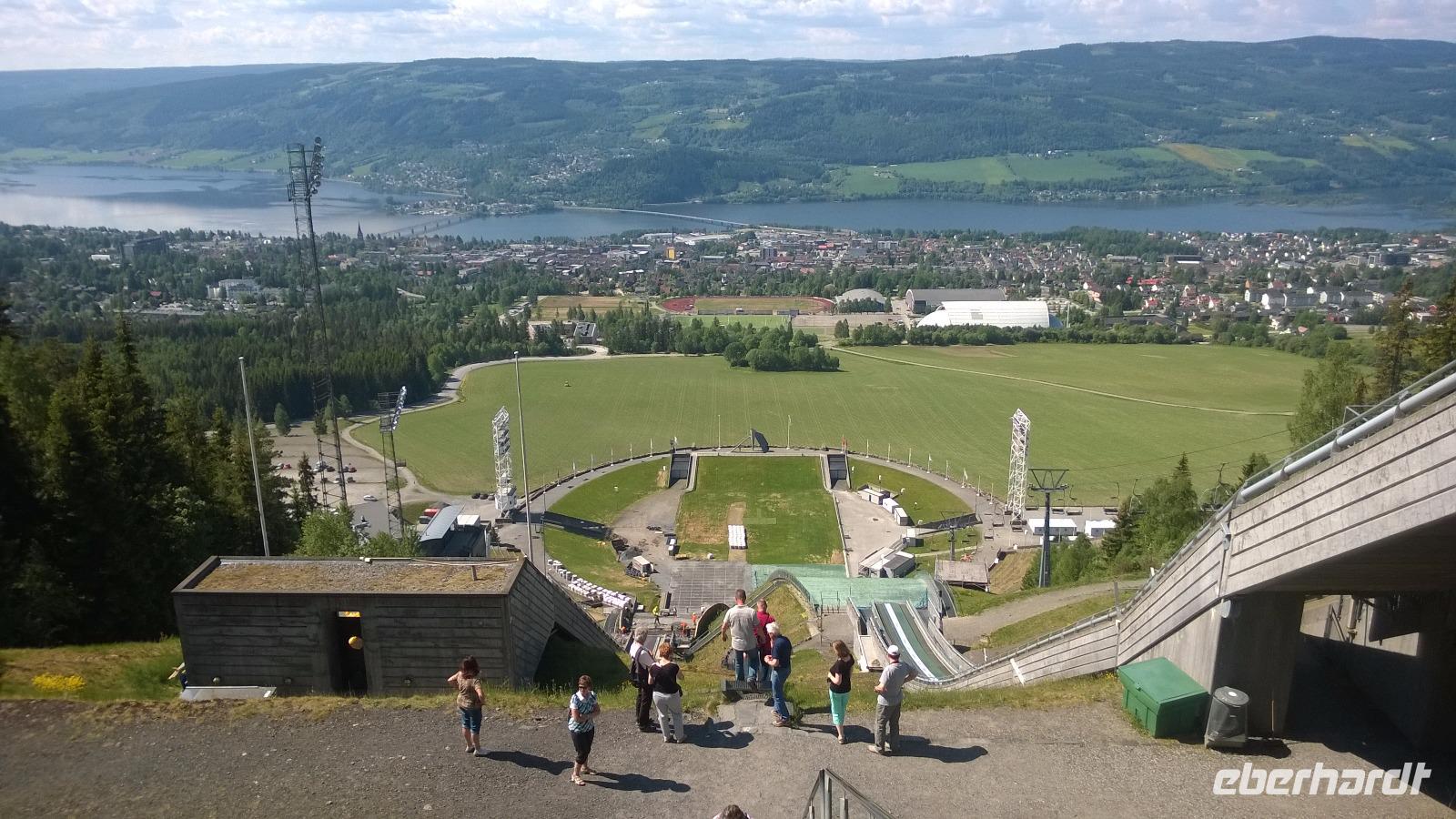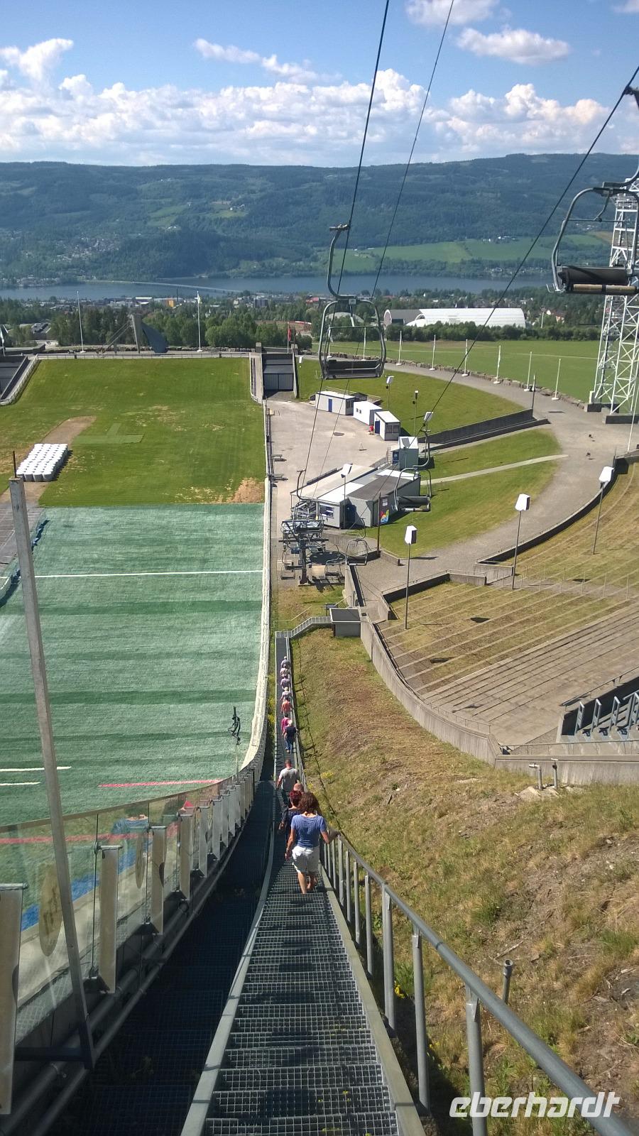 Doch der Berg ruft. Genauer gesagt ist es die Sprungschanze von Lillehammer, Lysgard, die wir uns von oben anschauen wollen. Der Blick über die Stadt ist von hier aus großartig. Der Weg nach unten weit und steil. So manch einer wagt es, die vielen Stufen bergab an den Schanzen entlang zu gehen.