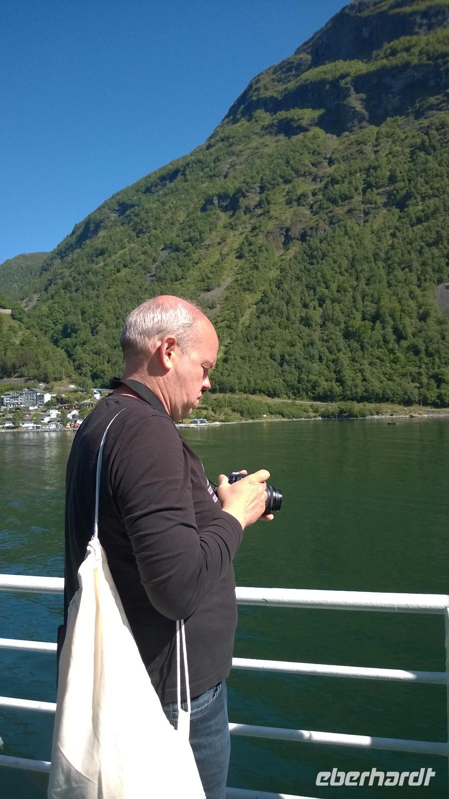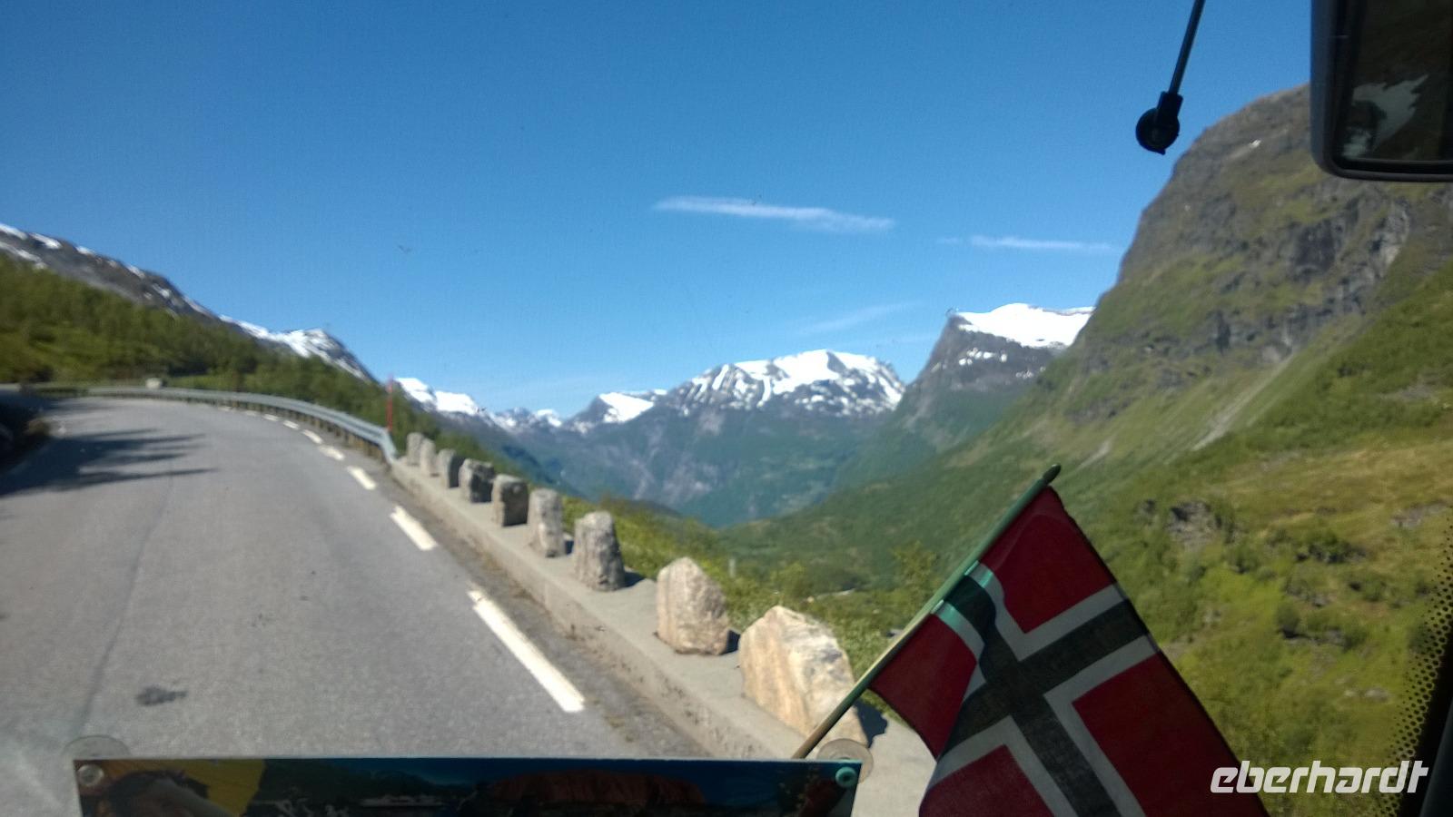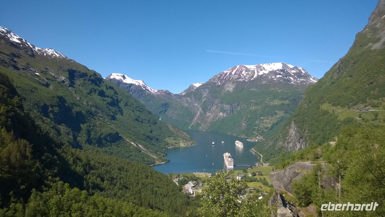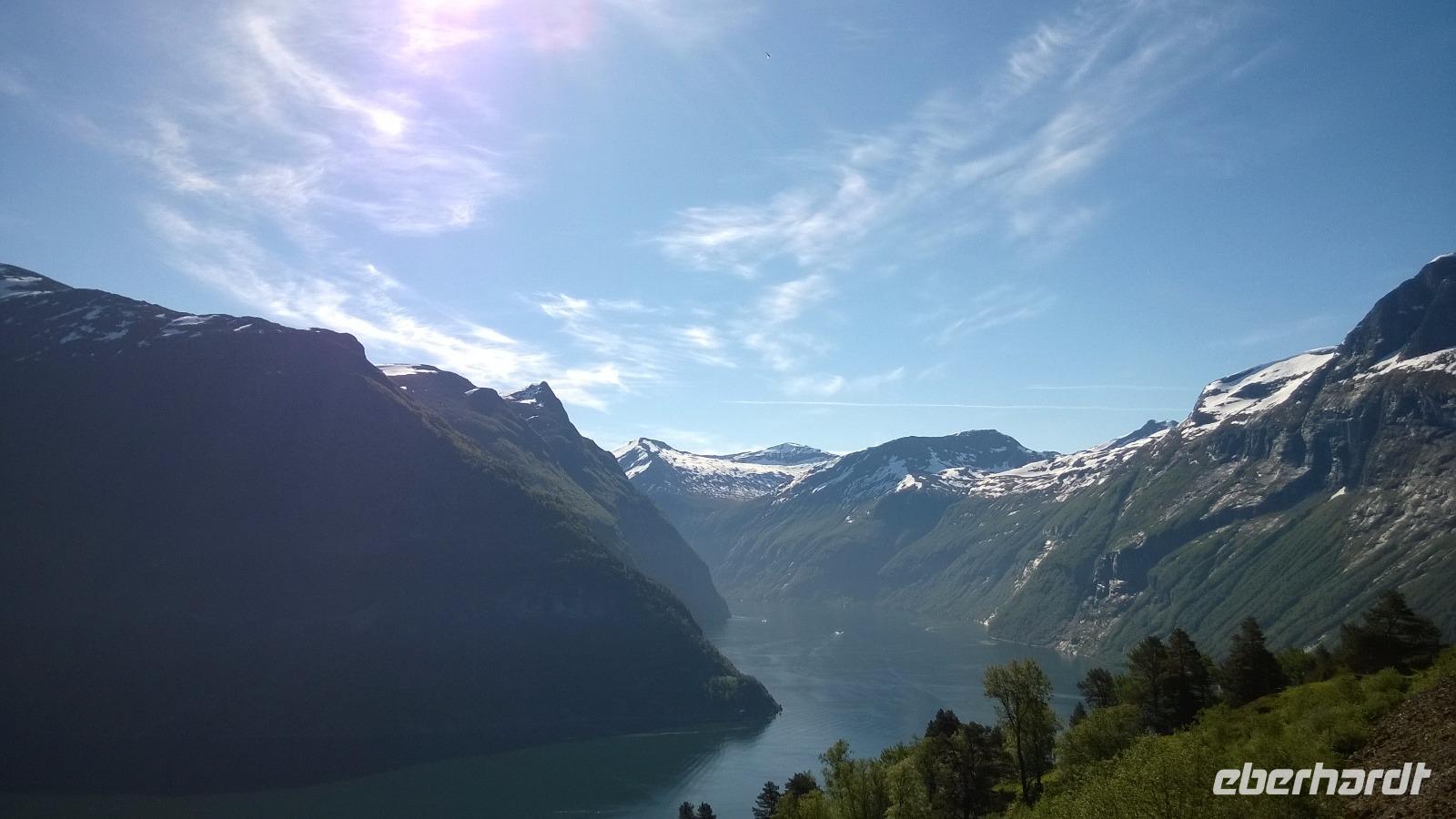 Bei dieser Reise folgt ein Höhepunkt auf den nächsten. Und so ist es heute der Geirangerfjord, welcher ganz besonders heraussticht. Wir machen eine kleine Kreuzfahrt über den Fjord, sehen, staunen, genießen. Das Wetter ist wiedermal super und verwöhnt uns mit Sonnenschein. In dem kleinen Ort Geiranger lässt es sich dann noch gut bummeln, bis wir schließlich weiterfahren auf die Dalsnibba. Oh, was für ein Blick! Es ist ja nicht so, dass wir bisher wenig gute Fotomotive gehabt hätten, aber das hier schlägt doch alles Dagewesene um Längen! Zwischen schneebedeckten Berggipfeln liegt unten, weit weit unten in der Tiefe, der Geiranger Fjord und auf ihm schippert ein Kreuzfahrer.