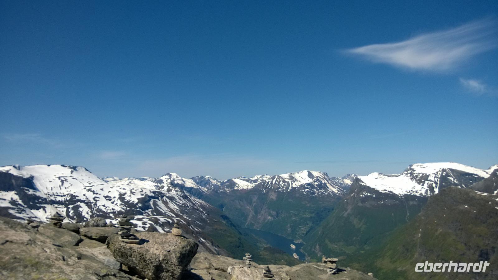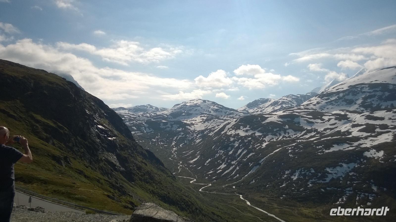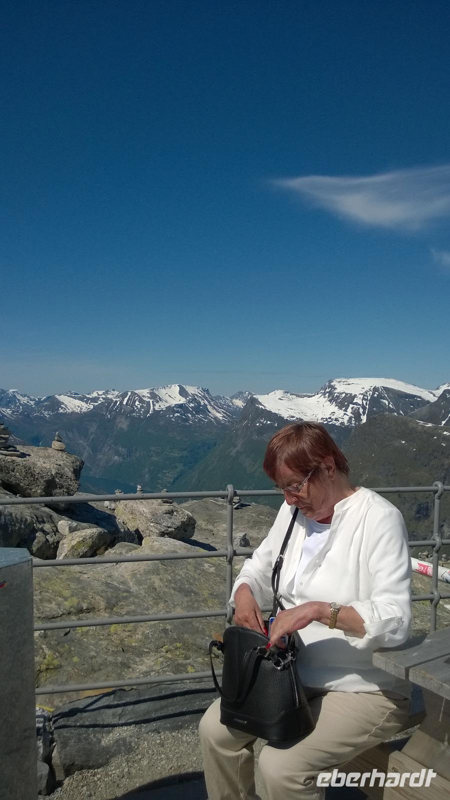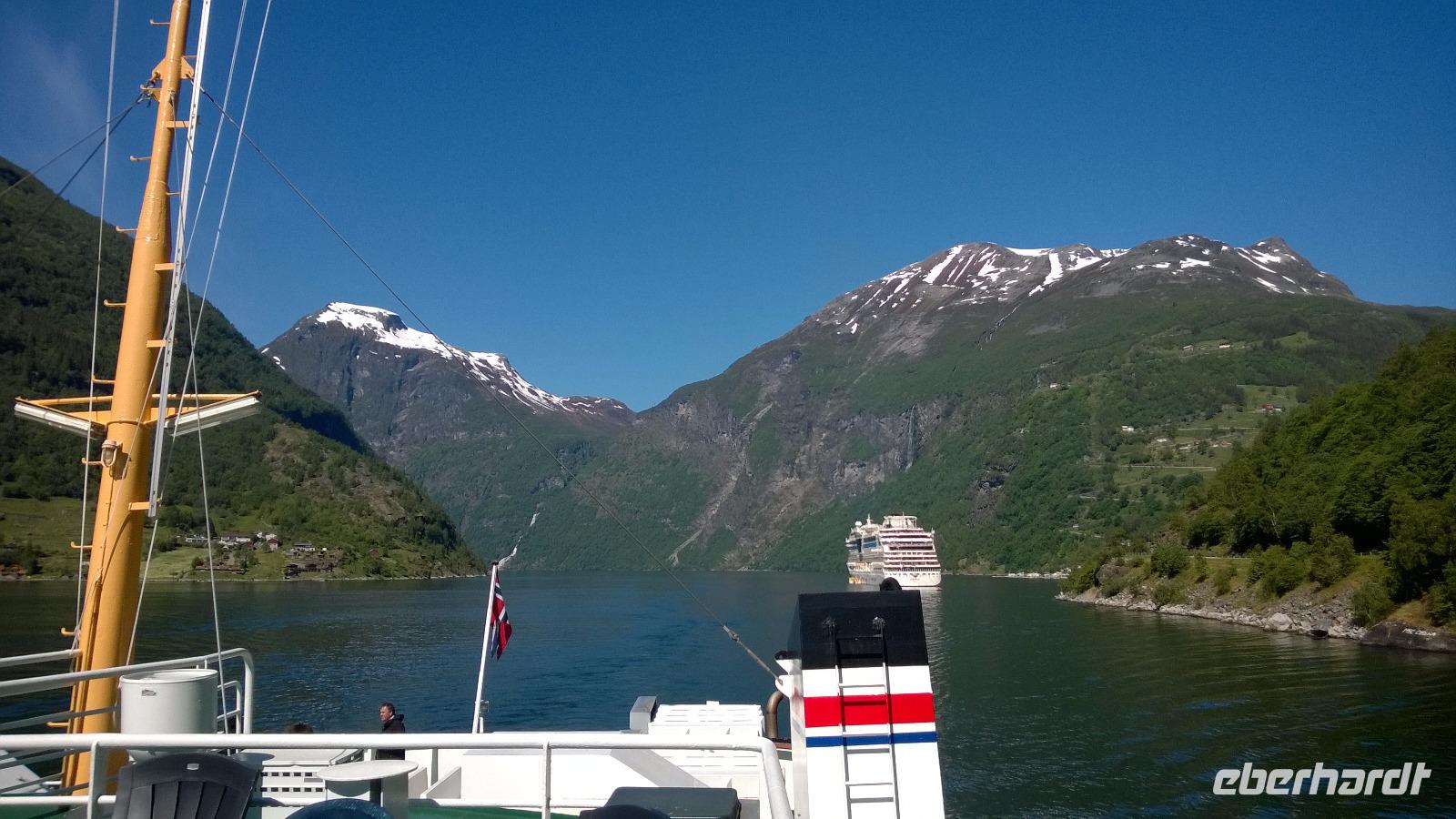 Bei dieser Reise folgt ein Höhepunkt auf den nächsten. Und so ist es heute der Geirangerfjord, welcher ganz besonders heraussticht. Wir machen eine kleine Kreuzfahrt über den Fjord, sehen, staunen, genießen. Das Wetter ist wiedermal super und verwöhnt uns mit Sonnenschein. In dem kleinen Ort Geiranger lässt es sich dann noch gut bummeln, bis wir schließlich weiterfahren auf die Dalsnibba. Oh, was für ein Blick! Es ist ja nicht so, dass wir bisher wenig gute Fotomotive gehabt hätten, aber das hier schlägt doch alles Dagewesene um Längen! Zwischen schneebedeckten Berggipfeln liegt unten, weit weit unten in der Tiefe, der Geiranger Fjord und auf ihm schippert ein Kreuzfahrer.