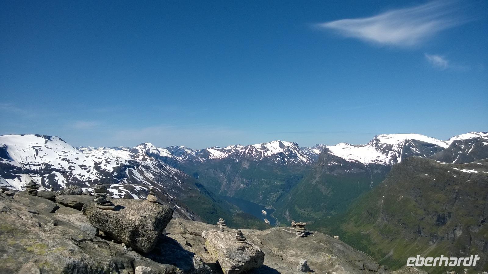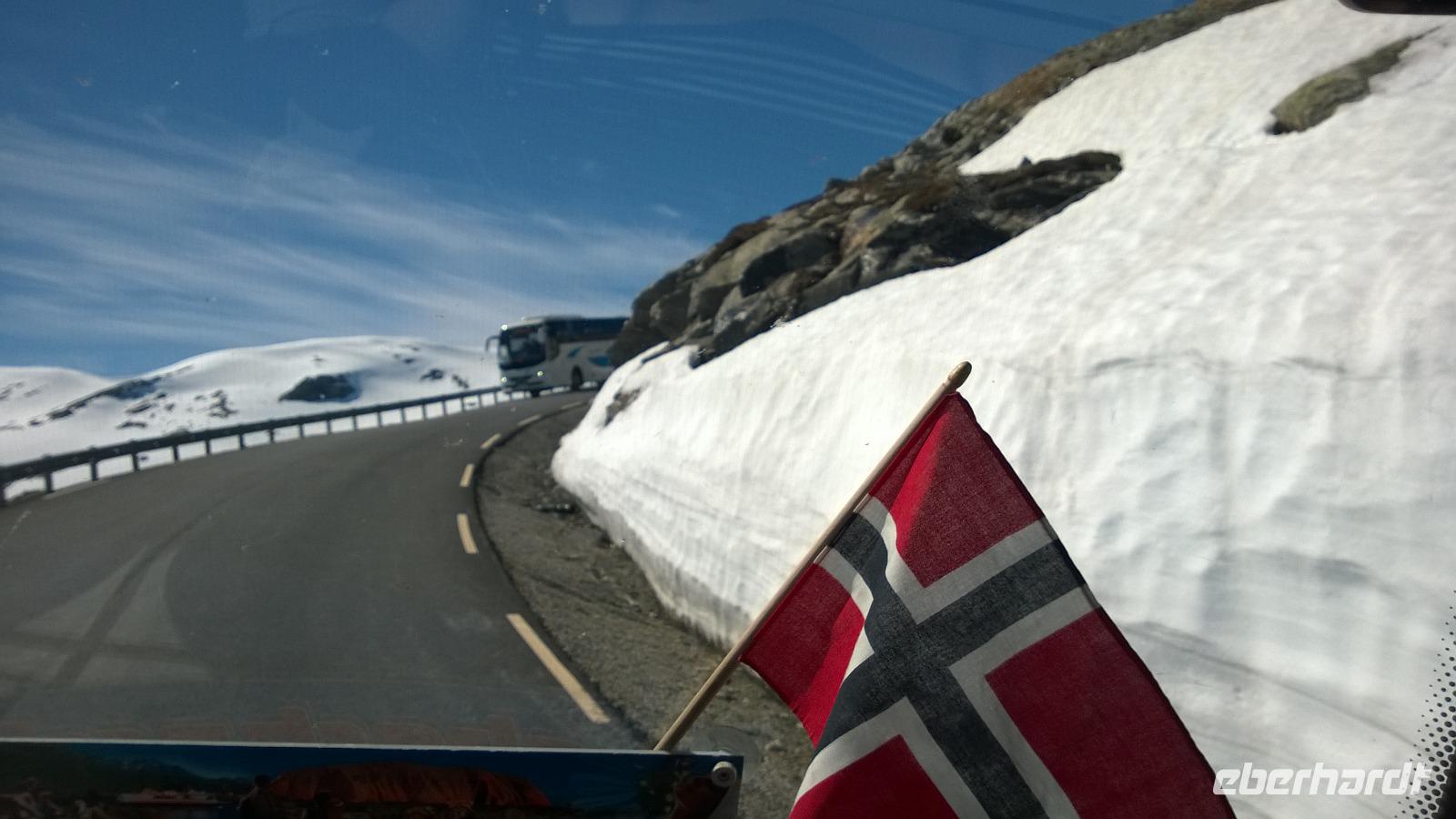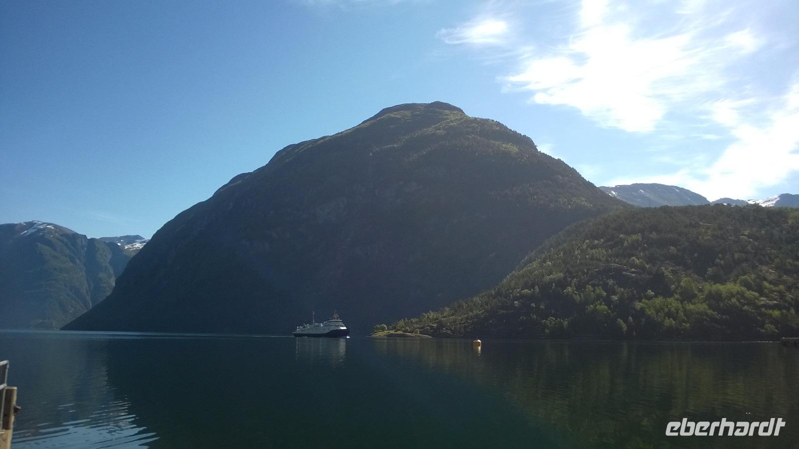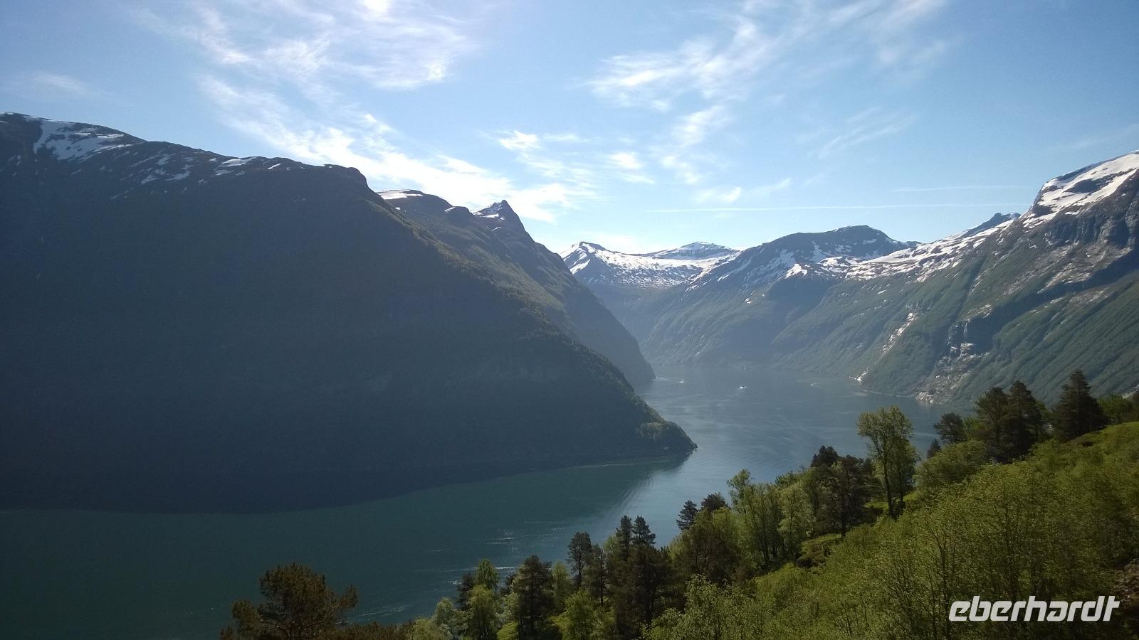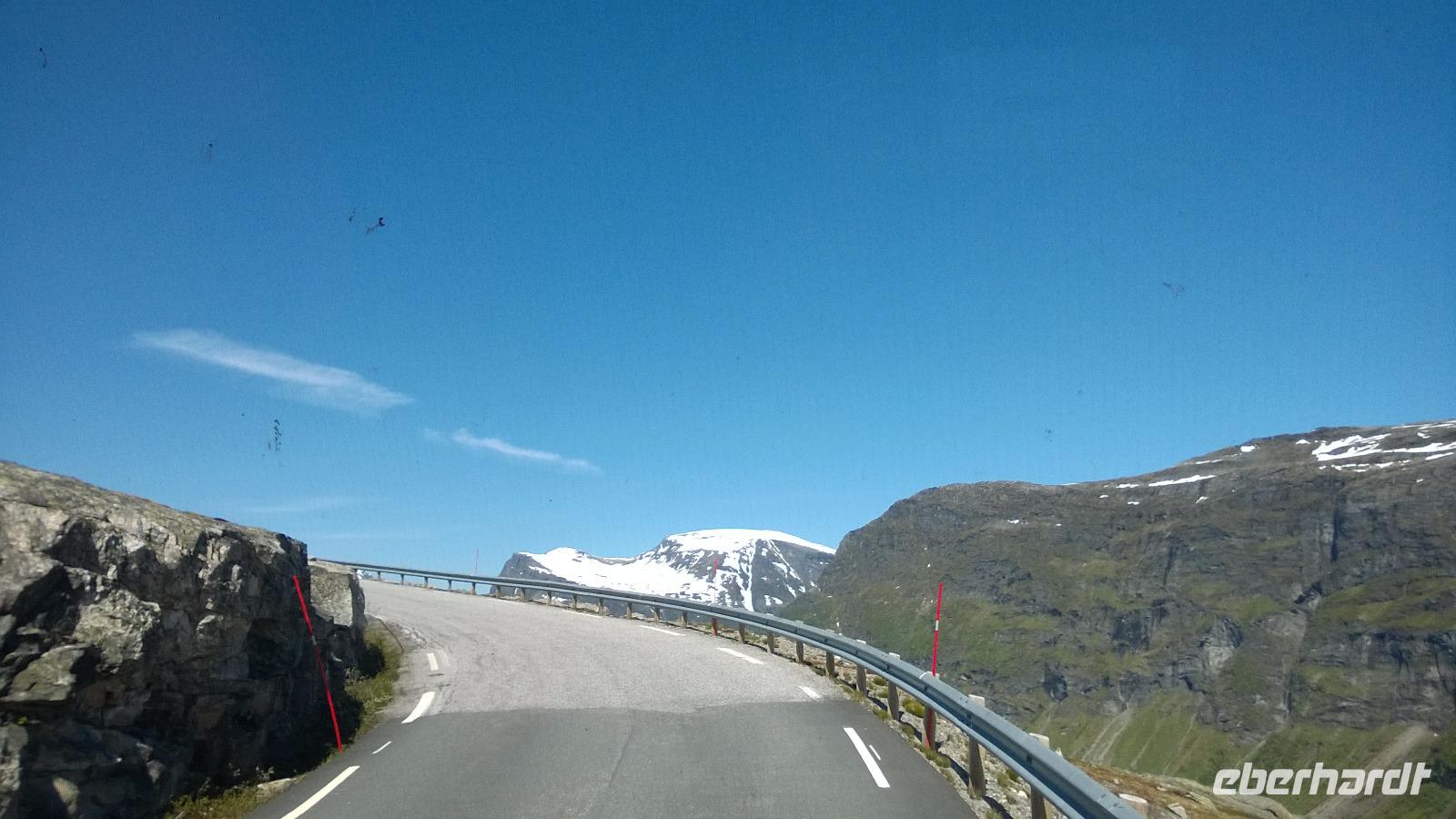 Bei dieser Reise folgt ein Höhepunkt auf den nächsten. Und so ist es heute der Geirangerfjord, welcher ganz besonders heraussticht. Wir machen eine kleine Kreuzfahrt über den Fjord, sehen, staunen, genießen. Das Wetter ist wiedermal super und verwöhnt uns mit Sonnenschein. In dem kleinen Ort Geiranger lässt es sich dann noch gut bummeln, bis wir schließlich weiterfahren auf die Dalsnibba. Oh, was für ein Blick! Es ist ja nicht so, dass wir bisher wenig gute Fotomotive gehabt hätten, aber das hier schlägt doch alles Dagewesene um Längen! Zwischen schneebedeckten Berggipfeln liegt unten, weit weit unten in der Tiefe, der Geiranger Fjord und auf ihm schippert ein Kreuzfahrer.