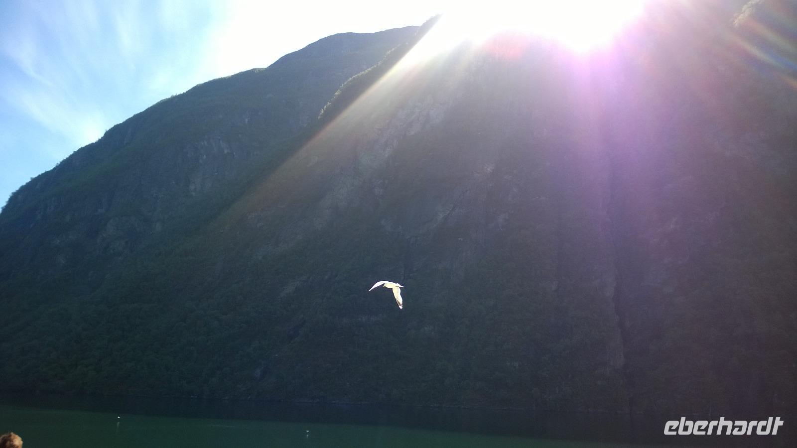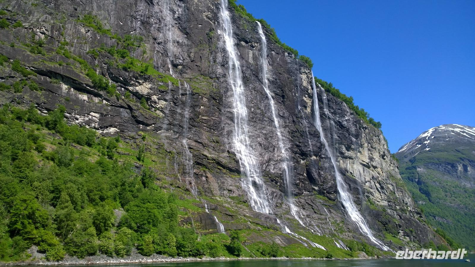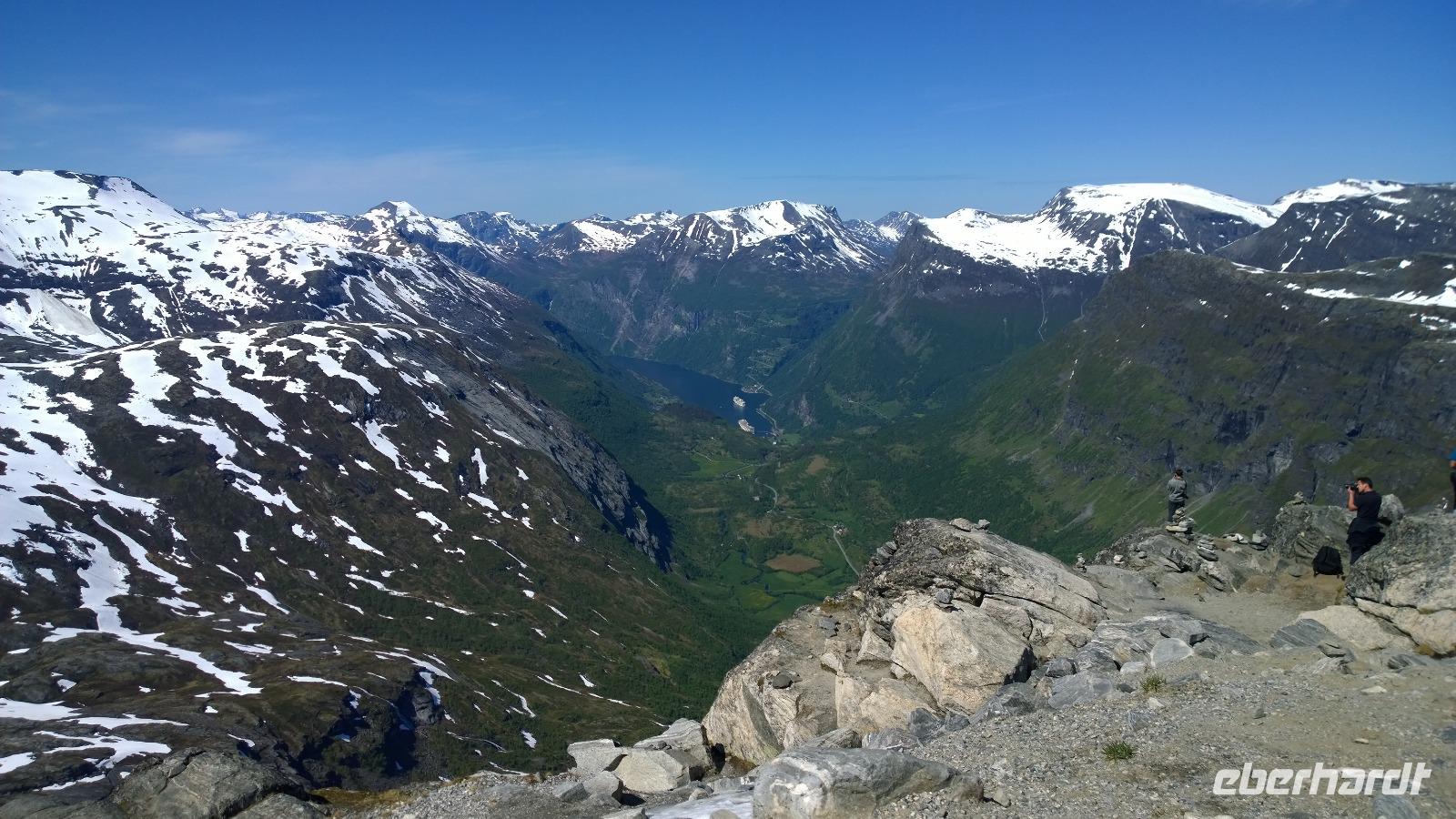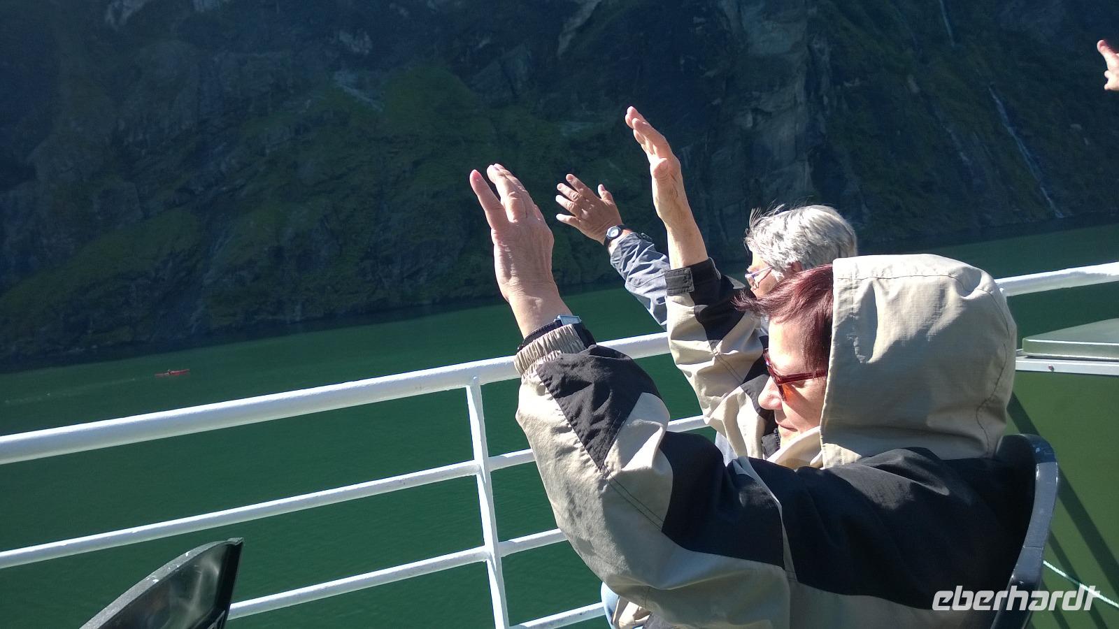 Bei dieser Reise folgt ein Höhepunkt auf den nächsten. Und so ist es heute der Geirangerfjord, welcher ganz besonders heraussticht. Wir machen eine kleine Kreuzfahrt über den Fjord, sehen, staunen, genießen. Das Wetter ist wiedermal super und verwöhnt uns mit Sonnenschein. In dem kleinen Ort Geiranger lässt es sich dann noch gut bummeln, bis wir schließlich weiterfahren auf die Dalsnibba. Oh, was für ein Blick! Es ist ja nicht so, dass wir bisher wenig gute Fotomotive gehabt hätten, aber das hier schlägt doch alles Dagewesene um Längen! Zwischen schneebedeckten Berggipfeln liegt unten, weit weit unten in der Tiefe, der Geiranger Fjord und auf ihm schippert ein Kreuzfahrer.