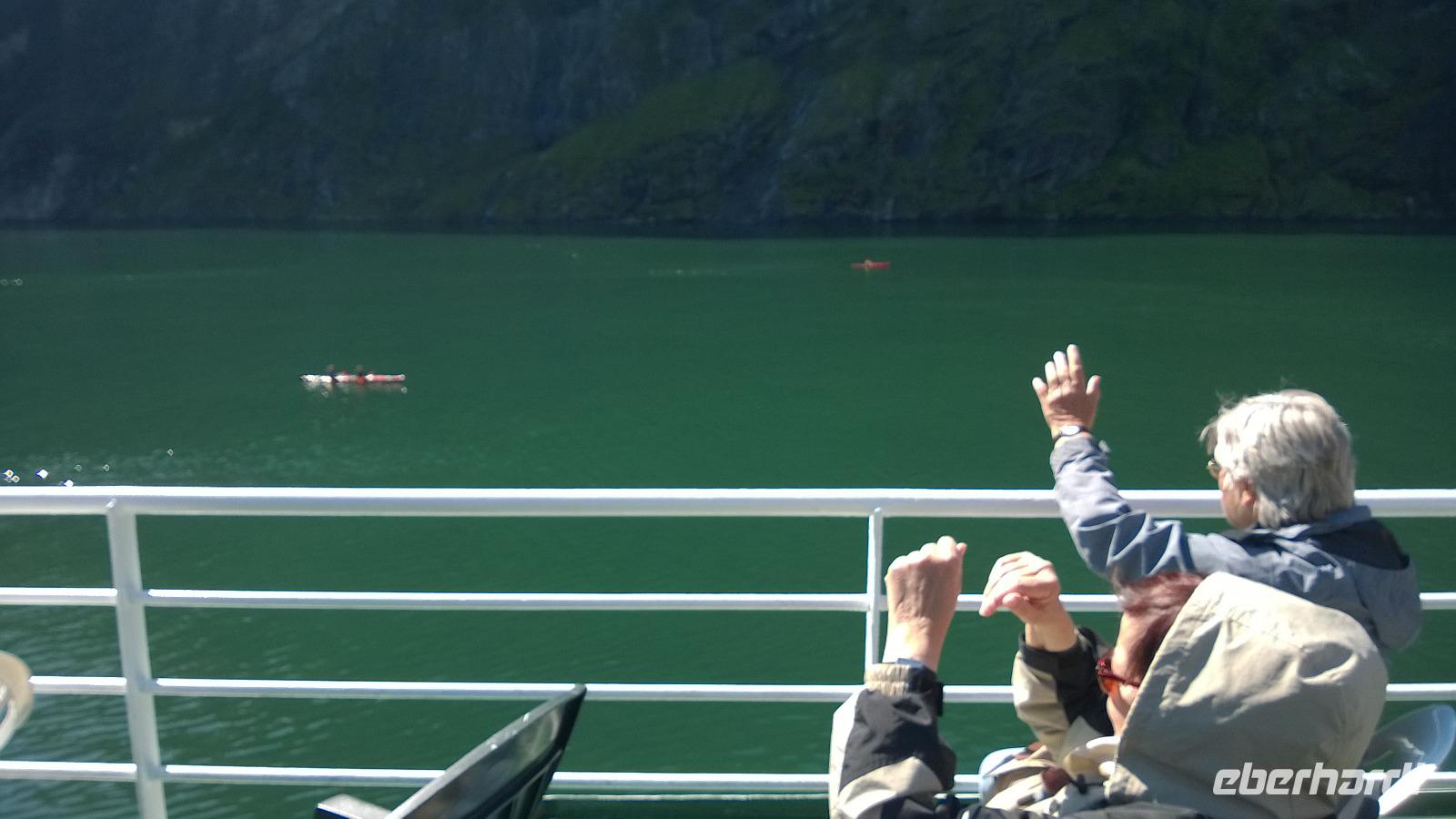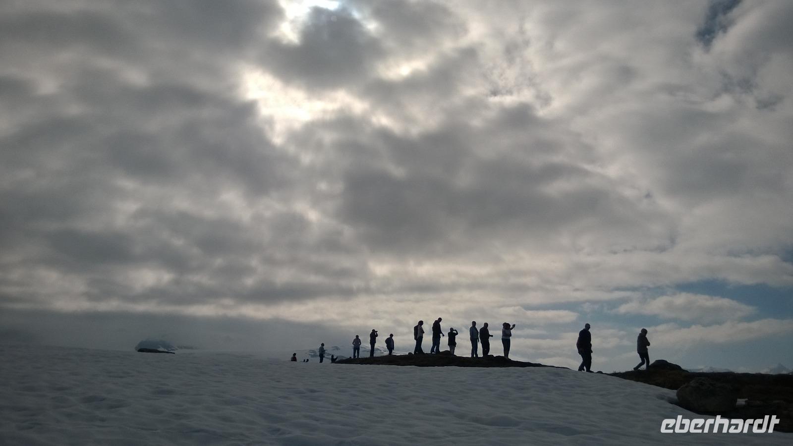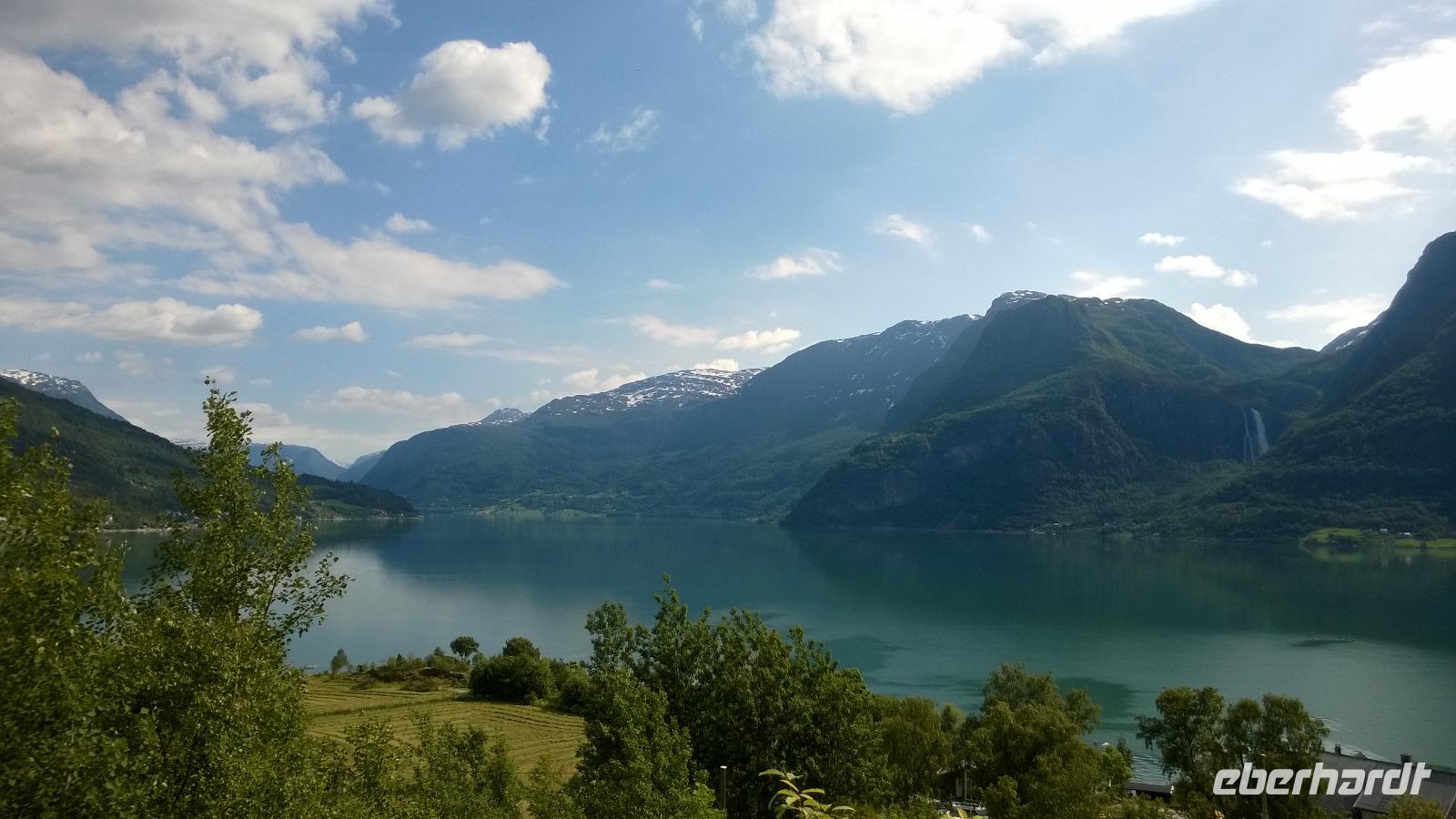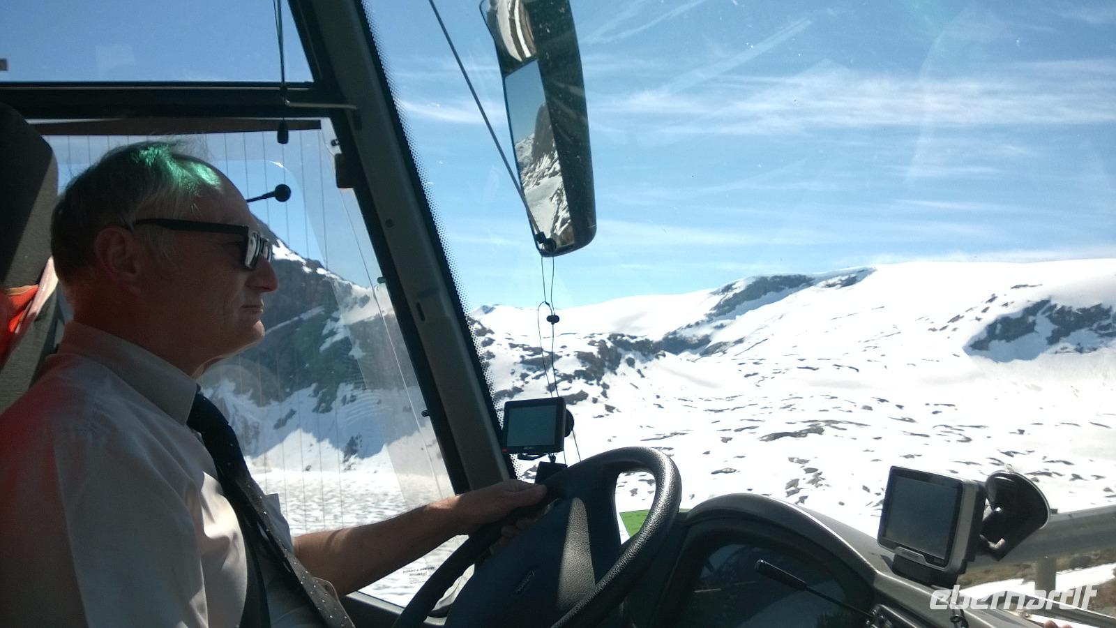 Bei dieser Reise folgt ein Höhepunkt auf den nächsten. Und so ist es heute der Geirangerfjord, welcher ganz besonders heraussticht. Wir machen eine kleine Kreuzfahrt über den Fjord, sehen, staunen, genießen. Das Wetter ist wiedermal super und verwöhnt uns mit Sonnenschein. In dem kleinen Ort Geiranger lässt es sich dann noch gut bummeln, bis wir schließlich weiterfahren auf die Dalsnibba. Oh, was für ein Blick! Es ist ja nicht so, dass wir bisher wenig gute Fotomotive gehabt hätten, aber das hier schlägt doch alles Dagewesene um Längen! Zwischen schneebedeckten Berggipfeln liegt unten, weit weit unten in der Tiefe, der Geiranger Fjord und auf ihm schippert ein Kreuzfahrer.