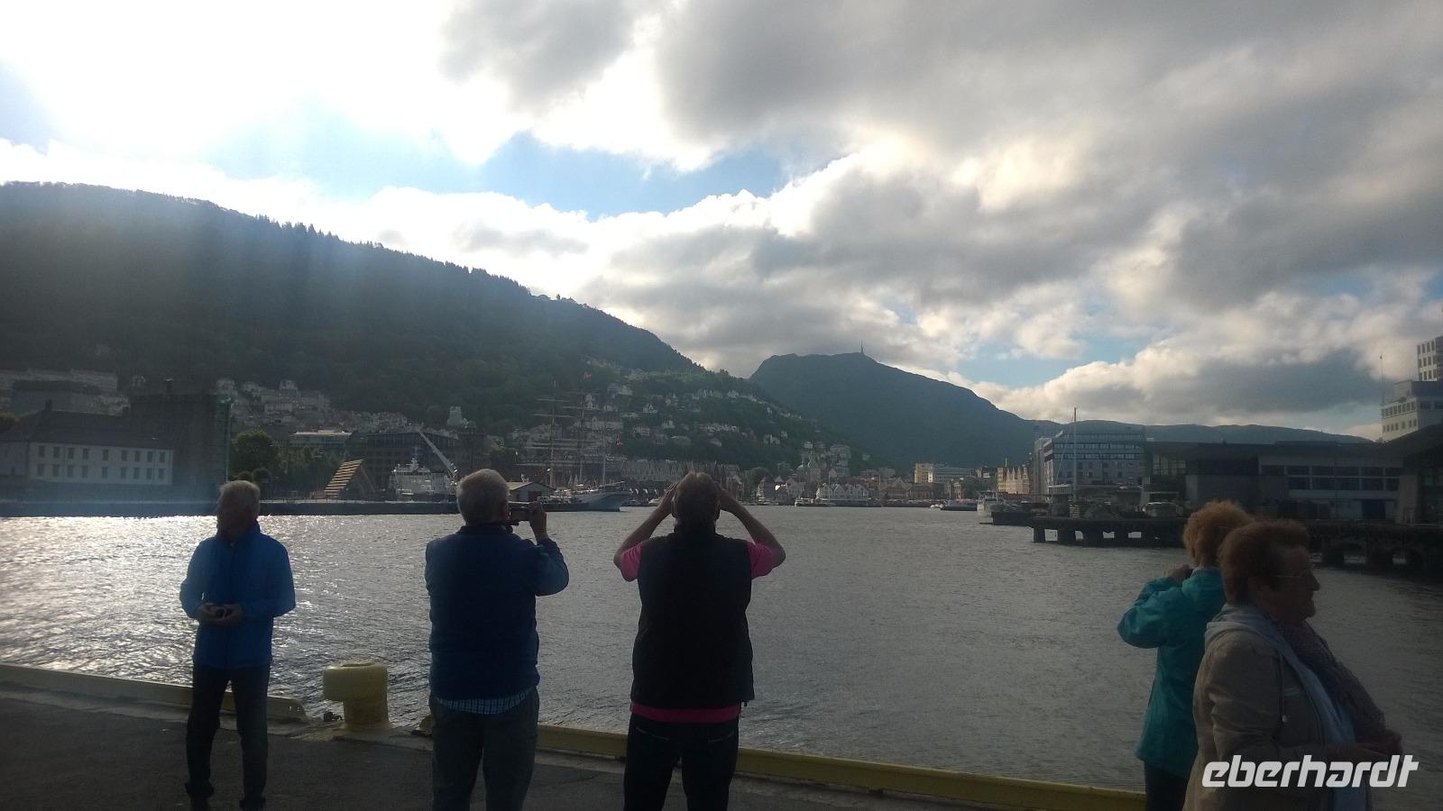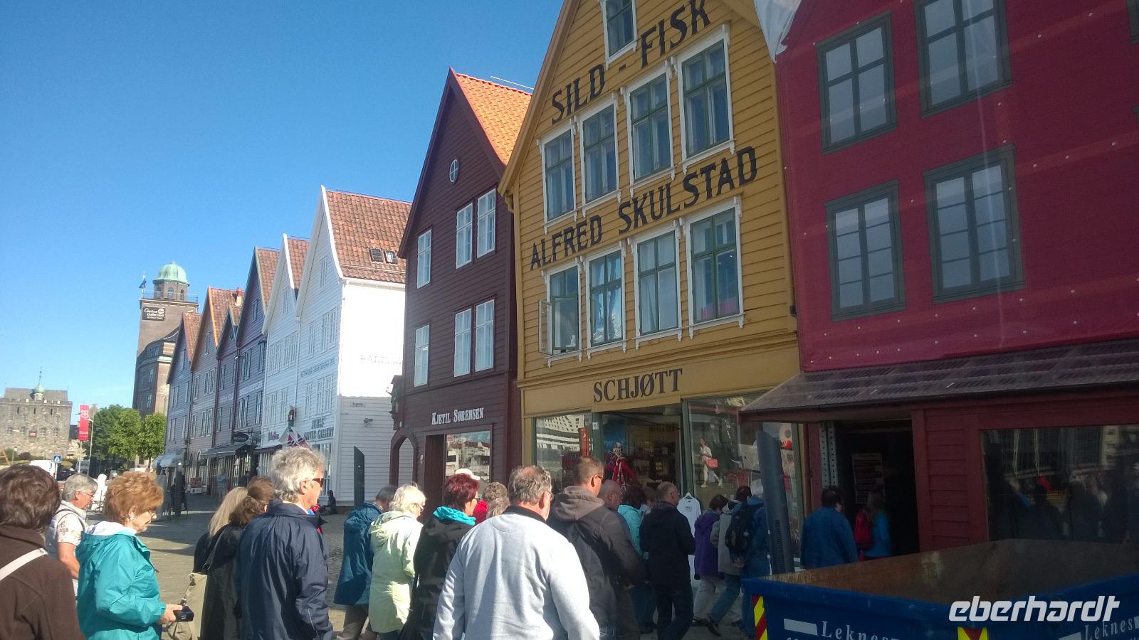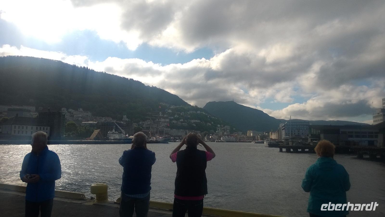 Bergen - diese Stadt, wo einst die Hanse ihr Kontor hatte, die muss man einfach erlebt haben. Ihr wird nachgesagt, dass sie über 200 Regentage im Jahr hat - also mehr als London. Was sind wir für Glückspilze, dass wir Sonne und blauen Himmel haben? Stadtführerin Susanne begleitet uns auf einer Stadtrundfahrt und hat allerlei Interessantes zu erzählen. Schließlich kann man noch ein Stündchen freie Zeit in der Altstadt, auf dem Fischmarkt oder aber auf dem Floyen, dem Hausberg der Stadt verleben.
