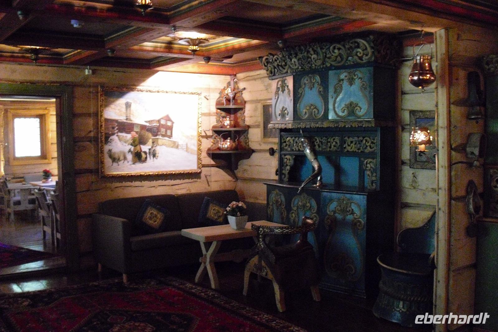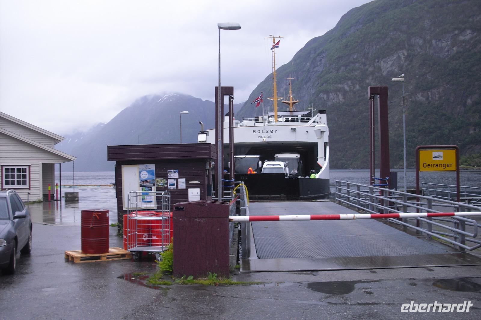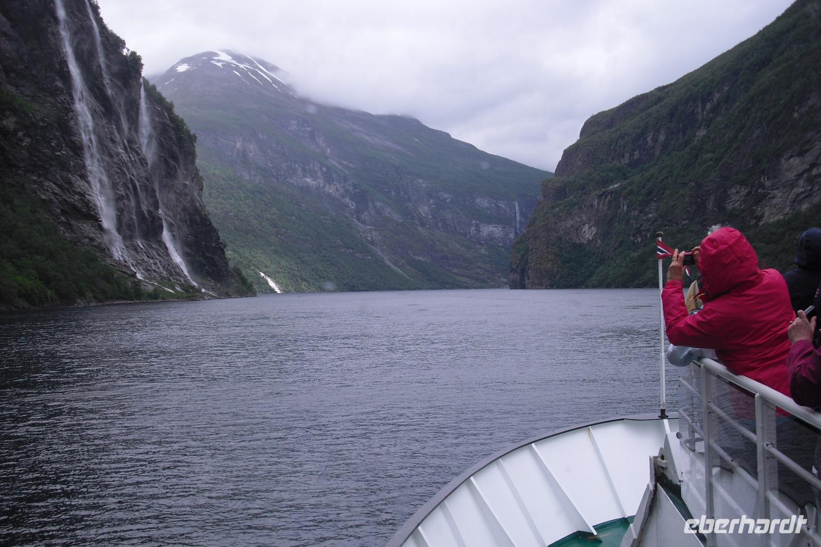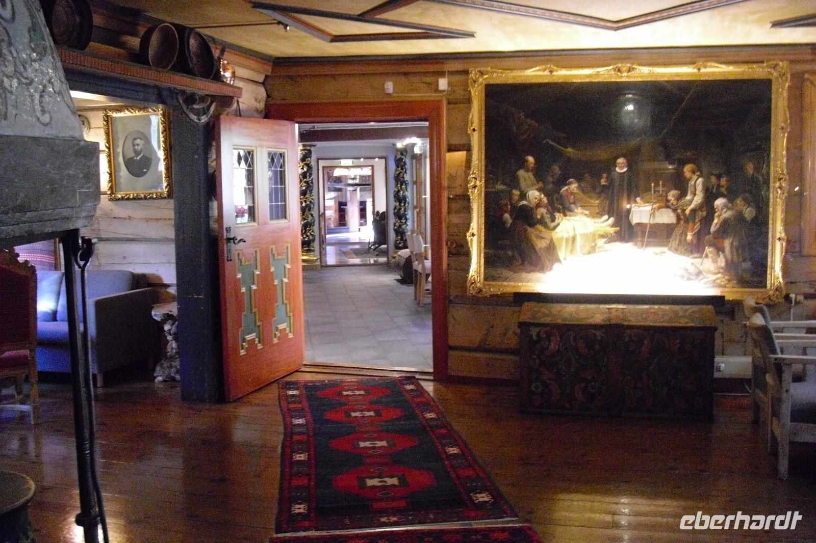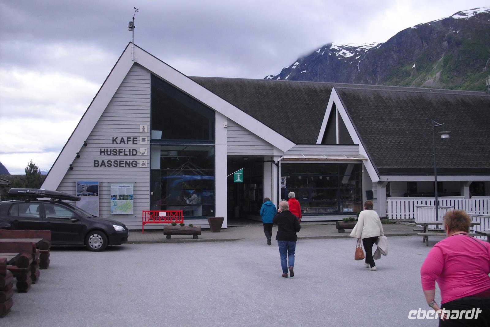 Wie täglich zuvor begann der Tag mit dem Frühstück. Dann verließen wir Alesund, setzten mit einer Fähre am Storfjorden über und erreichten Hellesylt. Von hier aus machten wir eine kleine Kreuzfahrt auf dem Geirangerfjord. Dieser Fjord ist so etwas wie eine Perle unter den Fjorden Norwegens. Nicht zuletzt deshalb wurde dieser Meeresarm von der UNESCO in die Liste des Weltkulturerbes aufgenommen. Aus Lautsprechern wurde mehrsprachig(auch deutsch) erläutert, wie die tosenden Wasserfälle heissen, wie die Bauern früher auf den einsam anmutenden Höfen an steilen Hängen lebten und so war es doch sehr kurzweilig. Angekommen in Geiranger bot sich in dem kleinen, aber quirligen Touristenort ein Aufenthalt an. Unsere Weiterfahrt brachte uns nach Lom. Dieser Ort erhielt den Status eines Nationalparkdorfes und gilt als Tor zu den Nationalparks Jotunheimen, Reinheimen und Breheimen. Hier besuchten wir eine für Norwegen charakteristische Stabkirche. Der deutschsprechende Lars führte uns um die und in der Kirche. Er erläuterte sehr gut die Geschichte der Kirche und ihre besondere Bauweise. Kennzeichnend für Stabkirchen, die in der Regel aus dem 12. Jh. stammen, sind die senkrecht stehenden Holzstäbe auf denen die Dachkonstruktion lagert. Bei Blockbauten liegt das Holz weitgehend horizontal. Gut ließ sich das von außen erkennen. Von Lom starteten wir zum nächsten Übernachtungsort, dem Elveseter-Hotel. Wir nächtigten in norwegischer Geschichte, wir wohnten wie in einem Museum, wir verbrachten den Abend und die Nacht in einem ganz besonderen Flair - wow. Trotzdem gab es natürlich ein Abendessen und morgens ein Frühstück.