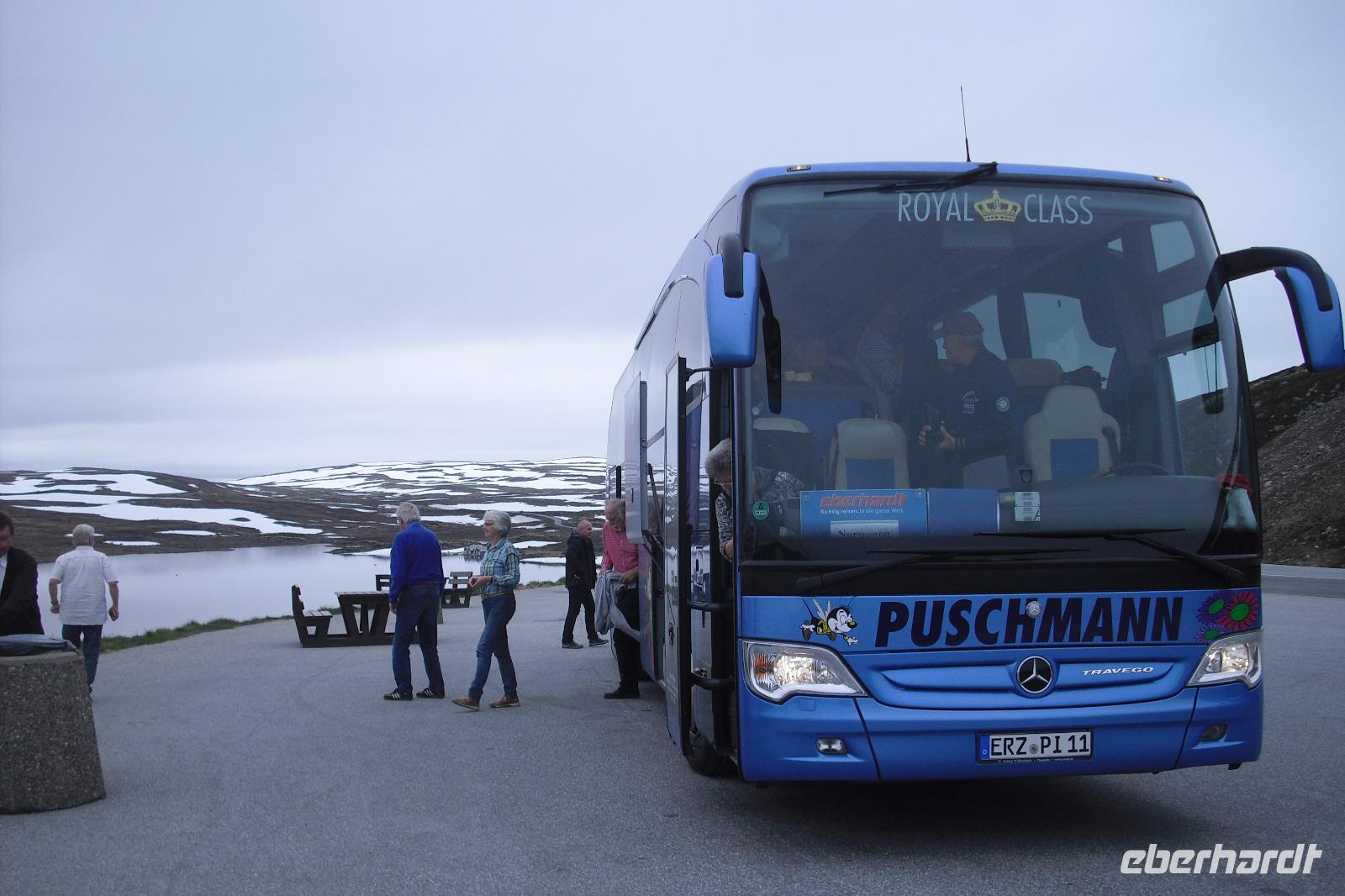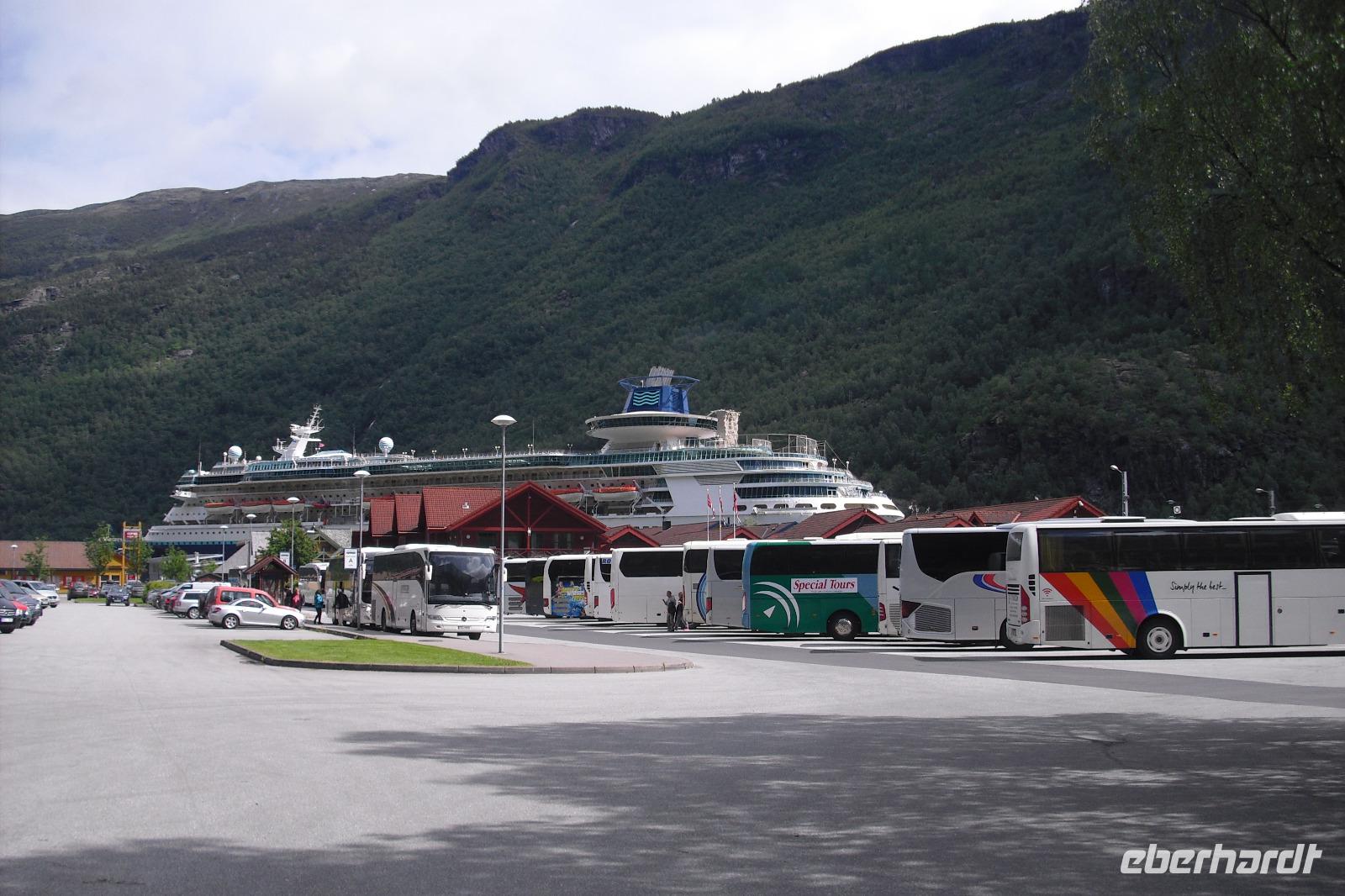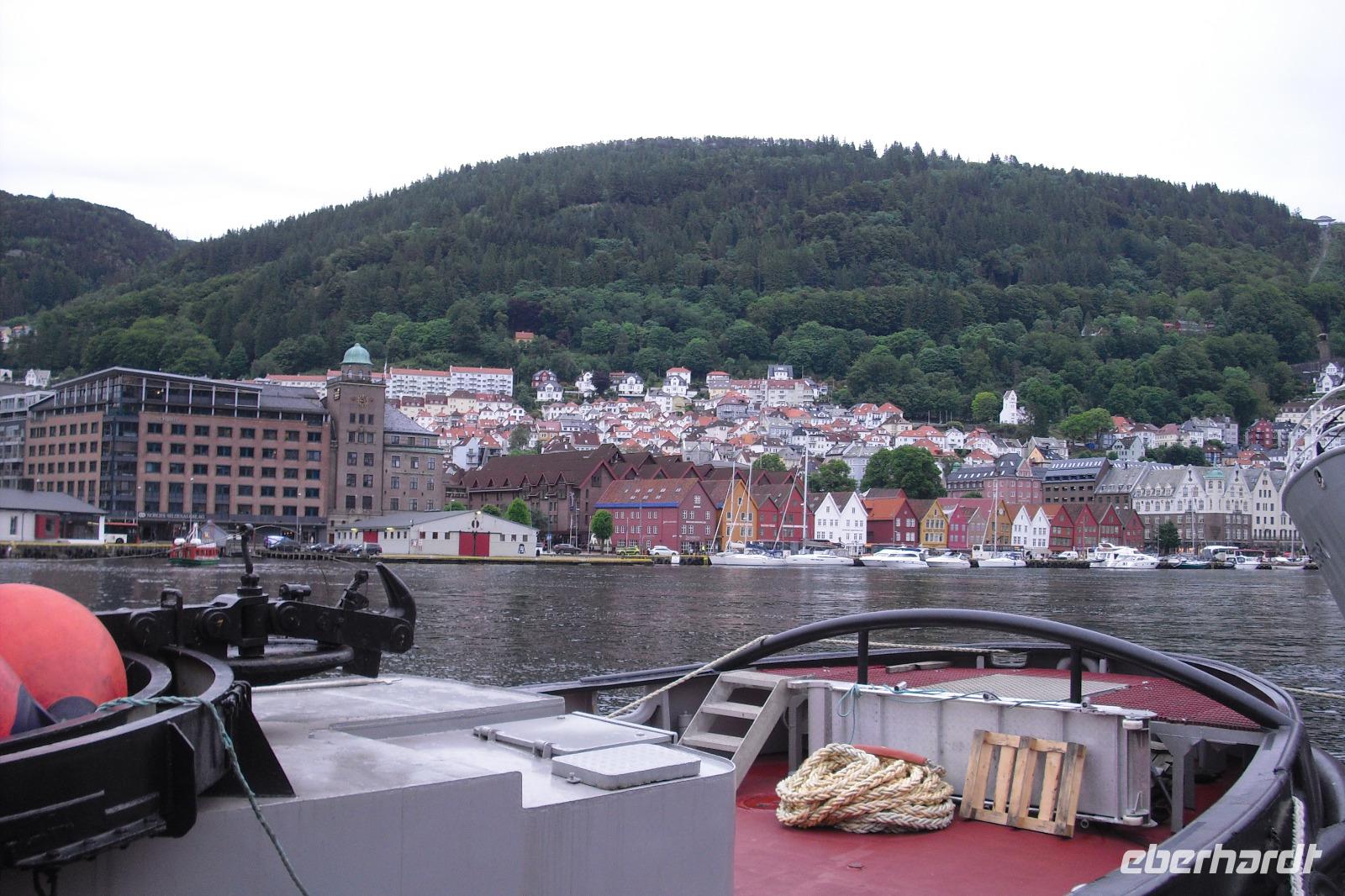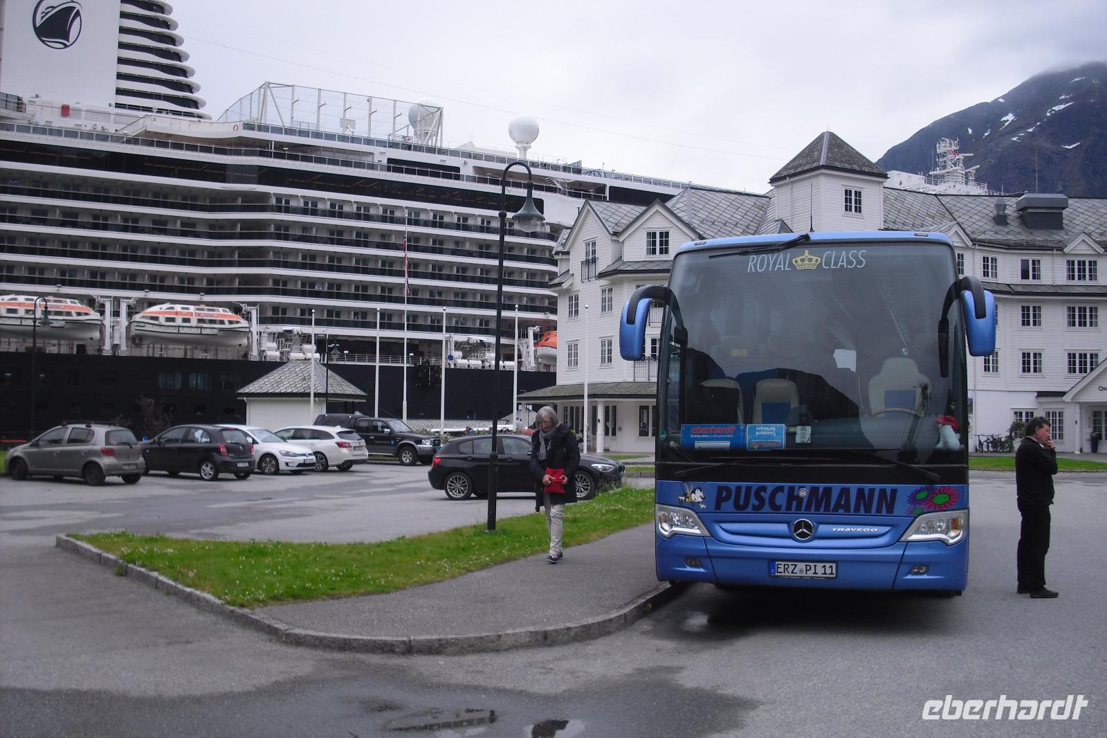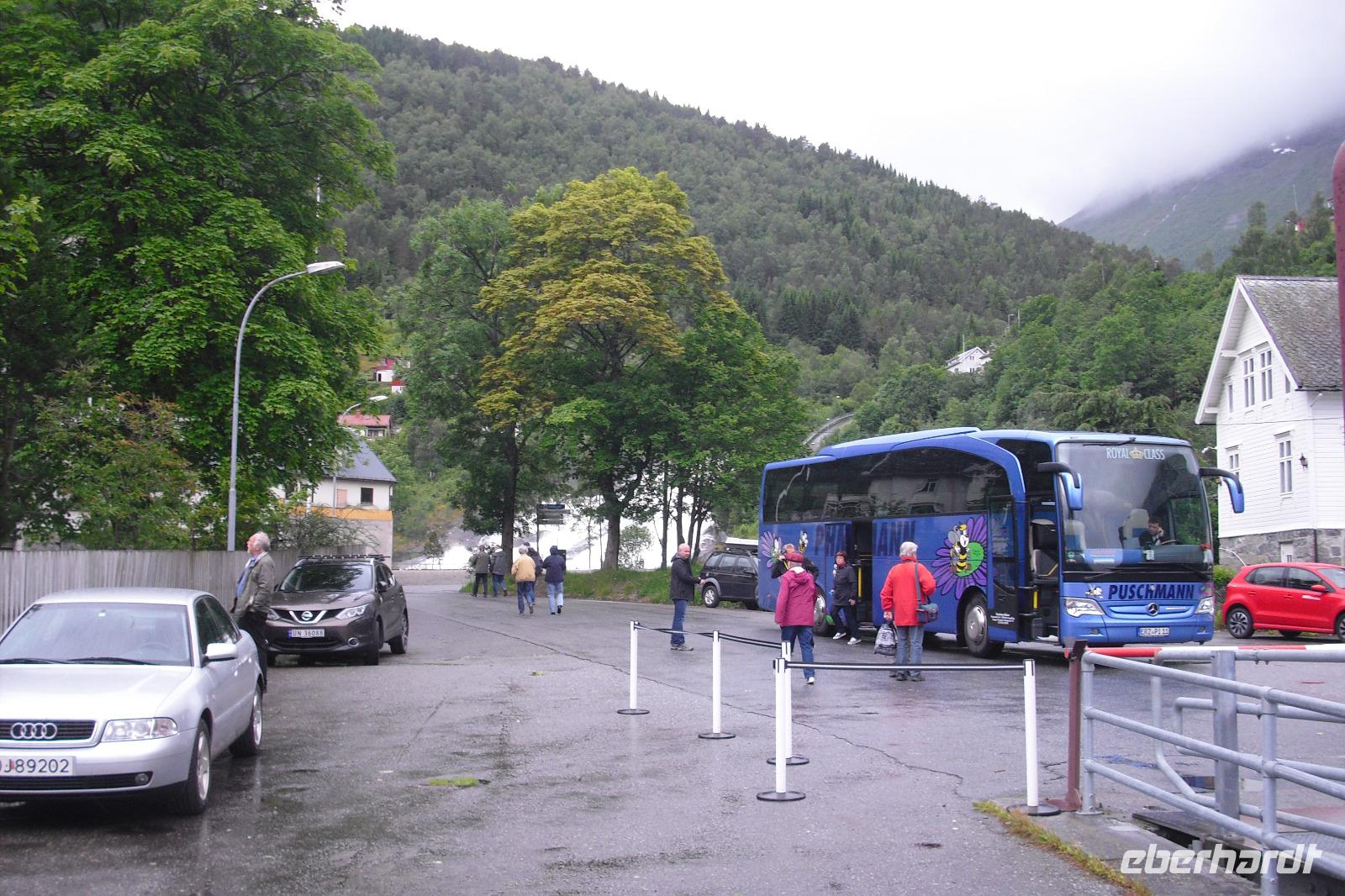 Ein herrlicher sommerlicher Sonnenschein begrüßte uns an diesem Morgen schon vor dem Frühstück. Einige Reisegäste nutzten das zu einer kleinen "Fotosafari" durch die Hotelanlage und deren Umgebung. Schnell sollte sich die Jahreszeit von den Außenbedingungen ändern. Schon beim zweiten Fotostopp sahen wir Skilangläufer auf geschlossener Schneedecke bei nur plus 1 Grad Celsius - wow. Das war nicht zu erwarten, jedoch Realität. In Skjolden am Lustrafjord legten wir eine Servicepause ein und verstärkten den wie ausgestorbenen wirkenden Ort für eine halbe Stunde um 45 "Einwohner". Mit der Fähre den Ardalsfjord überquerend erreichten wir Laerdal und Aurland. Nun ging es zur Mittagspause zu einem weiteren spektakulären Aussichtspunkt - dem Stegastein. Fantastische Blicke und Eindrücke von der Aussichtsplattform in 650 m über NN hatten wir in Richtung Aurlandsfjord - wow. Einen nächsten Stopp legten wir ein in Flam. Es lag wieder ein Kreuzfahrtschiff vor Ort und es war ganz schön Betrieb. Hier kamen auch Eisenbahnfans zu ihrem Recht, denn wir waren an einer Endstation der berühmten Flam-Bahn. In weniger als einer Stunde erklimmt die Bahn 866 Höhenmeter zur Bergstation in Myrdal und das durch ein landschaftlich äußerst reizvolles Gebiet. Mit einem Stopp am Tvinnefossen, einem weiteren der vielen norwegischen eindruckvollen Wasserfällen, unterbrachen wir die Fahrt nach Bergen. In Bergen wartete das Hotel für die nächste Übernachtung und mit der Stadt selbst ein Kleinod Norwegens. Nach dem Abendessen sind viele Reisegäste noch in das nahe Zentrum aufgebrochen.