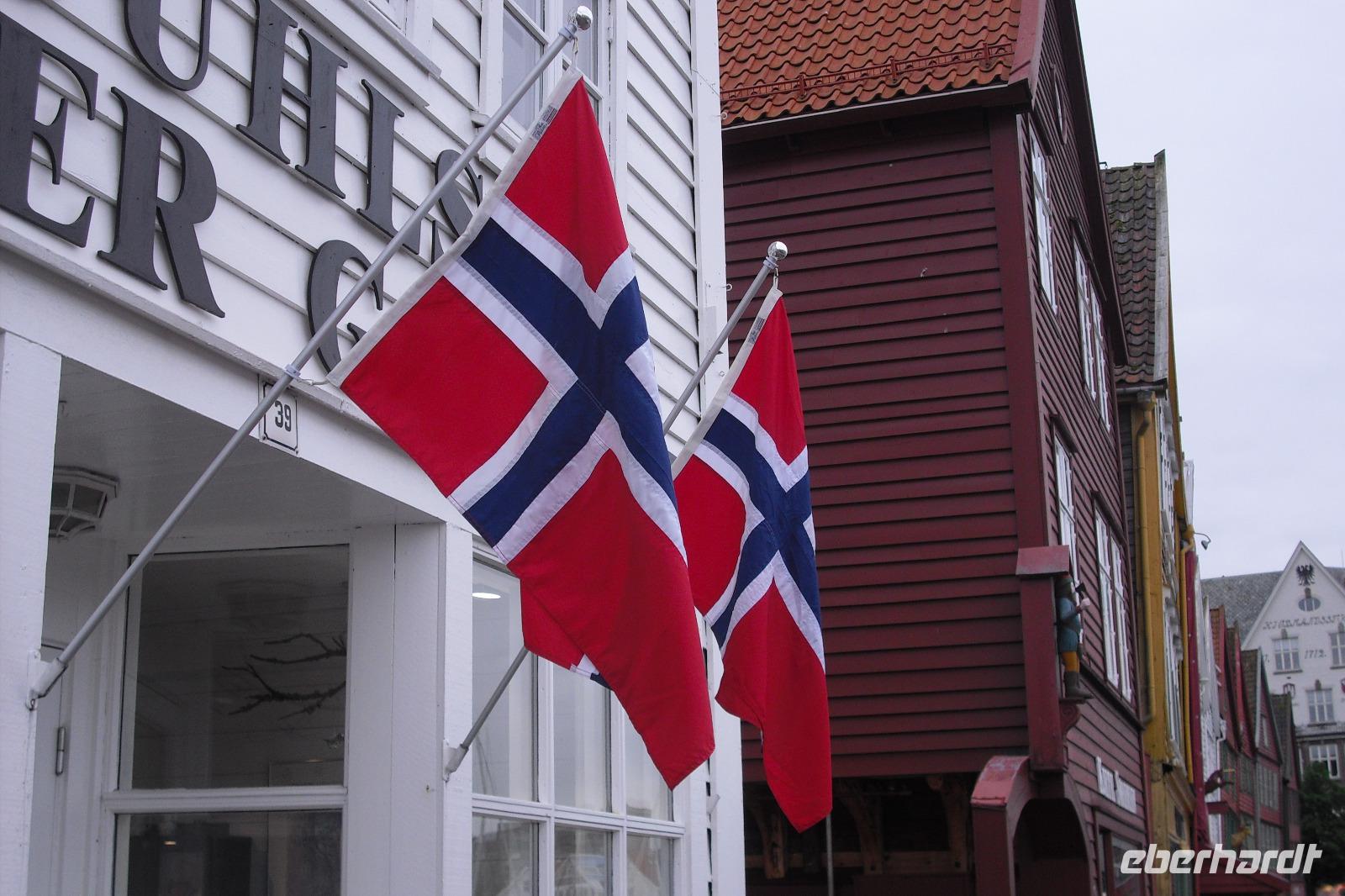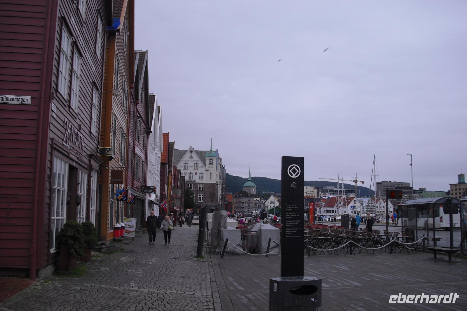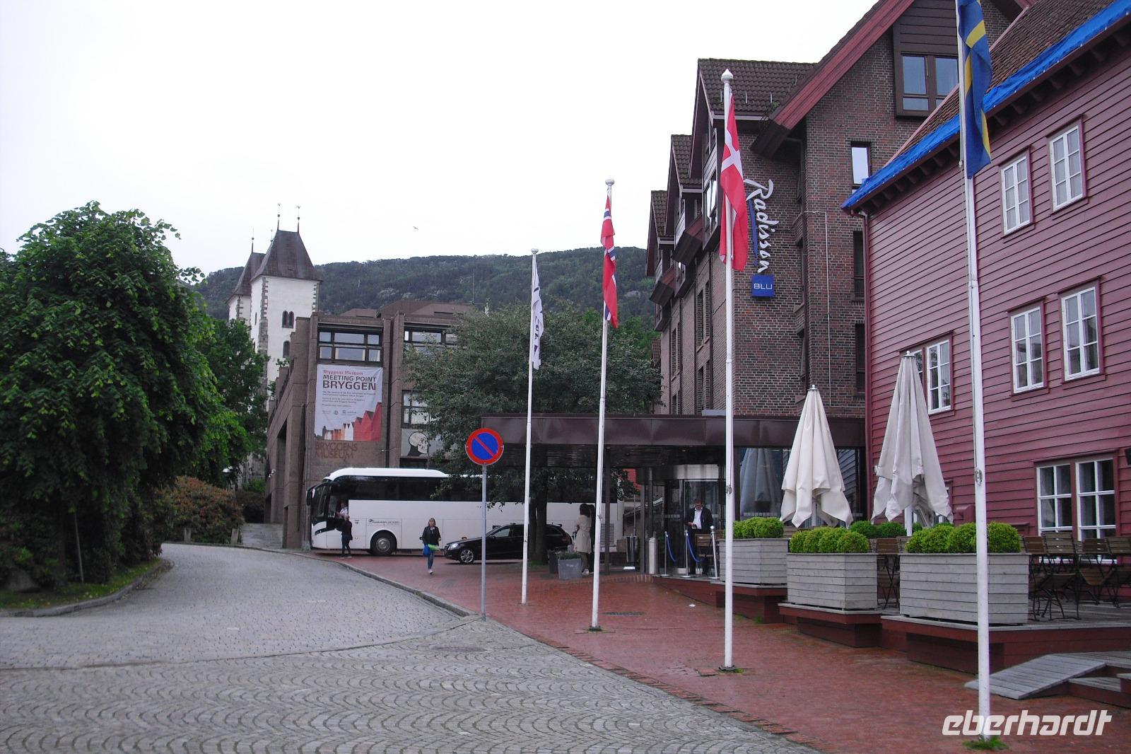 Pünktlich zum vereinbarten Zeitpunkt erwartete uns nach dem Frühstück unser Stadtführer für Bergen, nämlich Martin, vor dem Hotel. Er sollte sich als Perle örtlicher Stadtführer herausstellen - wow. Bergen allein hat schon Charme und er unterstrich das mit seinen exellenten, detaillierten Ausführungen während der Stadtrundfahrt bzw. des Stadtrundganges. Bergen wurde 1070 von König Olav Kyrres gegründet und wurde im 13. Jh. erste Reichshauptstadt von Norwegen. Die Stadt wurde schnell ein großer Handels- und Schifffahrtsplatz und gehörte zu den wichtigen Handelsplätzen der hanseatischen Kaufleute. Davon zeugt heute noch das ebenfalls zum UNESCO-Weltkulturerbe gehörende Bryggen, Bergens älteste Besiedlung. Immer wieder von verheerenden Bränden vernichtet, steht es heute als täglich genutztes historisches Kulturdenkmal entlang des Hafenbeckens und gerade wieder sind fachgemäße Restaurierungsarbeiten im Gange. Mit seinen etwa 280 000 Einwohnern ist Bergen heute eine Stadt mit Universität, Industrie, Fischerei, Handwerk, Erdöl- und Erdgasproduktion sowie Tourismus. Das ganze eingebettet in (mehr als) sieben Berge. Wegen Sperrungen durch eine Tagesbaustelle waren wir zur pünktlichen Abfahrt aus Bergen angehalten. So fuhren wir den ersten Teil der Strecke auf gleicher Straße, wie bei der gestrigen Anfahrt. In Bruravik überquerten wir einen Arm des Hardangerfjords über die Hardangerbrücke und legten eine Pause in Eidfjord ein. Auch hier überraschte uns wieder ein Kreuzfahrtschiff. Mit einer Pause am Vöringsfossen, einem Fotostopp Hardangervidda und einer Pause in Geilo gelangten wir nach Noresund. Hier erwartete man uns mit dem Abendessen und den Betten für die müden Häupter. Das Hotel war wunderschön eingebettet in die Landschaft des Hallingtals. Eine letzte Übernachtung für alle Reisegäste in Norwegen in aufgehobener Atmosphäre.