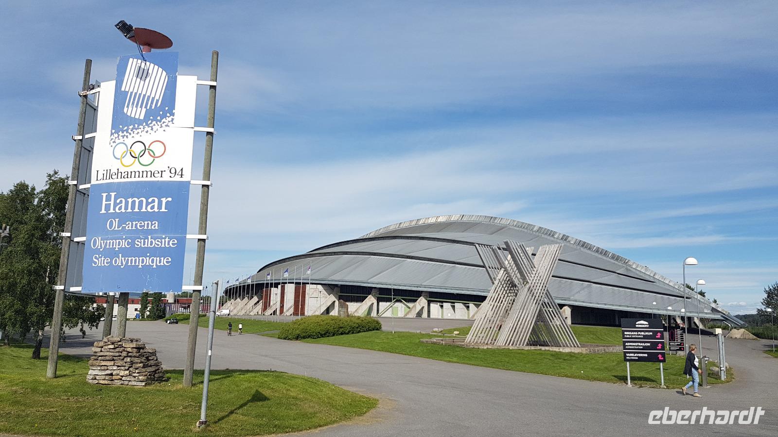 Norwegen begrüßt uns mit Sonnenschein auf der Fahrt zu unserem ersten Fotostop am Wikingerschiff in Hamar, der Eissporthalle der Olympischen Winterspiele 1994.