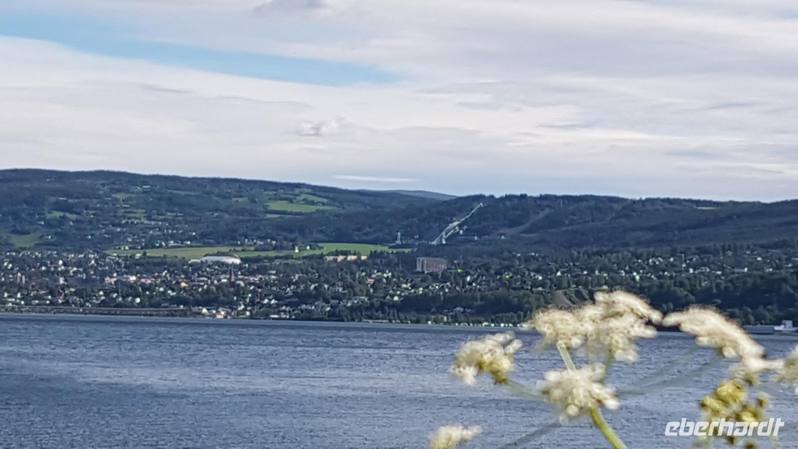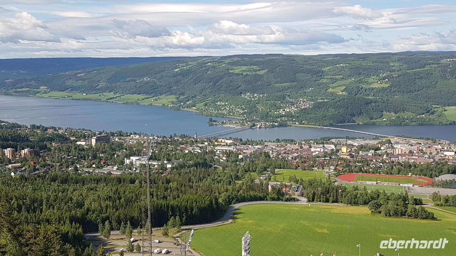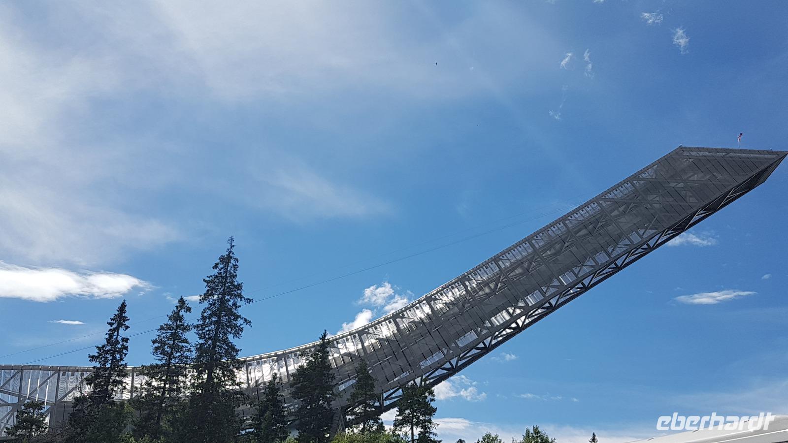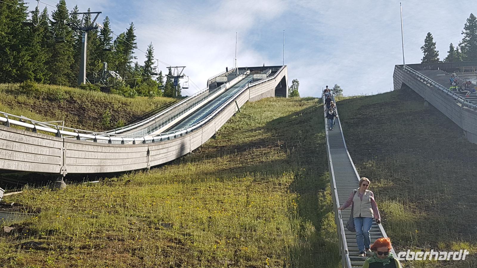 Von der Schanzenanlage „Lysgardsbakken" haben wir einen guten Blick zurück auf den See und die Olympiastadt Lillehammer. Gemeinsam laufen wir die Stufen an den Schanzen bis ganz nach unten und können dabei auch mal auf den Turm und somit aus der Perspektive der Springer die Schanze hinunter schauen. Am nächsten Tag werden wir dafür mit Muskelkater in den Beinen belohnt. -lach- Einige junge Springer sind auf der kleineren Schanze, aber der Wind ist zu heftig und ein Sprung zu gefährlich. Unten entdeckt Maria noch einige deutsche Weltklassespringer, die sicher hier ihr Wissen an den Nachwuchs geben.