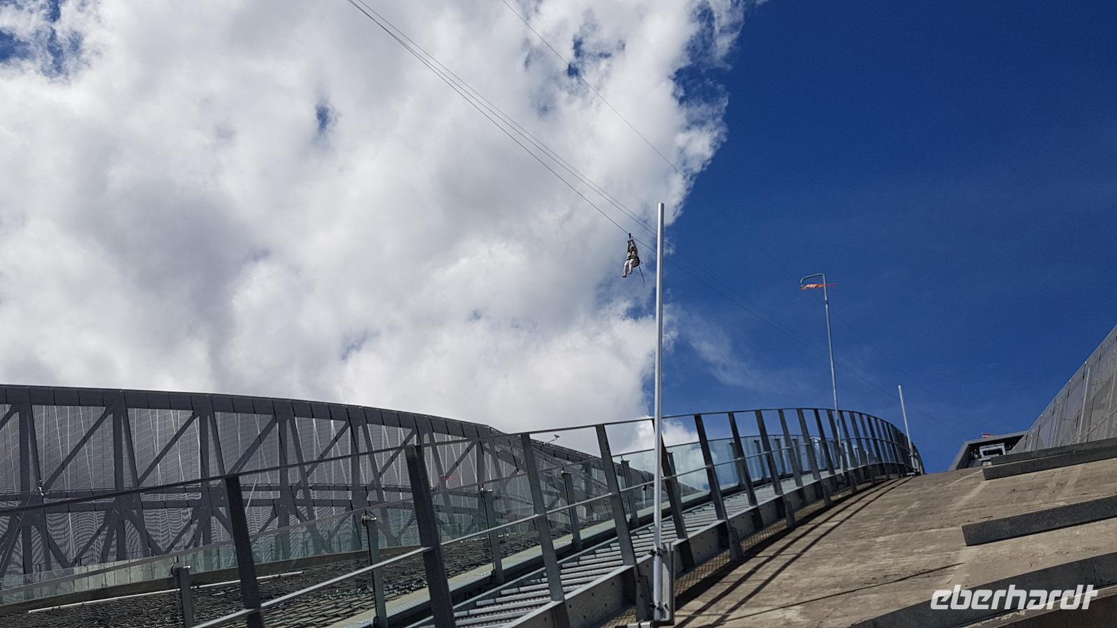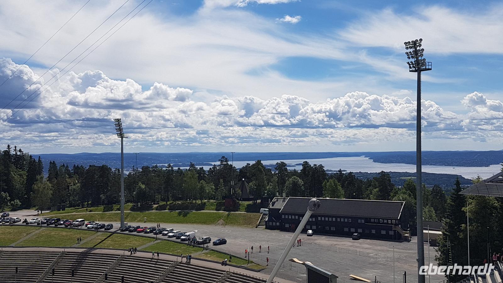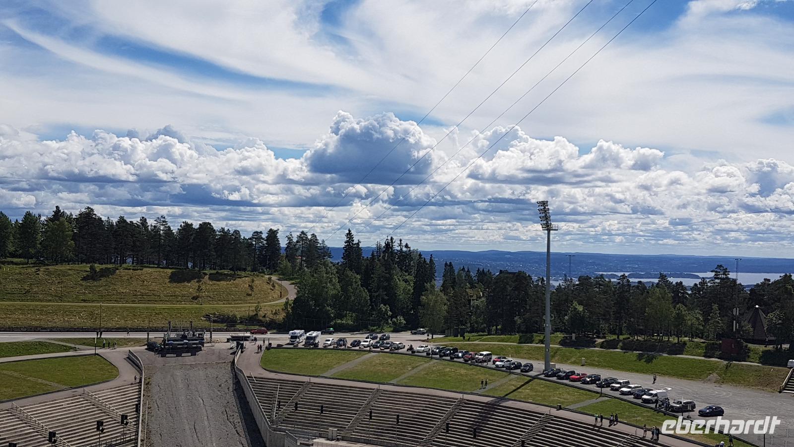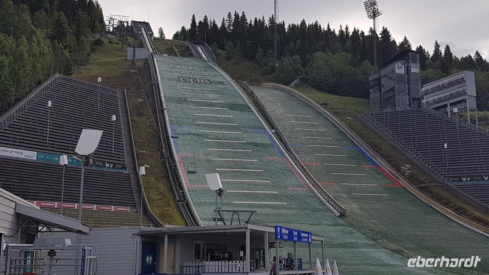 Von der Schanzenanlage „Lysgardsbakken" haben wir einen guten Blick zurück auf den See und die Olympiastadt Lillehammer. Gemeinsam laufen wir die Stufen an den Schanzen bis ganz nach unten und können dabei auch mal auf den Turm und somit aus der Perspektive der Springer die Schanze hinunter schauen. Am nächsten Tag werden wir dafür mit Muskelkater in den Beinen belohnt. -lach- Einige junge Springer sind auf der kleineren Schanze, aber der Wind ist zu heftig und ein Sprung zu gefährlich. Unten entdeckt Maria noch einige deutsche Weltklassespringer, die sicher hier ihr Wissen an den Nachwuchs geben.