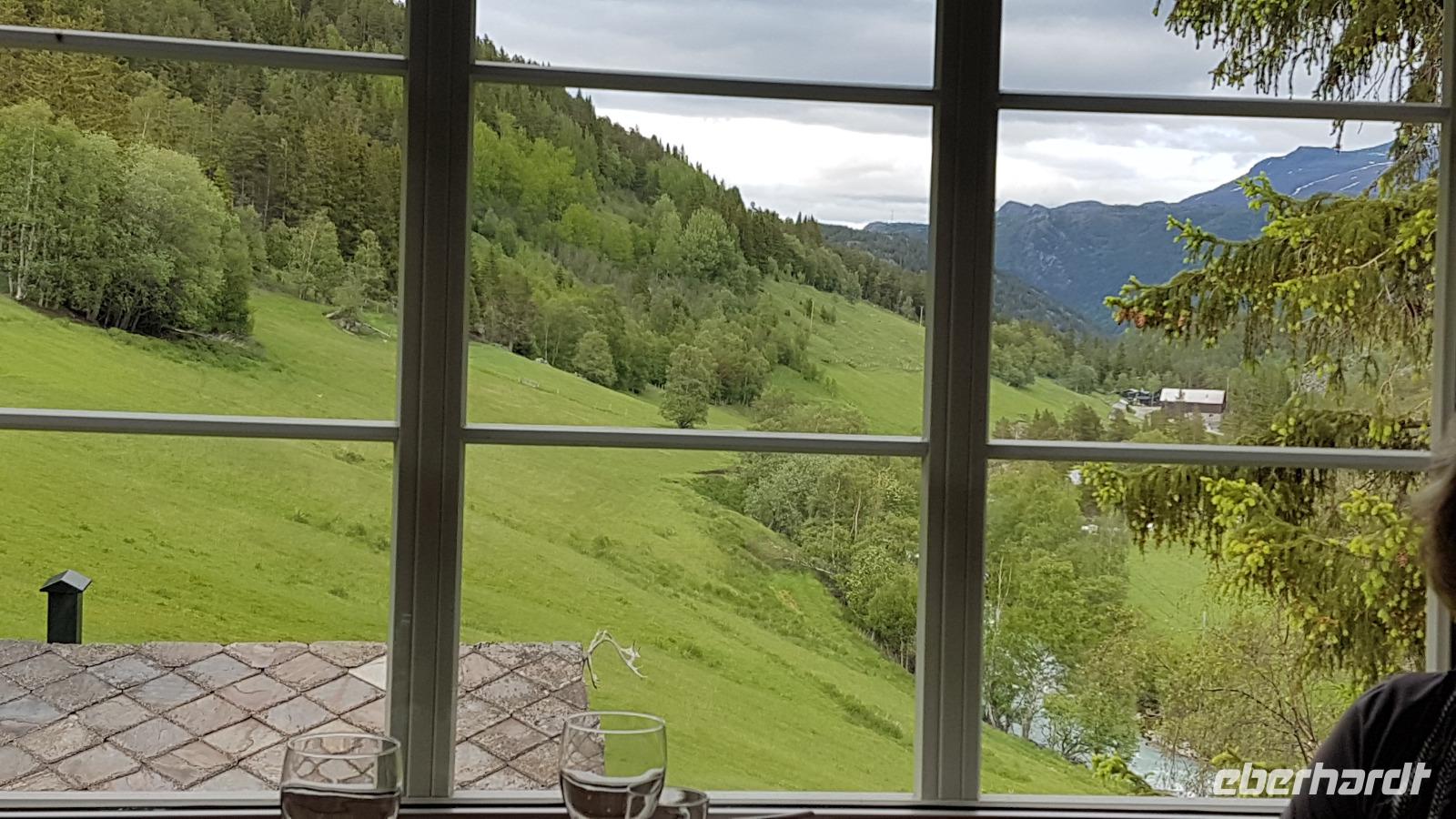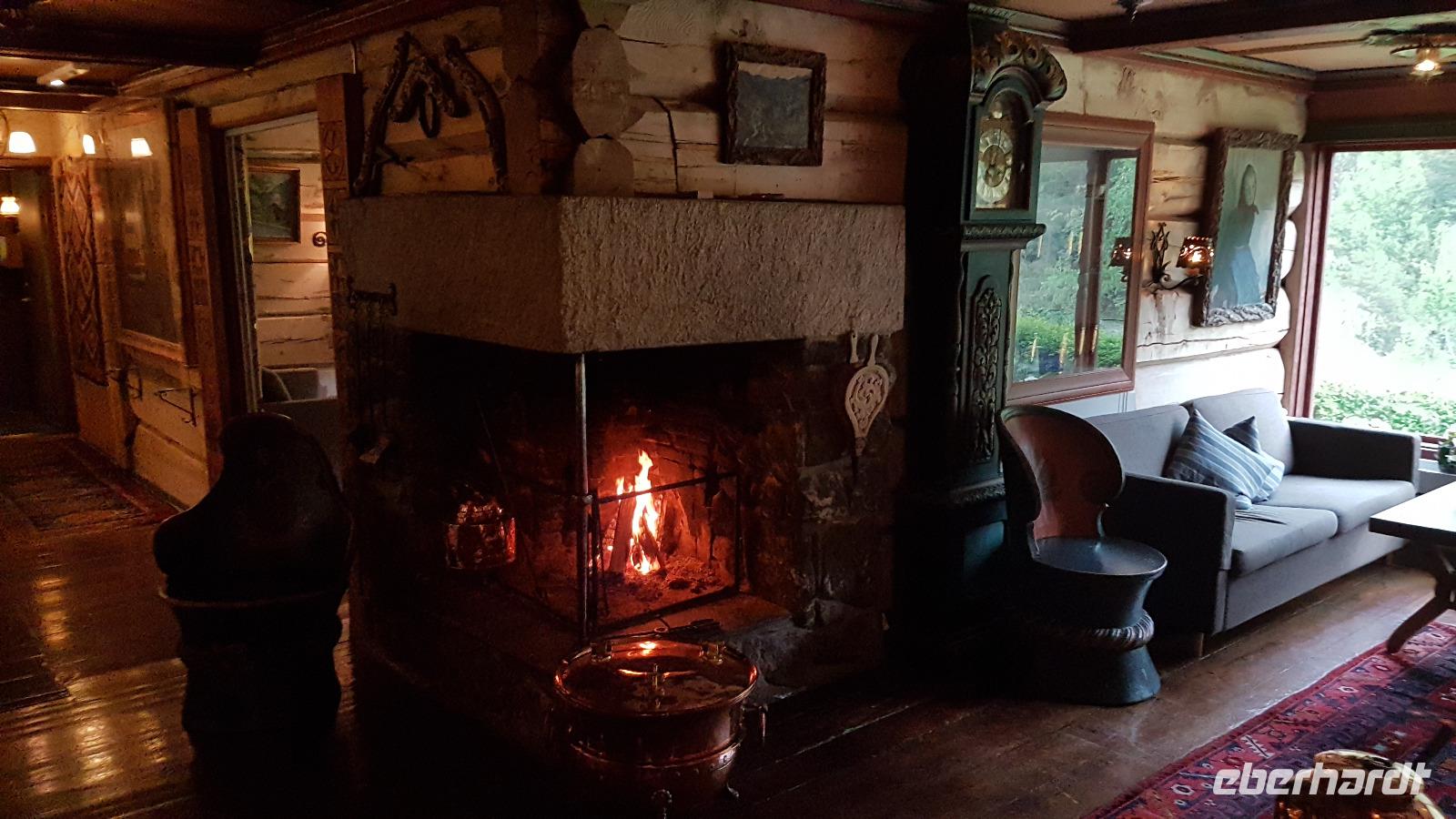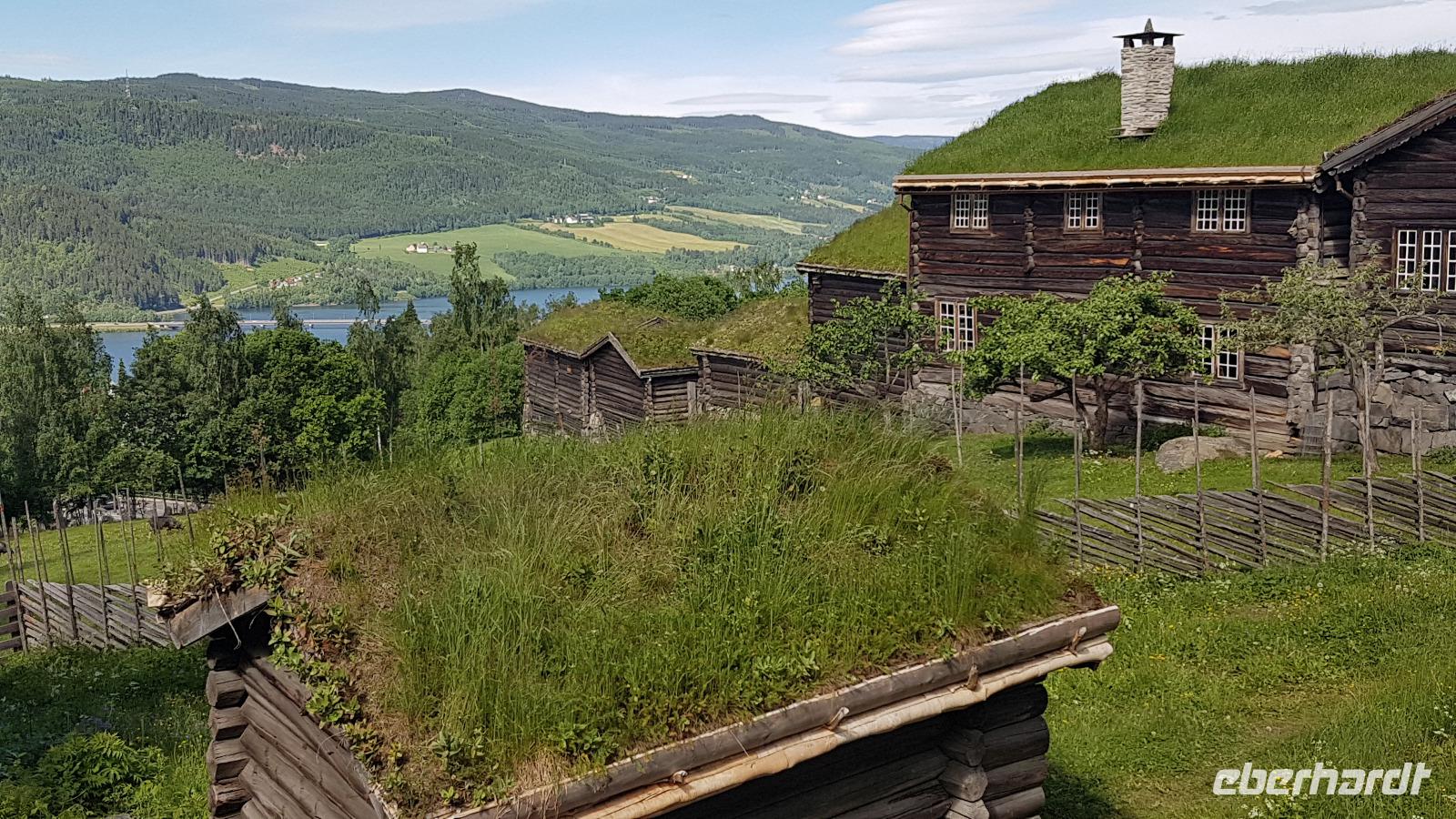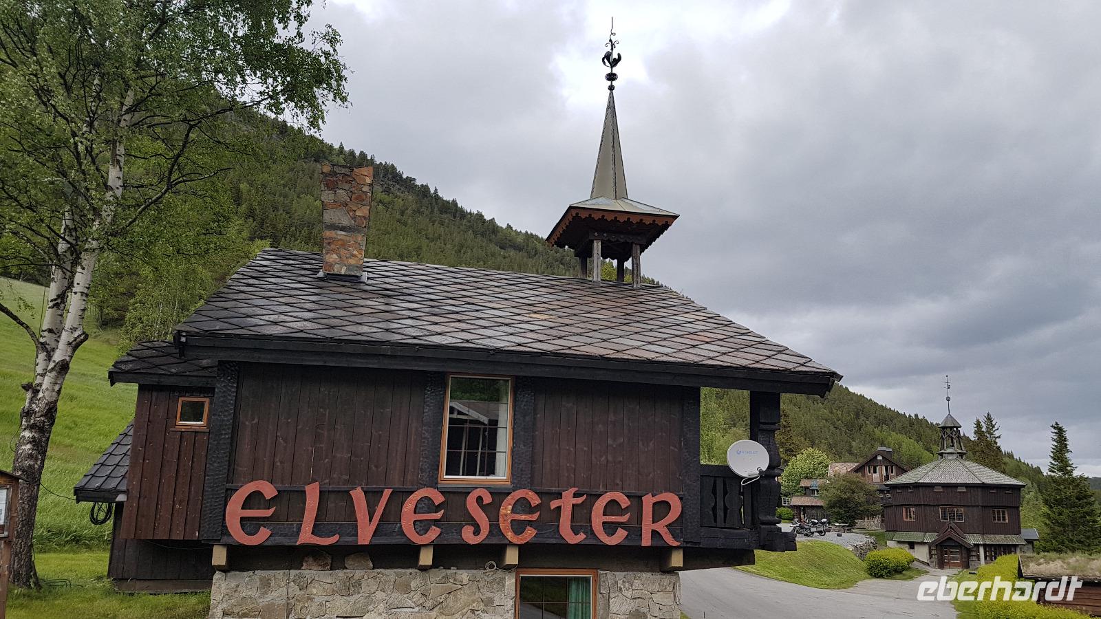 Weiter geht unsere Fahrt zum „Elveseter Touristhotel" im Boverdalen. Es ist seit mehreren Generationen im Familienbesitz und in seiner Form einzigartig. Die Anlage und die Innenausstattung sind Zeugen der Vergangenheit und spiegeln das Leben der Bewohner im Boverdalen wieder. Auf dem Gelände steht die „Saga Säule" oder auch „Eidsvoll -Säule. Sie wurde auf Initiative von Amund Elveseter im Jahr 1992 auf das Gelände gebracht und zeigt Darstellungen der norwegischen Geschichte von der Schlacht am Hafrsfjord Ende des 9. Jahrhunderts bis zum Jahr 1814 als in Eidsvoll die norwegische Verfassung angenommen wurde. Das Wetter lockt wieder zu einem Abendspaziergang.