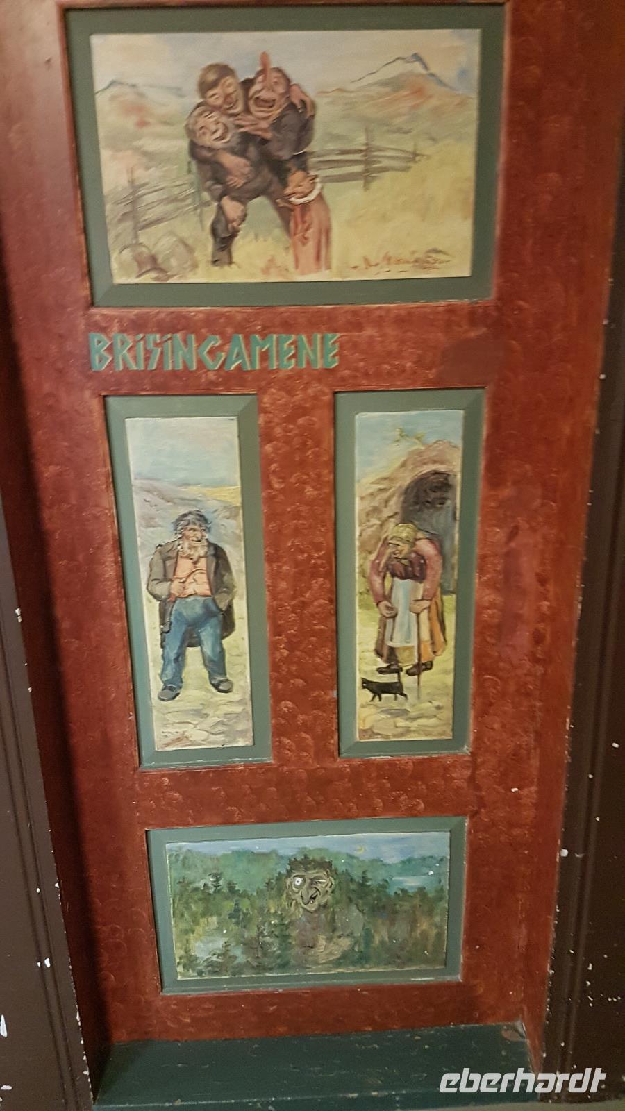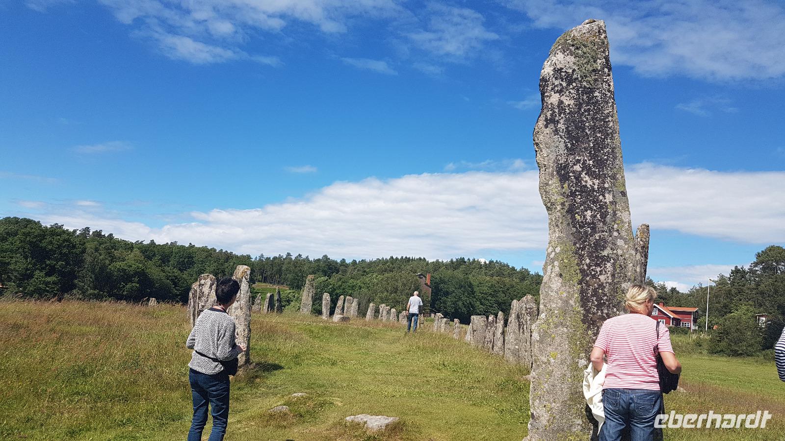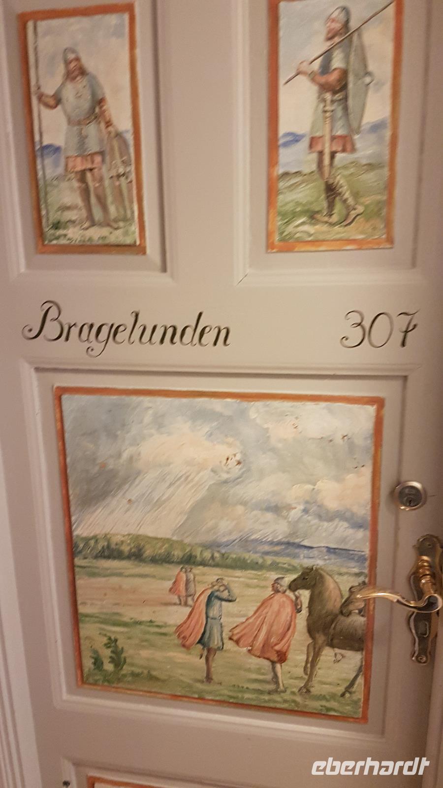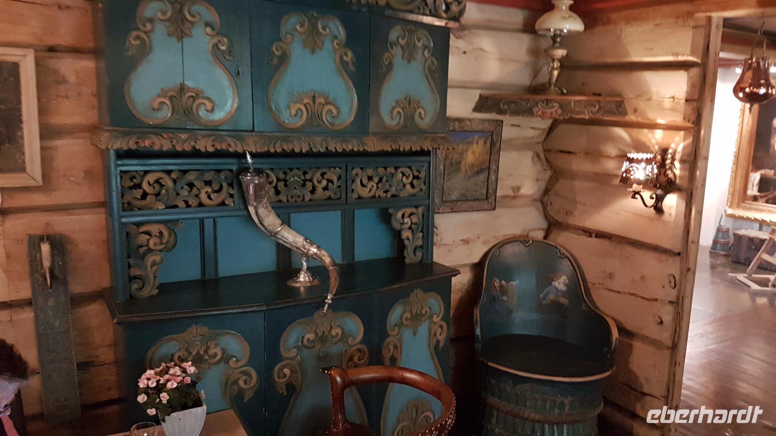 Weiter geht unsere Fahrt zum „Elveseter Touristhotel" im Boverdalen. Es ist seit mehreren Generationen im Familienbesitz und in seiner Form einzigartig. Die Anlage und die Innenausstattung sind Zeugen der Vergangenheit und spiegeln das Leben der Bewohner im Boverdalen wieder. Auf dem Gelände steht die „Saga Säule" oder auch „Eidsvoll -Säule. Sie wurde auf Initiative von Amund Elveseter im Jahr 1992 auf das Gelände gebracht und zeigt Darstellungen der norwegischen Geschichte von der Schlacht am Hafrsfjord Ende des 9. Jahrhunderts bis zum Jahr 1814 als in Eidsvoll die norwegische Verfassung angenommen wurde. Das Wetter lockt wieder zu einem Abendspaziergang.