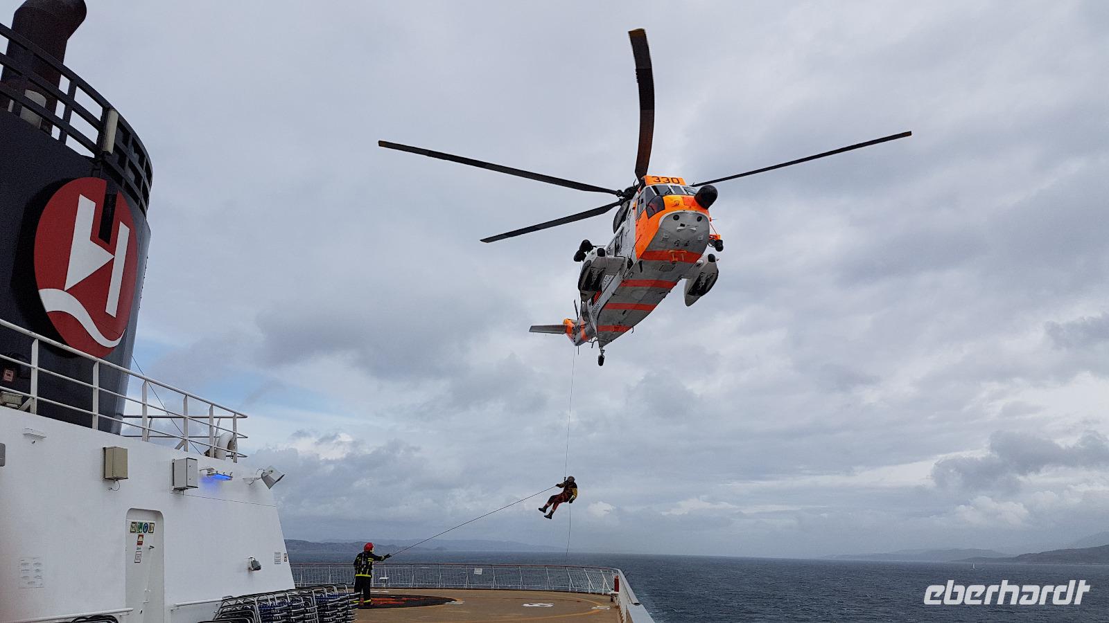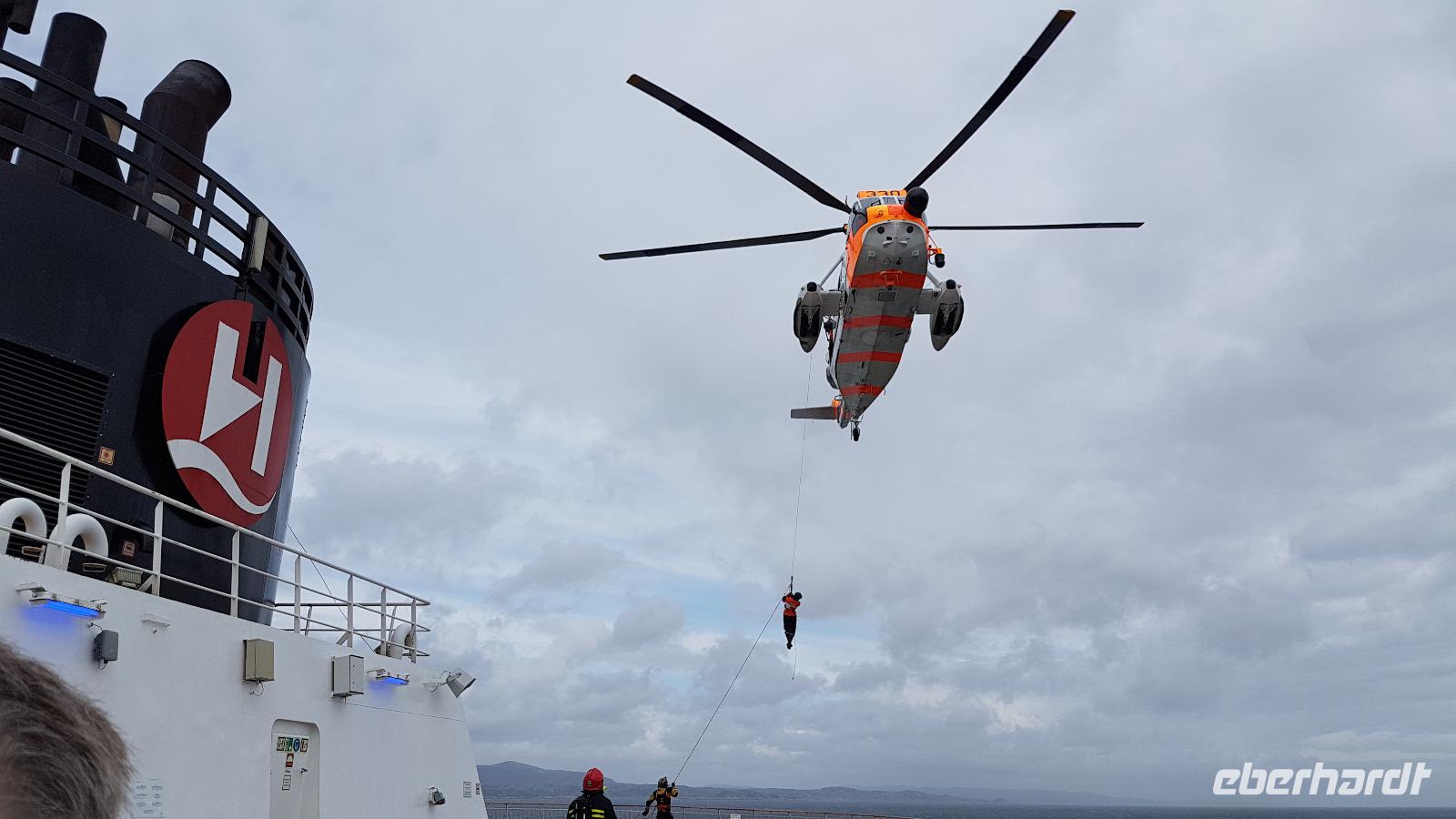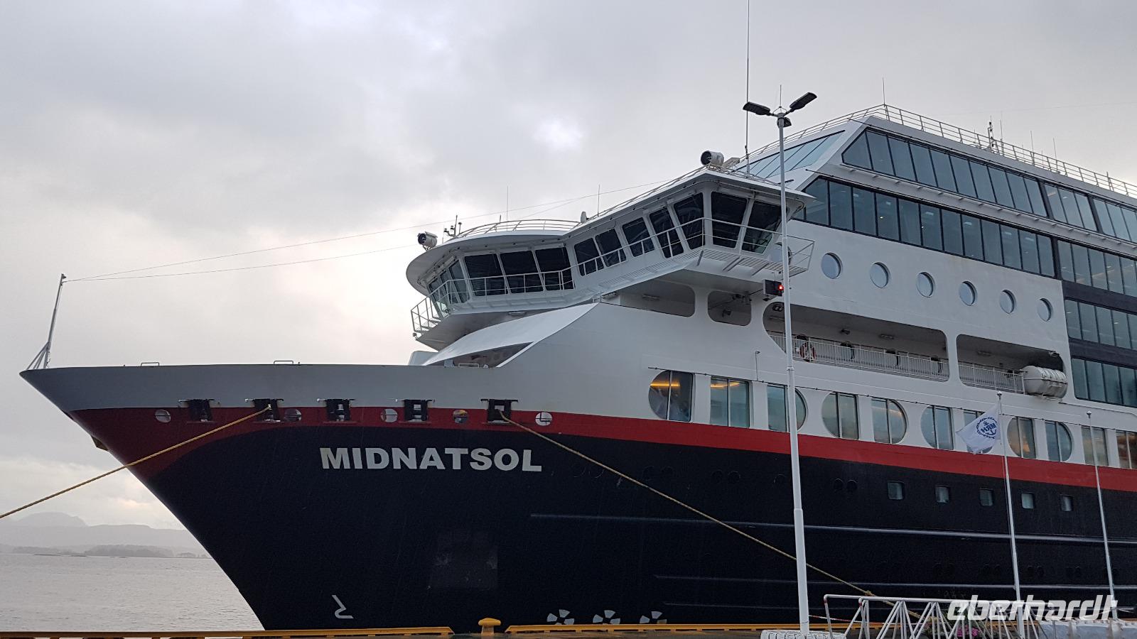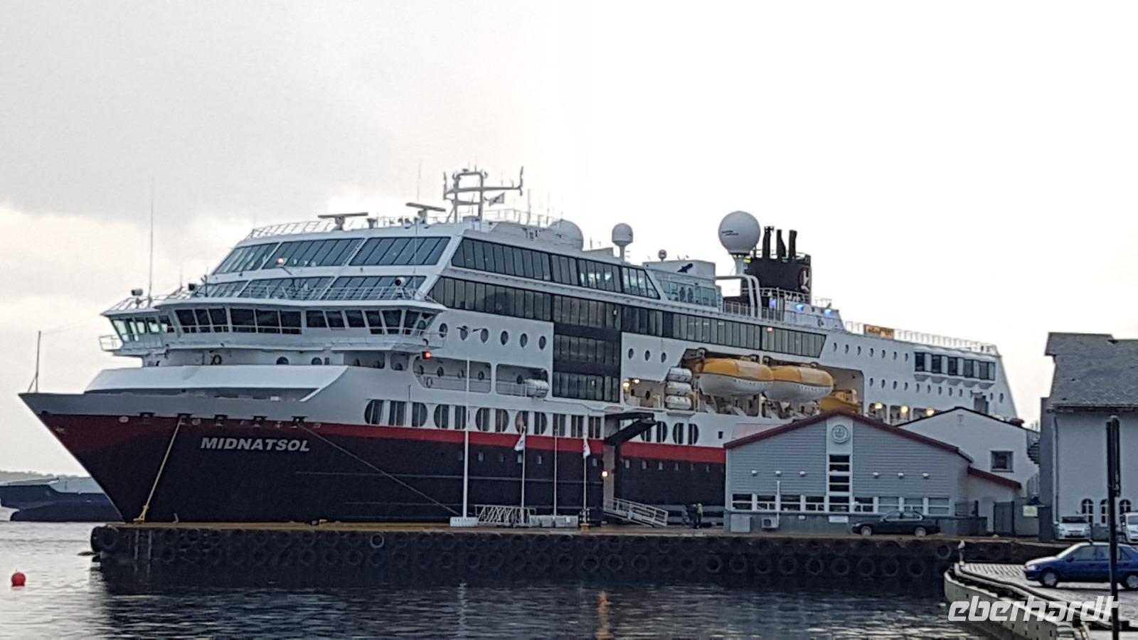 Wir freuen uns jetzt au unsere Seereise. Es geht mit der Hurtigrute - Schiff MS ‚Midnatsol" der „Mitternachtssonne" von Trondheim nach Kristiansund. Unser Schiff wurde 2003 gebaut und bietet Platz für 1.000 Passagiere. Wir machen es uns bequem und genießen die Fahrt. Das Wetter ist nicht optimal...es regnet und die Sicht ist nicht besonders gut. Am Nachmittag wird zufällig eine Rettungsübung durchgeführt und wir können beobachten, wie mehrere Personen von einem Helikopter auf das Schiff abgeseilt und wieder hinauf gezogen wurden. Das war spannend und erlebt man nicht alle Tage. Allmählich wurde das Wetter jedoch besser und die Sonne blinzelt zwischen den Wolken, als wir in Kristiansund an Land gehen.