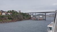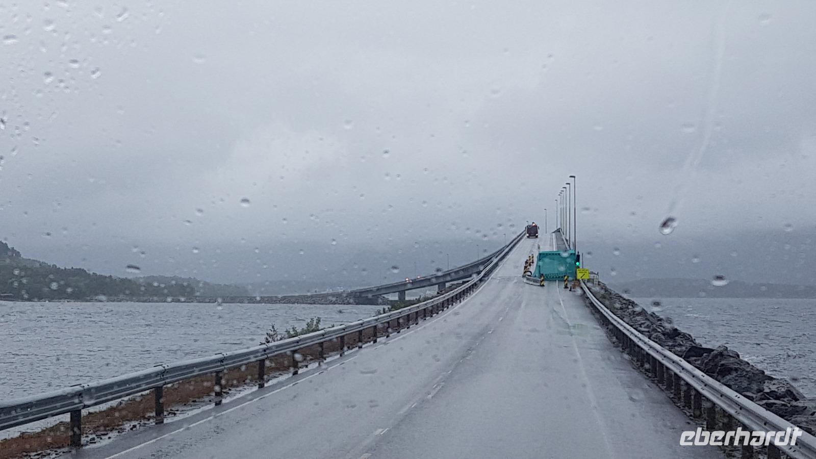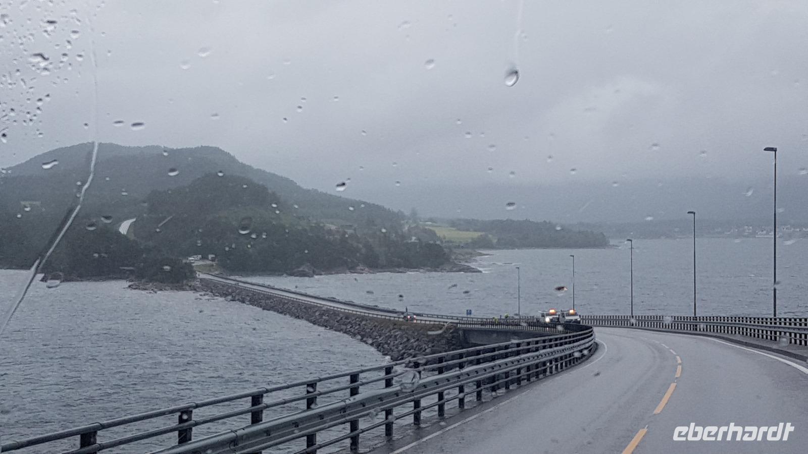Jens wartet schon am Kai und wir fahren in Richtung Molde. Die Fahrstrecke führt uns über eine der schönsten und spektakulärsten Touristenstraßen Norwegens. Die Atlantikstraße ist ein Teilstück der Reichsstraße Nr. 64. Auf einer Länge von 8274 m führt ihr Verlauf über acht Brücken. Leider regnet es wieder heftig und wir verzichten auf einen Fotostop.