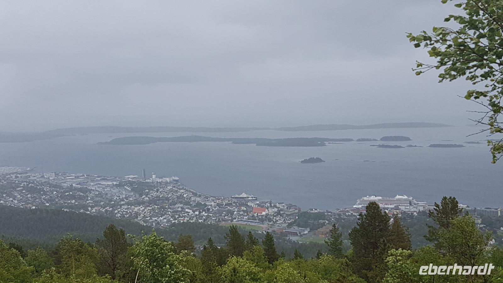 Nach dem Frühstück fahren wir mit unseren Gästen auf den Hausberg von Molde. Der „Varden" erhebt sich in einer Höhe von reichlich 400 m über der Stadt und dem gleichnamigen Fjord. Das Molde Panorama mit seinen 222 Gipfeln sollte sich kein Tourist entgehen lassen. Leider regnet es wieder und Nebel zieht auf.