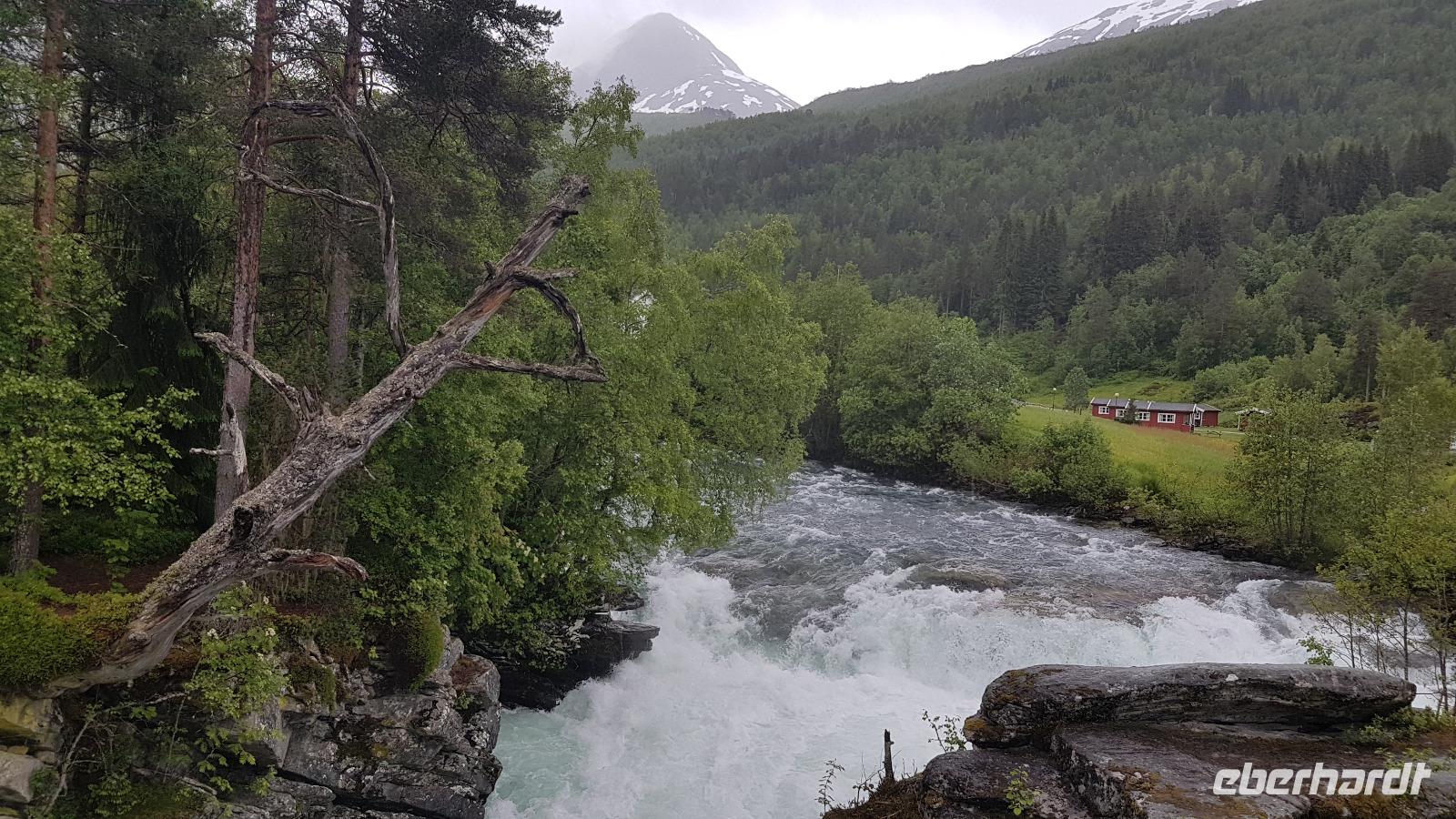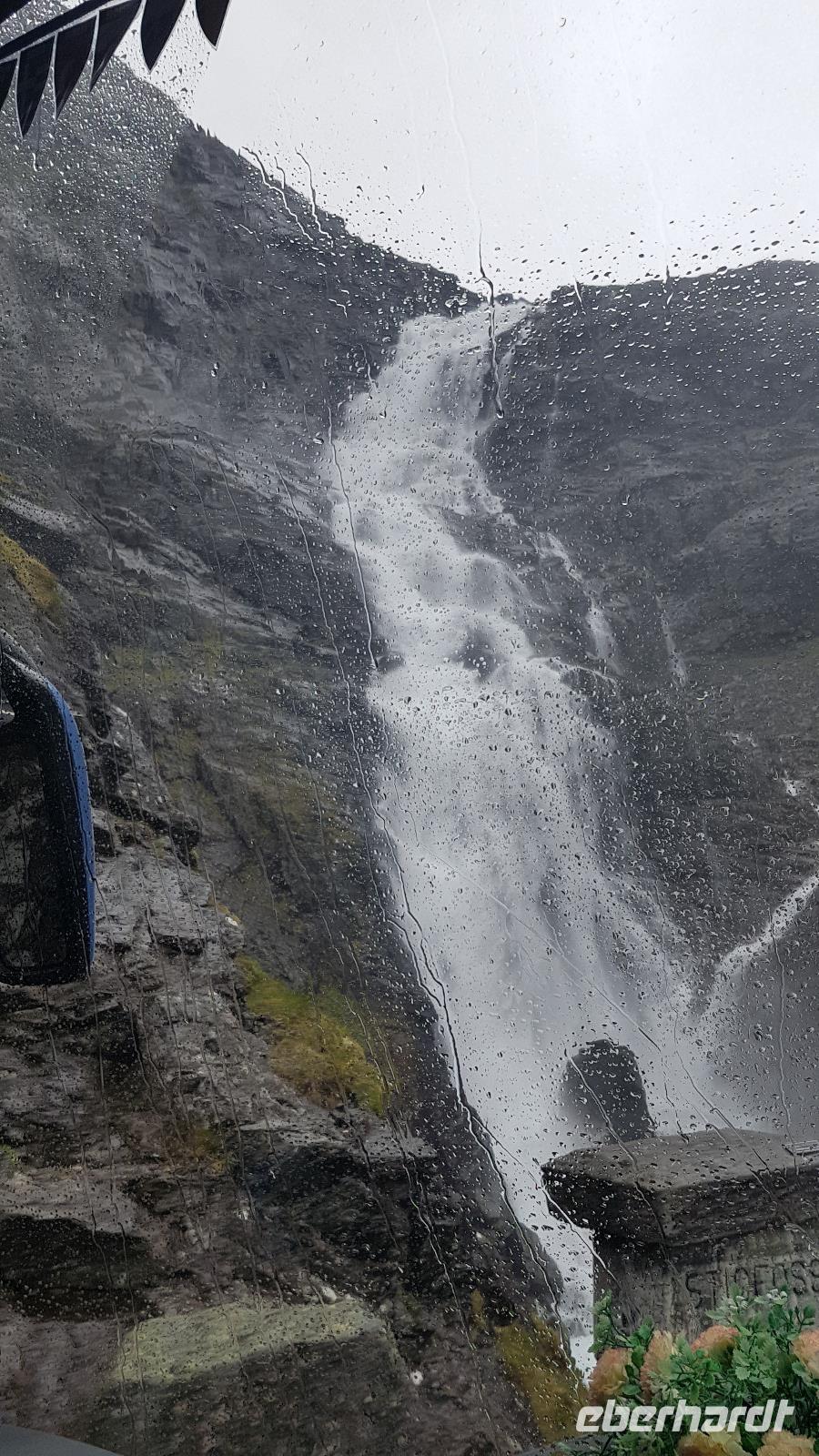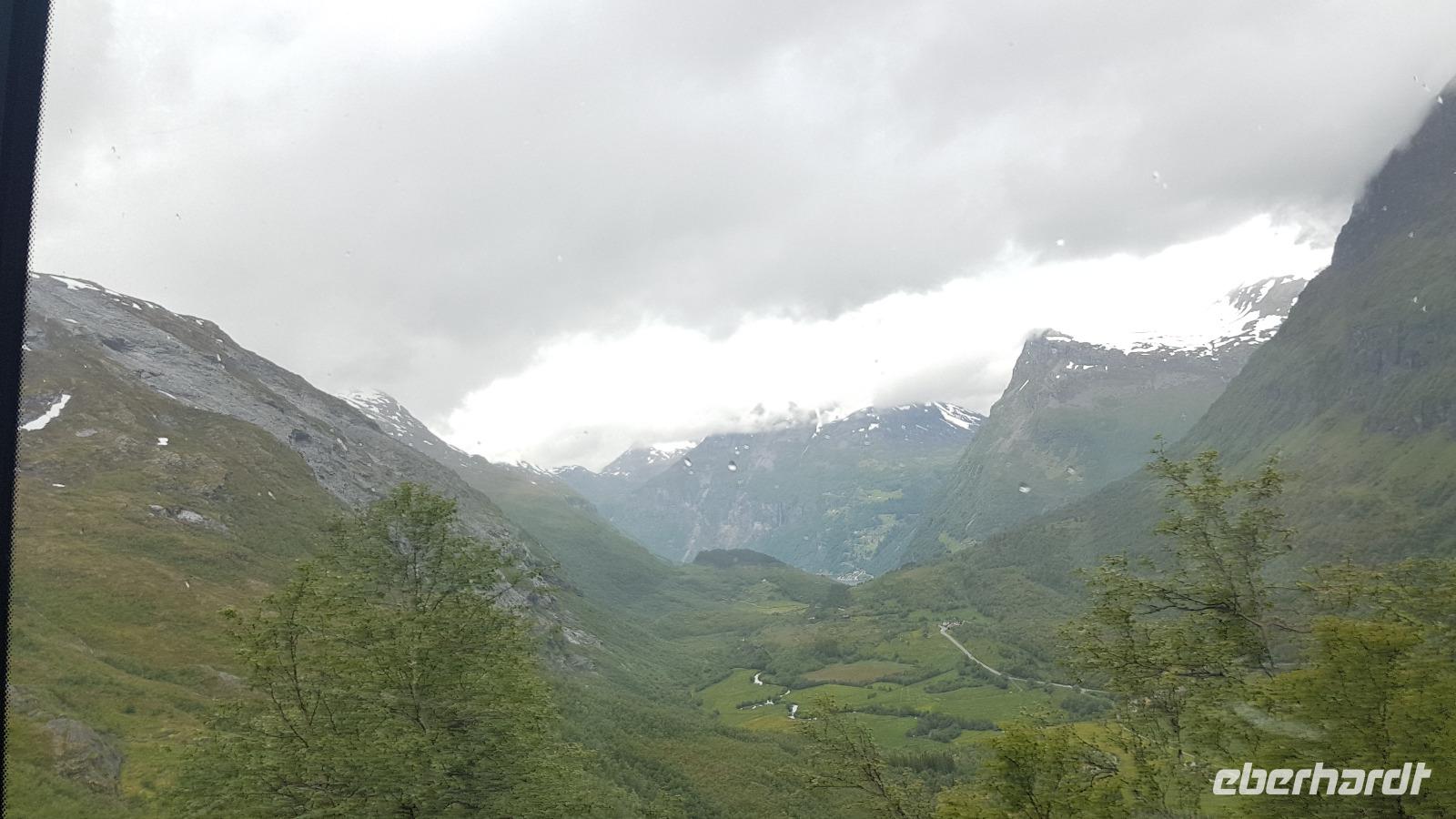 Nach der Fährüberfahrt von Solsnes nach Afarnes geht es am Romsdalfjord entlang nach Åndalsnes. Der Ort ist schon immer Ausgangsort für Reisende in die Romsdalalpen, für eine Fahrt mit der Eisenbahn/ der Raumabahn oder eine Fahrt über die Trollstigen gewesen. Zuerst geht es aber zu einem Fotostop an die Trollwand, danach zu den Trollstigen. Wir riskieren einen Blick hinauf. Diese Norwegische Landschaftsrute zieht sich auf einer Länge von 18 km auf 850 m Höhe. Sie ist ein Teilstück der Reichsstraße Nr. 63 und windet sich über elf Haarnadelkurven nach oben. Oben angekommen hat es wieder angefangen zu Regnen und es zieht sich zu. Einen kurzen Blick hinunter können wir aber erhaschen. An dem nächsten Wasserfall „Gudbrands Bru" legen wir einen weiteren Fotostop ein. Das Valldal, durch das wir im Anschluss fahren, ist bekannt für seine großen Erdbeerfelder. Die Erdbeeren blühen gerade.