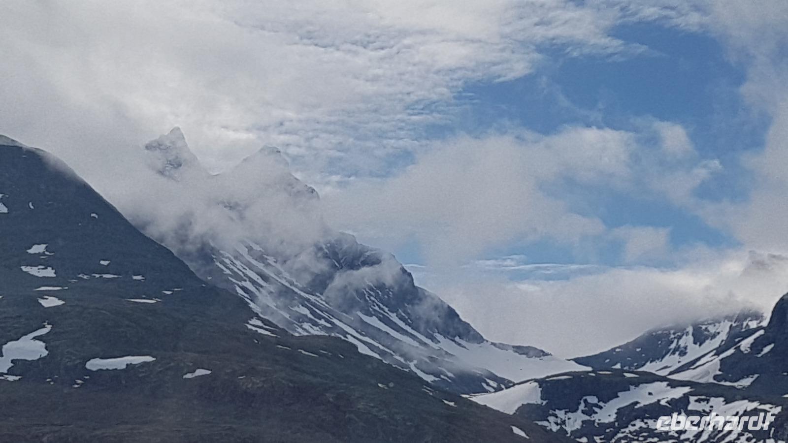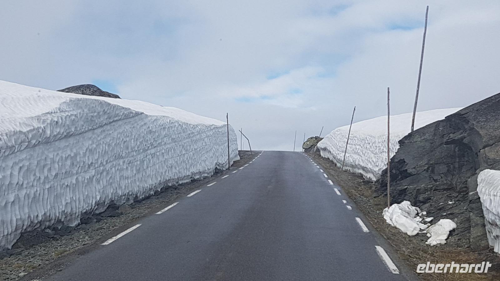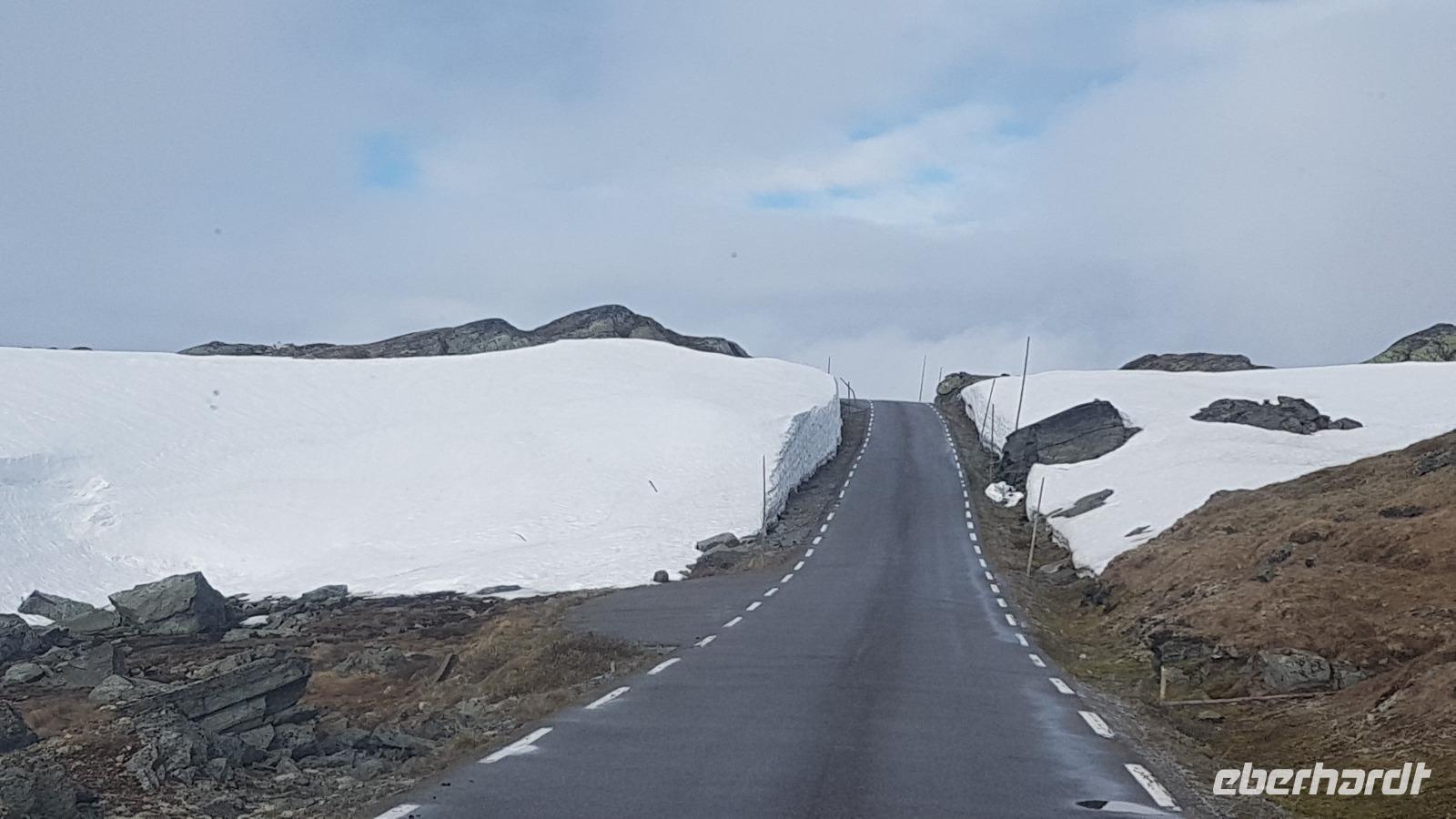 Nach der Fährüberfahrt von Solsnes nach Afarnes geht es am Romsdalfjord entlang nach Åndalsnes. Der Ort ist schon immer Ausgangsort für Reisende in die Romsdalalpen, für eine Fahrt mit der Eisenbahn/ der Raumabahn oder eine Fahrt über die Trollstigen gewesen. Zuerst geht es aber zu einem Fotostop an die Trollwand, danach zu den Trollstigen. Wir riskieren einen Blick hinauf. Diese Norwegische Landschaftsrute zieht sich auf einer Länge von 18 km auf 850 m Höhe. Sie ist ein Teilstück der Reichsstraße Nr. 63 und windet sich über elf Haarnadelkurven nach oben. Oben angekommen hat es wieder angefangen zu Regnen und es zieht sich zu. Einen kurzen Blick hinunter können wir aber erhaschen. An dem nächsten Wasserfall „Gudbrands Bru" legen wir einen weiteren Fotostop ein. Das Valldal, durch das wir im Anschluss fahren, ist bekannt für seine großen Erdbeerfelder. Die Erdbeeren blühen gerade.
