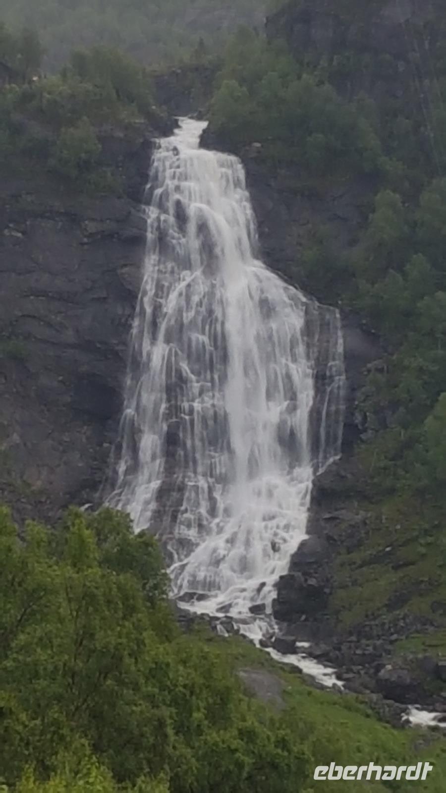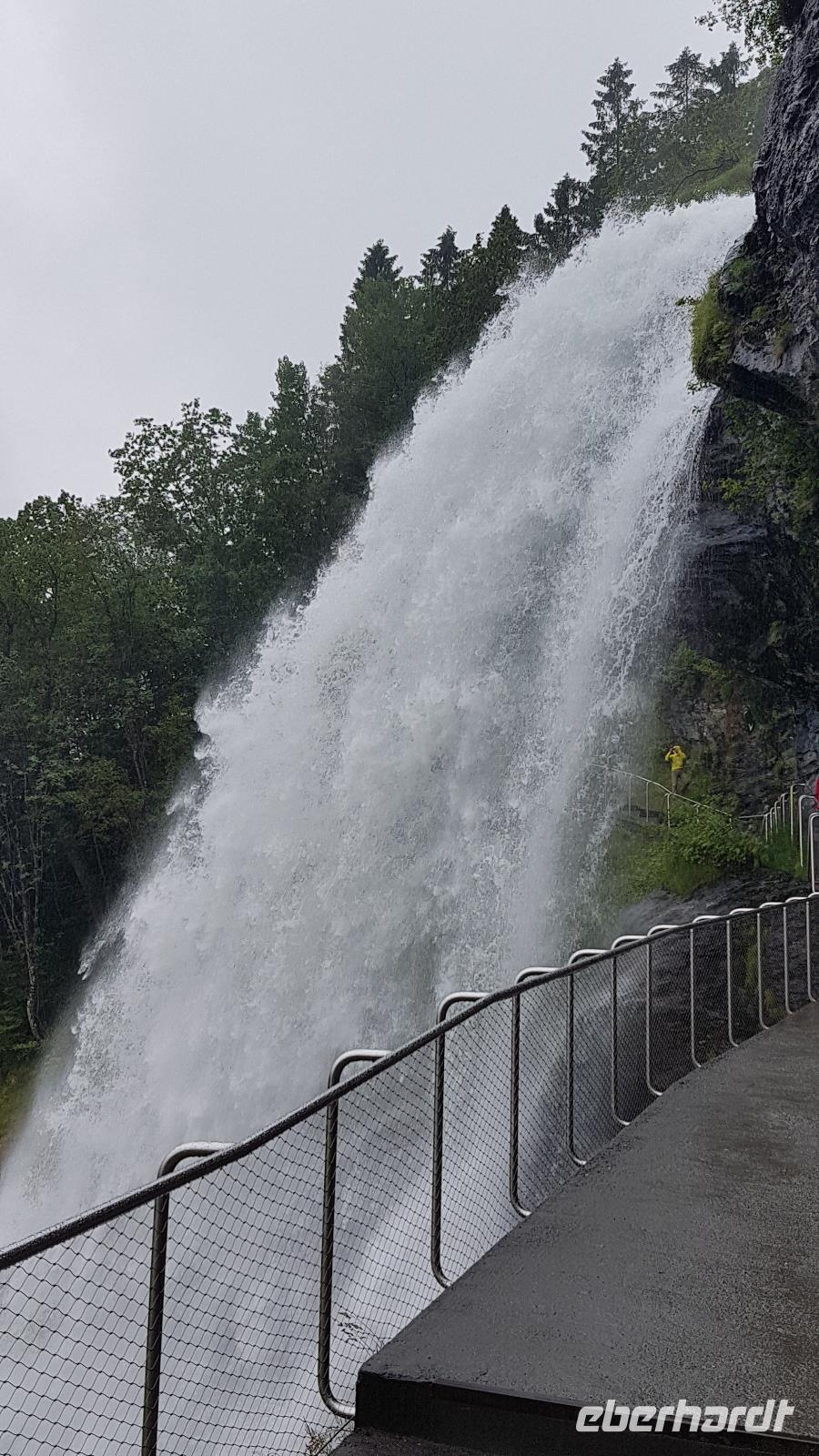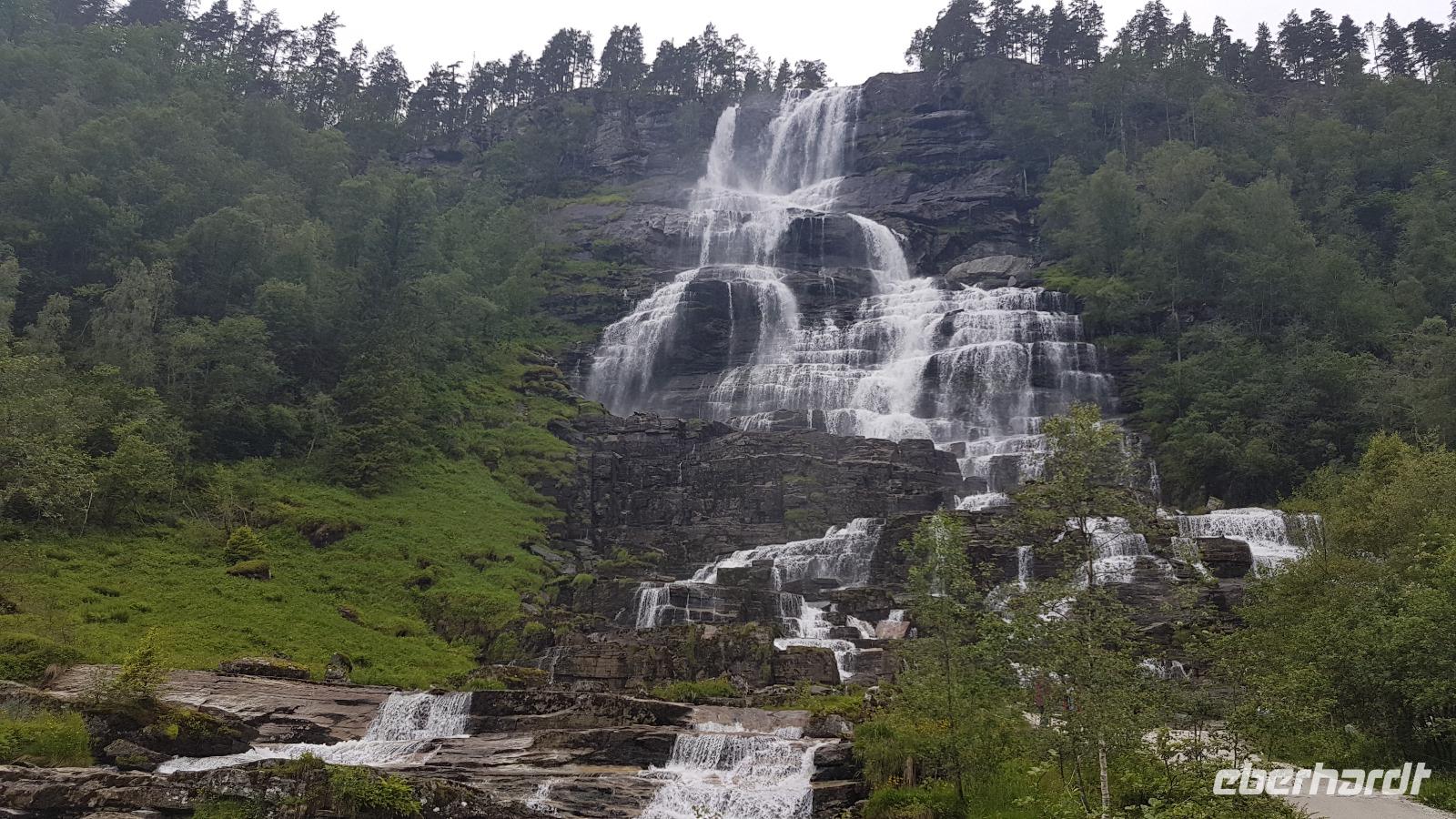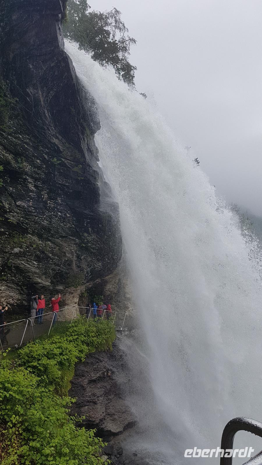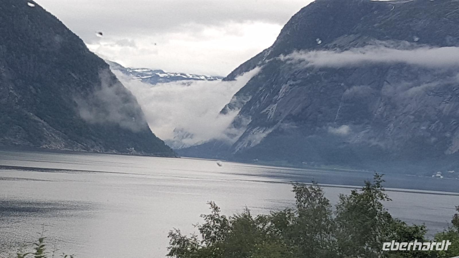 Auf unserer Weiterfahrt richtungGeilo halten wir zuerst am Steindalsfossen. Ein Weg führt hinter den Wasserfall und die Besucher werden nicht nass. Am Hardangerfjord entlang sehen wir zahlreiche Obstanbaugebiete. Hier ist das Klima so gut das an den windgeschützten Uferbereichen Äpfel, Birnen, Pflaumen und Kirschen gedeihen. Am Eidfjord fahren wir in den Vallaviktunnel. Ein gigantisches Bauwerk mit blau ausgeleuchtetem Kreisverkehr. Um besser fotografieren zu können - drehen wir eine extra Runde. Ein gigantisches Bauwerk schließt sich an. Die Hardangerbrücke wurde 2013 für den offiziellen Straßenverkehr frei gegeben. Mit einer Spannweite von 1310 Metern und einer lichten Höhe von 55 Metern ist sie die längste Hängebrücke Norwegens. Der nächste Wasserfall wartet auf uns, der Vöringfossen. Er ist einer der höchsten Wasserfälle Norwegens mit einer Gesamtfallhöhe von183 Metern. Leider verschwindet er im Nebel und wir fahren weiter.
