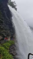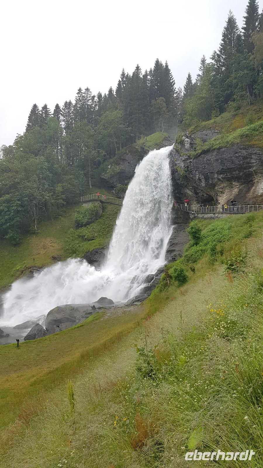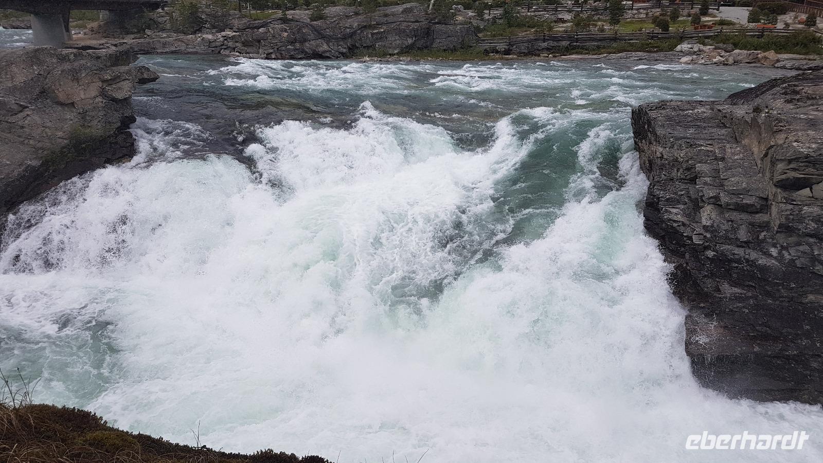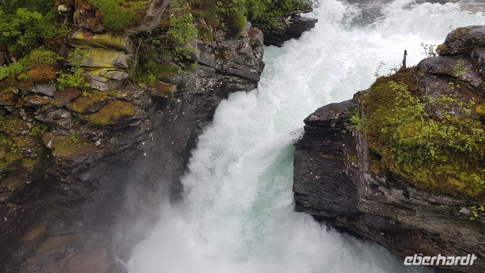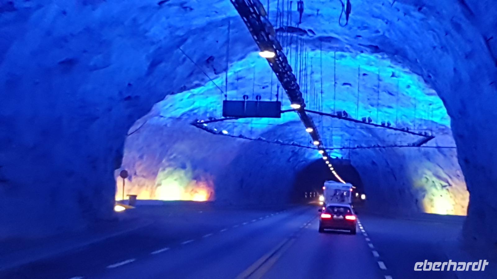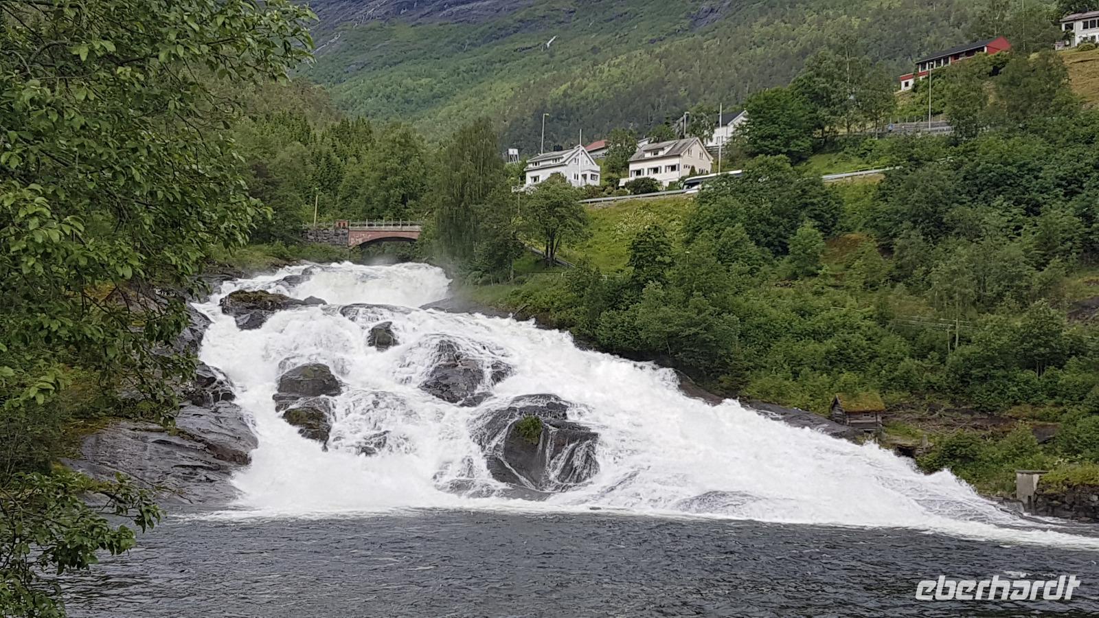 Auf unserer Weiterfahrt richtungGeilo halten wir zuerst am Steindalsfossen. Ein Weg führt hinter den Wasserfall und die Besucher werden nicht nass. Am Hardangerfjord entlang sehen wir zahlreiche Obstanbaugebiete. Hier ist das Klima so gut das an den windgeschützten Uferbereichen Äpfel, Birnen, Pflaumen und Kirschen gedeihen. Am Eidfjord fahren wir in den Vallaviktunnel. Ein gigantisches Bauwerk mit blau ausgeleuchtetem Kreisverkehr. Um besser fotografieren zu können - drehen wir eine extra Runde. Ein gigantisches Bauwerk schließt sich an. Die Hardangerbrücke wurde 2013 für den offiziellen Straßenverkehr frei gegeben. Mit einer Spannweite von 1310 Metern und einer lichten Höhe von 55 Metern ist sie die längste Hängebrücke Norwegens. Der nächste Wasserfall wartet auf uns, der Vöringfossen. Er ist einer der höchsten Wasserfälle Norwegens mit einer Gesamtfallhöhe von183 Metern. Leider verschwindet er im Nebel und wir fahren weiter.