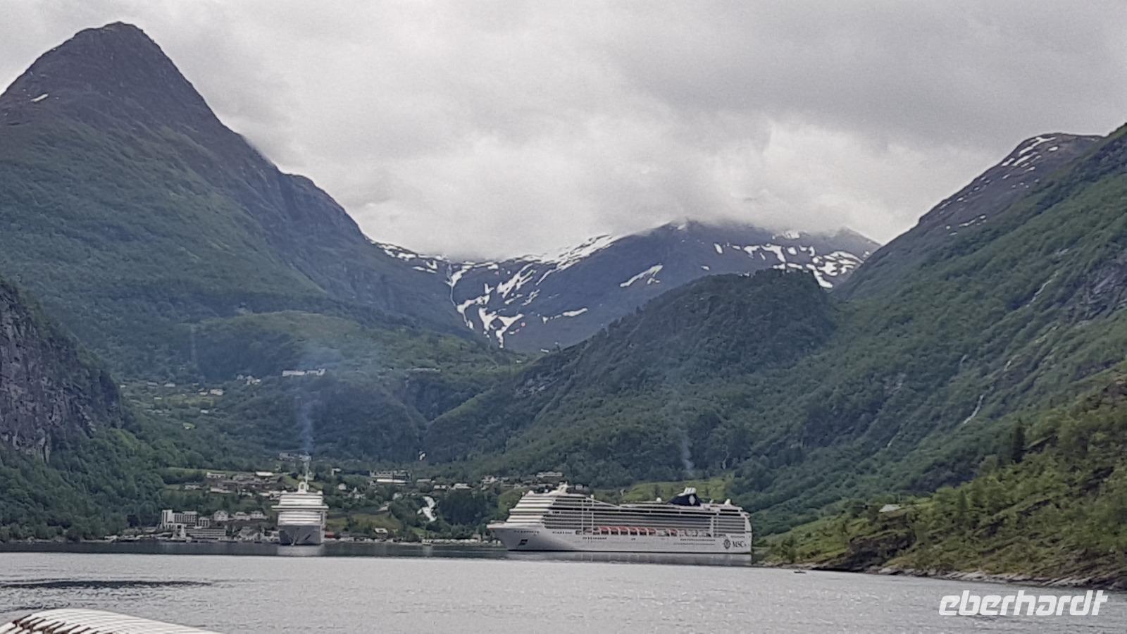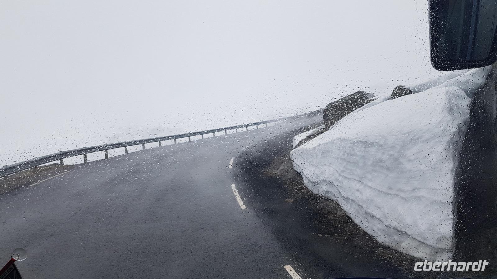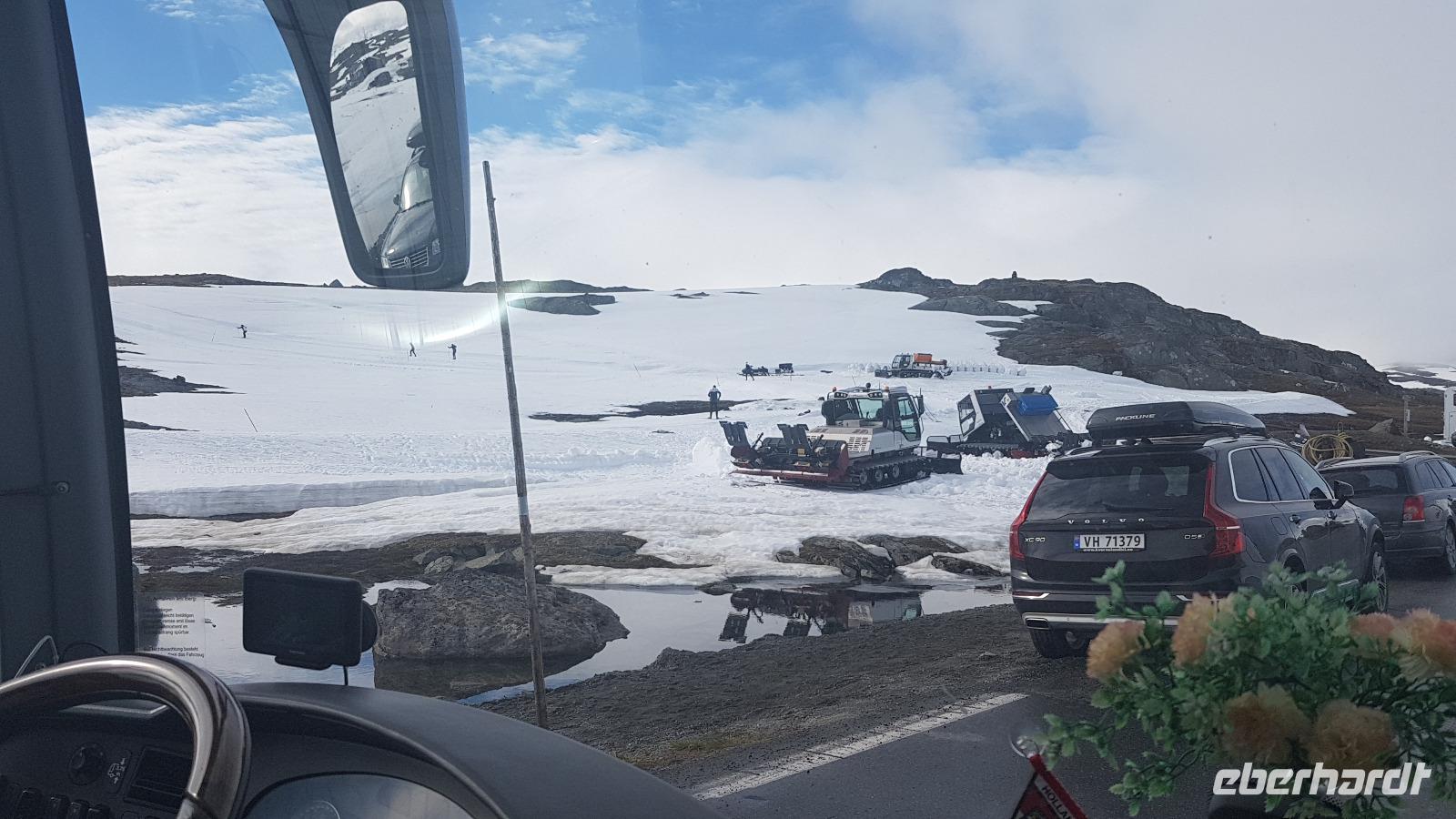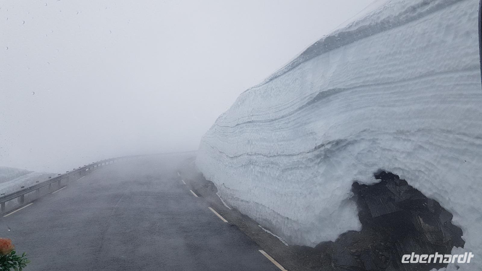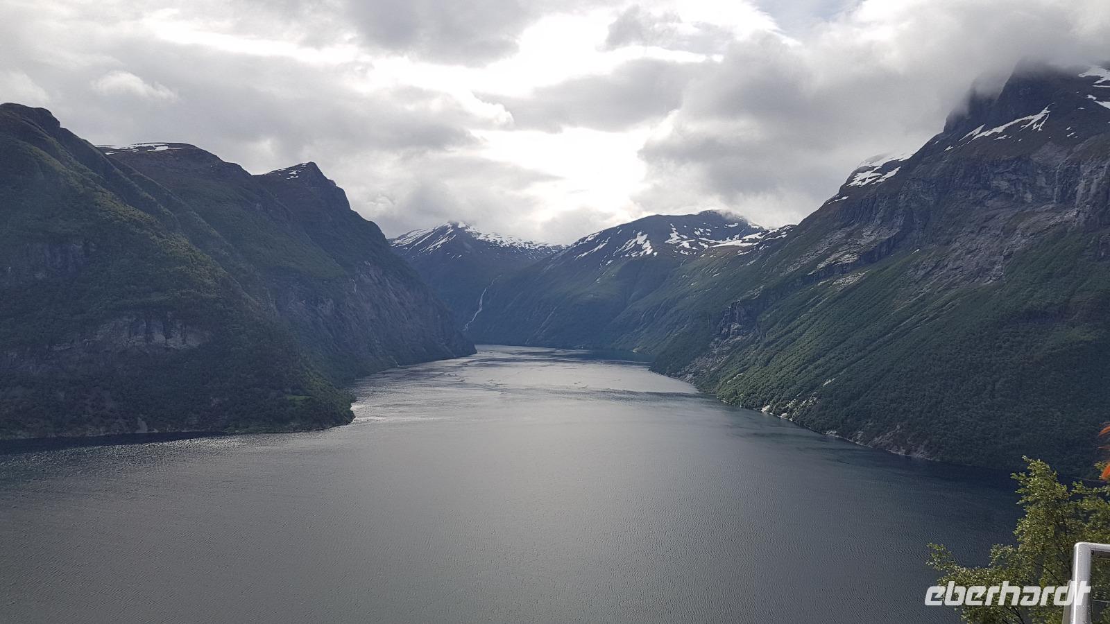 Wir nehmen Abschied von Ålesund und starten zur nächsten Tagesetappe. Von Magerholm aus nehmen wir die Fähre nach Sykkylven. An den Orten Hole und Stranda vorbei geht unsere Reise nach Hellesylt. Beim Fotostop hoch über dem Geirangerfjord freuen wir uns über den kurzen Sonnenschein und somit den traumhaften Blick Von Hellesylt aus fahren wir mit dem Schiff nach Geiranger. Eingerahmt wird der Fjord durch steile Felswände an denen es viele Wasserfälle zu bestaunen gibt. „Die sieben Schwestern" - „Der Freier" - „Der Brautschleier". Vor dem Ort Geiranger liegen zwei Kreuzfahrtschiffe vor Anker. Der kleine Ort mit nur 250 Einwohnern ist mit Touristen bevölkert. Oberhalb von Geiranger bietet die Aussichtsplattform einen grandiosen Blick über das Fjord und unser Gruppenfoto wird mit einem Überraschungssekt, von Ebehardt-Travel spendiert- aufgenommen. Wir halten am Gletschersee und machen eine kurze Pause, bevor es als weitere Überraschung für die gäste außerplanmäßig noch zum Dalsnibba, auf den 1476 Metern hohen Berggipfel hinauf geht. Eine spannende Auffahrt, gesäumt rechts und links der Straße durch hohe Scheewände. Oben angekommen zieht gerade Nebel auf.