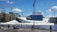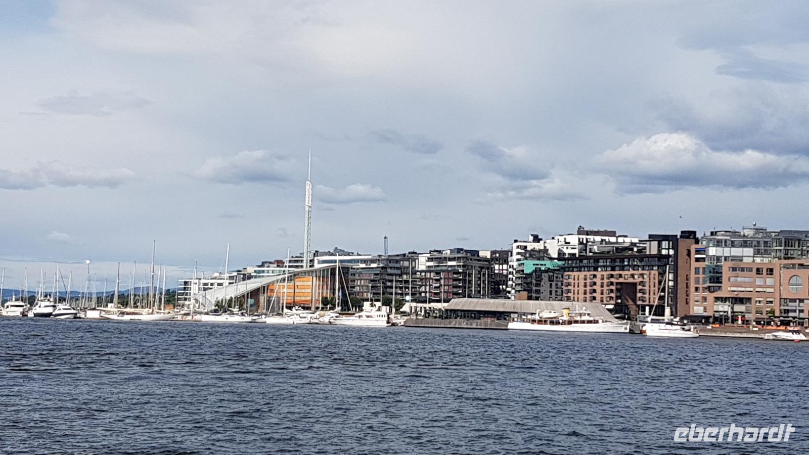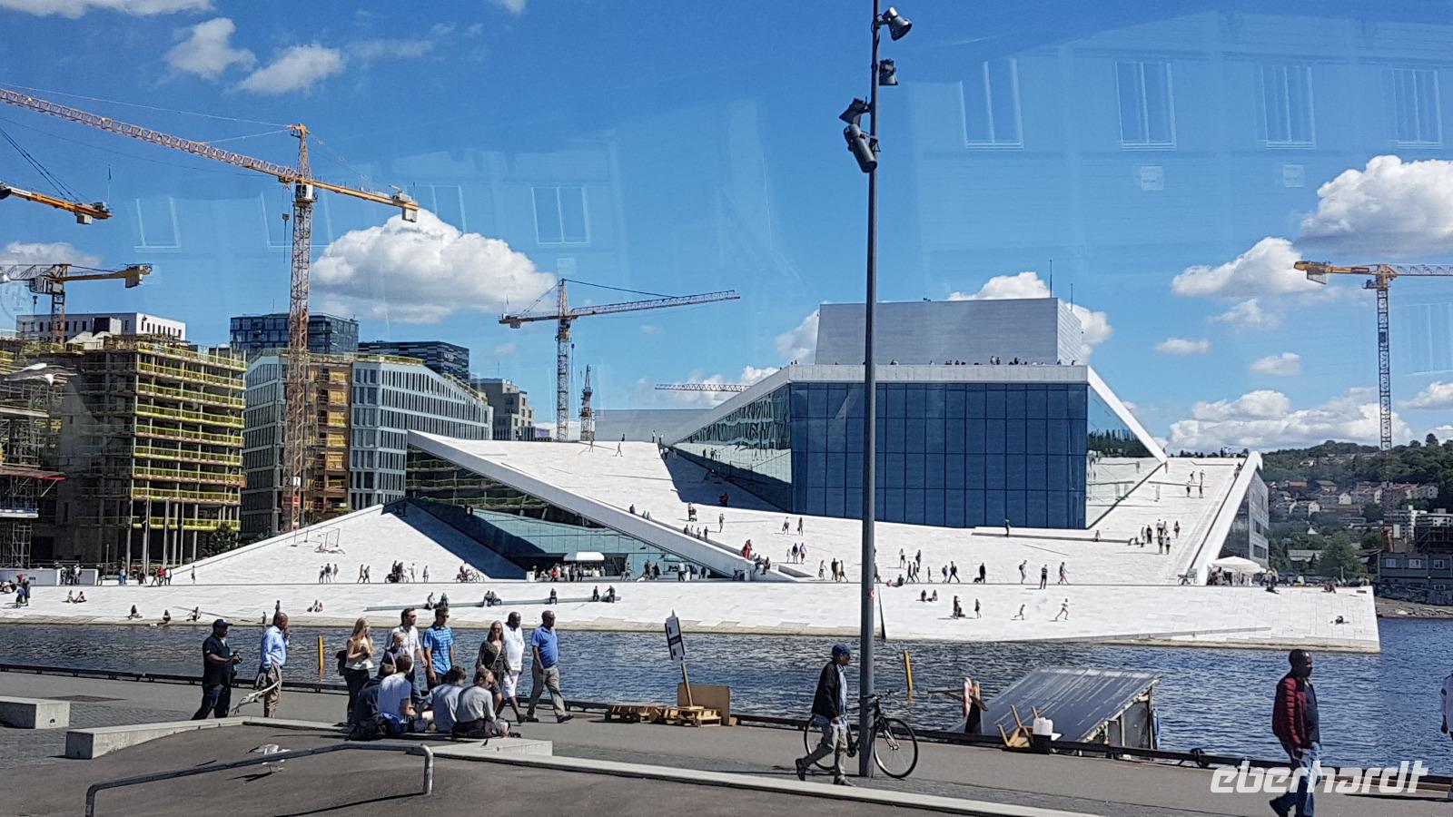 Wir verlassen die Hochebene und fahren durch das Hallingdal, am Kroederen -See und Tyrifjord vorbei. erreichen wir nach einer sonnigen Mittagspause pünktlich unseren Treffpunkt, an der „Festung Akerhus". Unsere Gästeführerin Angelika wartet schon auf uns. Wir bewundern die Osloer Oper und machen einen ausgiebigen Spaziergang auf dem Dach. Das neue Opernhaus ist seit 2008 Spielstätte der Norwegischen Oper. Von hier aus haben wir schon einen schönen Blick über die Stadt und das Oslofjord.
