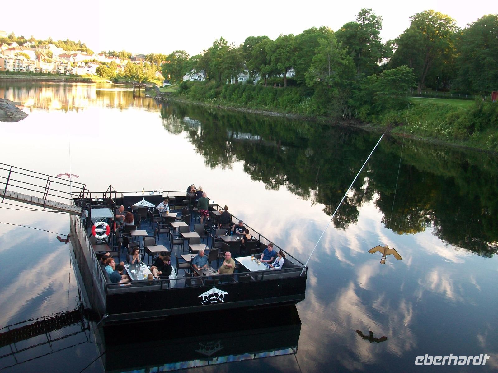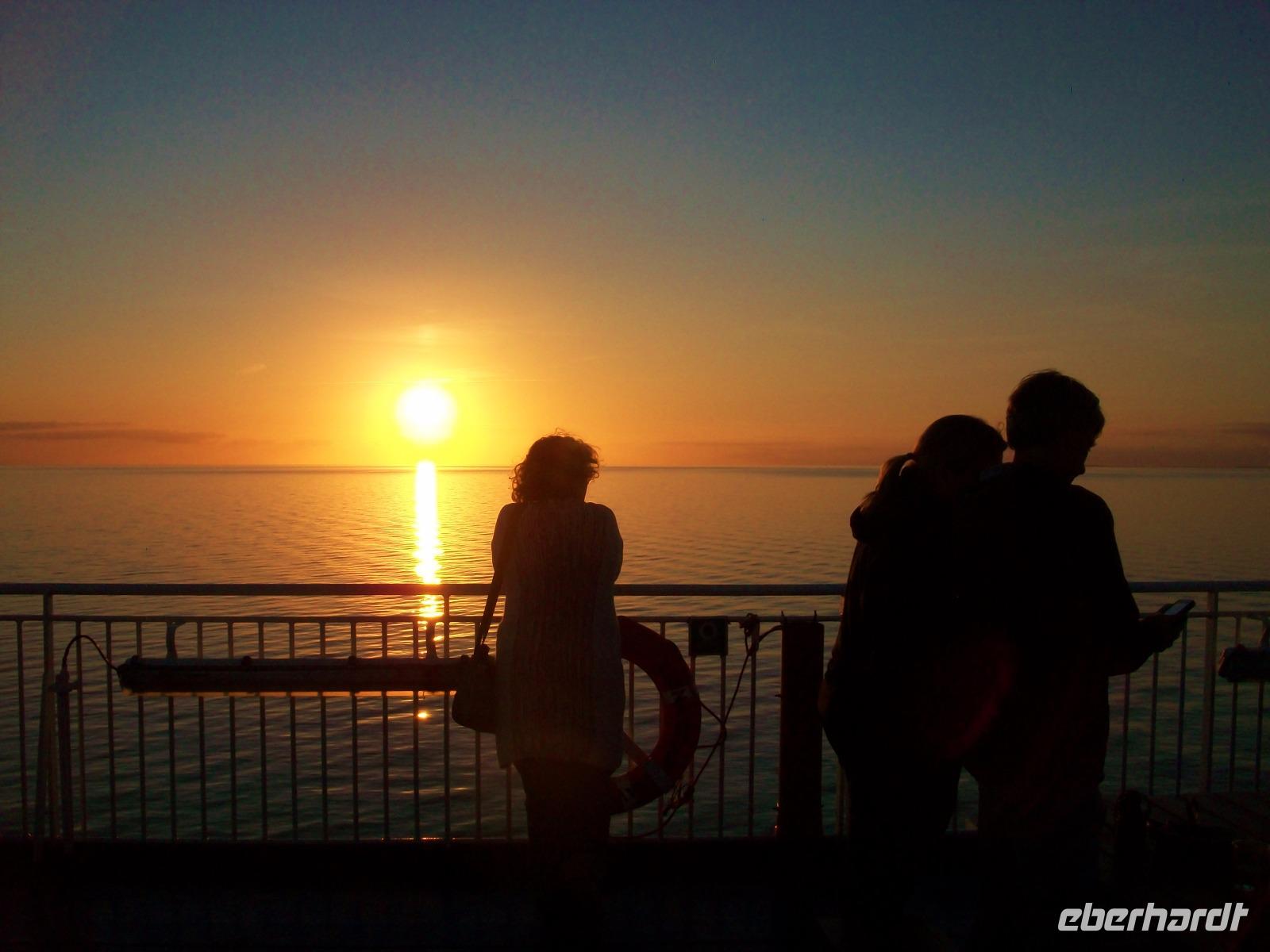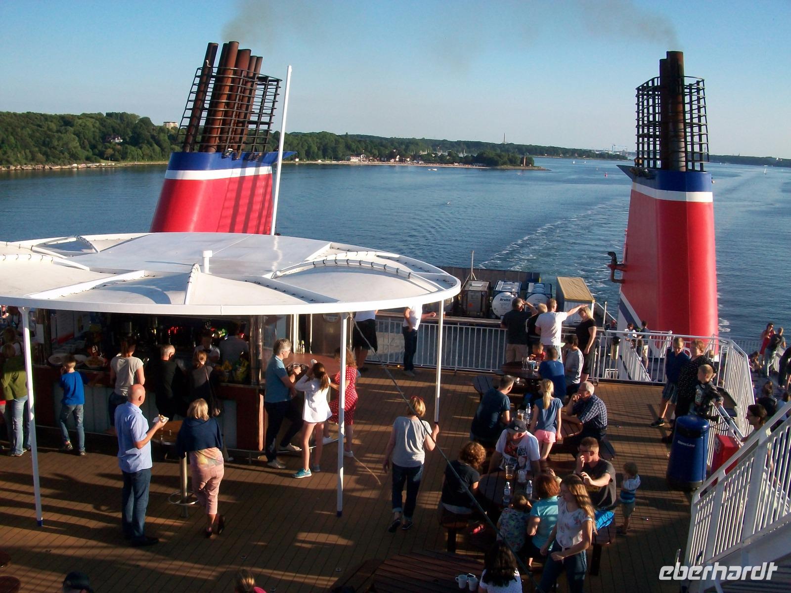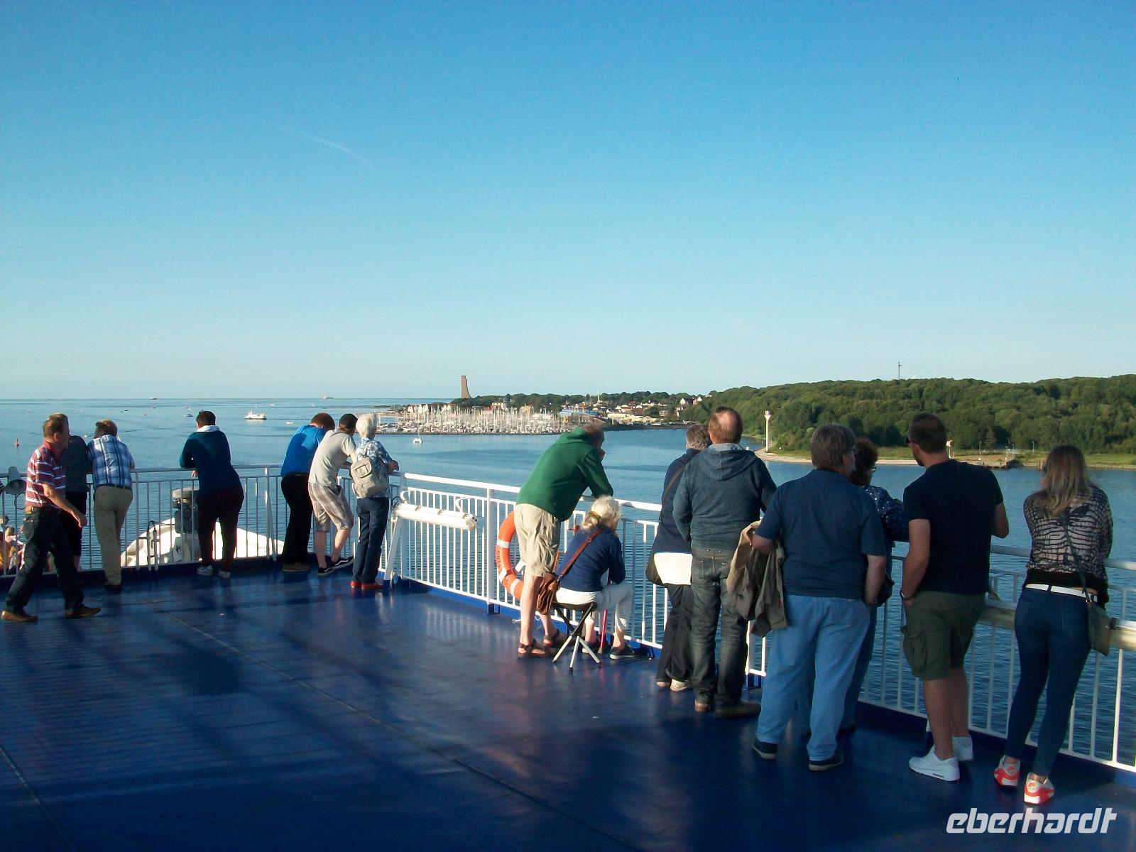 Doch zunächst verbleibt noch Zeit für einen Bummel durch Kiel, doch kurz vor sieben legt dann die Fähre ab und die Hafenanlagen der Stadt ziehen langsam vorbei; wir sitzen beim Abendessen und können diese Impressionen in aller Gemütlichkeit genießen. Später gelangen wir dann durch die Kieler Förde, vorbei am Vorort Laboe und dem Marinedenkmal, um schließlich das offene Meer zu erreichen.
