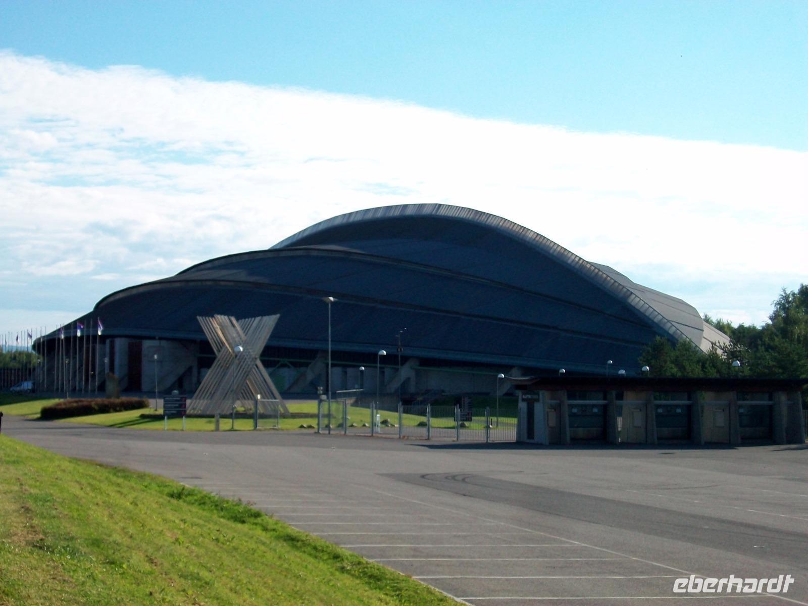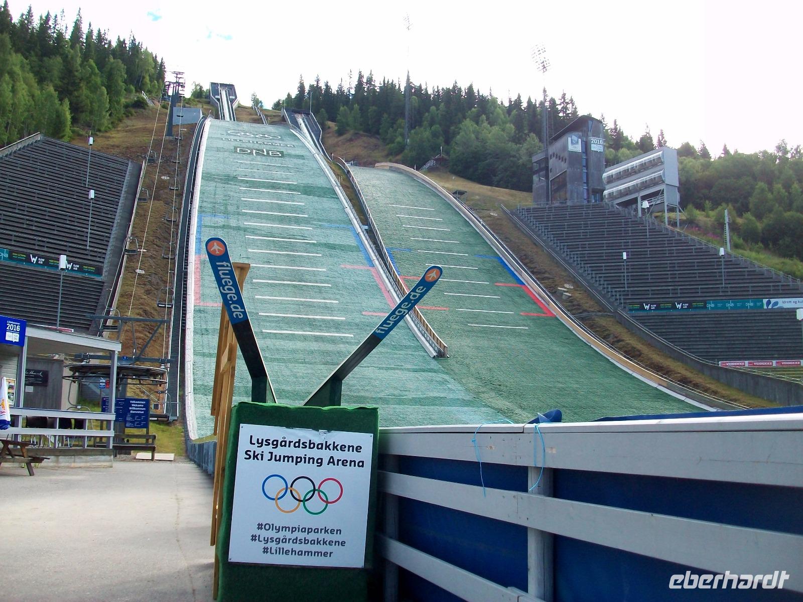 23.7.2017. Auch der heutige Tag wird uns viele Höhepunkte bringen. Wir setzen unser Fahrt am Ufer des Miøsasees fort um zu seinem nördlichen Ende zu gelangen. Bald tauchen am Berg zwei Sprungschanzen auf; Norwegen ist ein Land des Wintersports, hier in Lillehammer fanden 1994 Olympische Winterspiele statt und die Sprungschanzen oben auf dem Berg sind unser erstes Ziel am heutigen Tag. Beim Blick hinauf zum Sprungturm erahnen wir wieviel Mut dazu gehört diesen riskanten Sport zu betreiben.