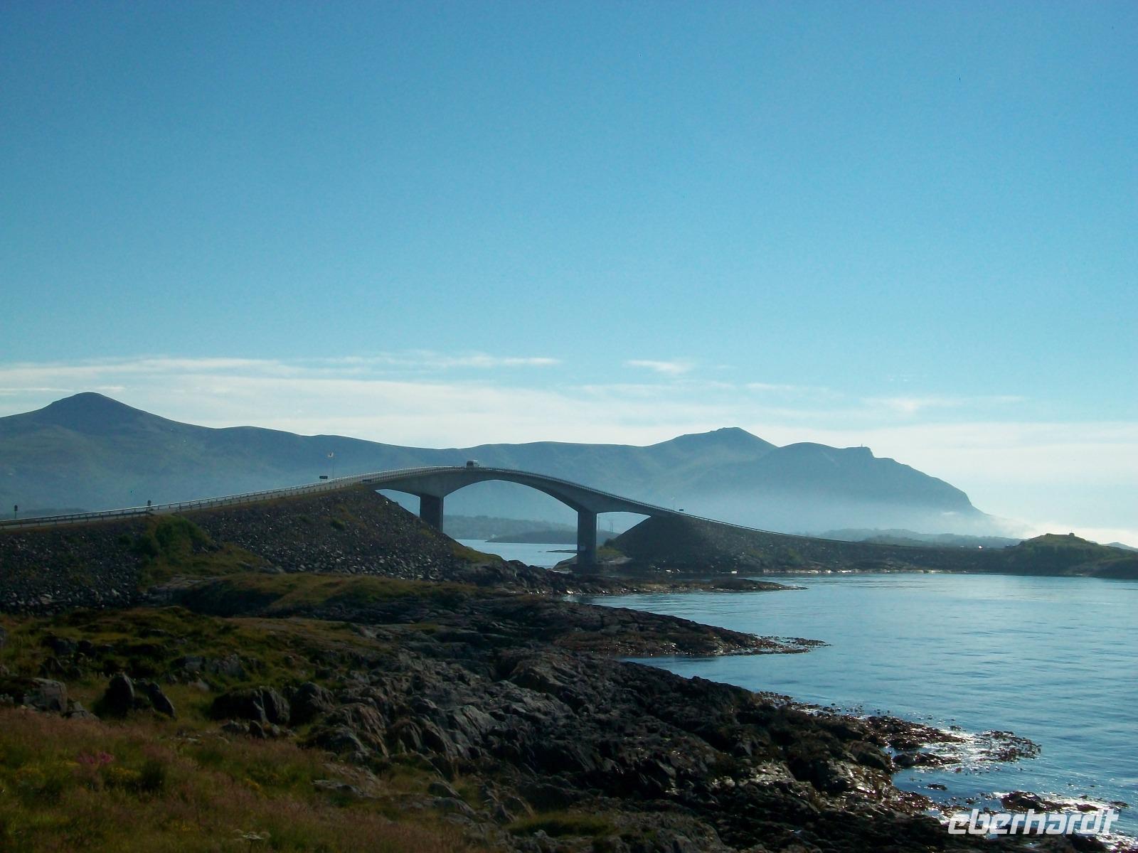 Kurz nach zehn legen wir ab; wir gelangen durch den Trondheimfjord und später entlang der Küste in Richtung Süden. Leider gibt es zu Beginn der Reise noch einige Wolken, vielleicht werden sie verschwinden und tatsächlich, die Sonne zeigt sich am Nachmittag. Gemütlich schippern wir über das Meer; die immer hungrigen Möwen begleiten unsere Fahrt mit elegantem Flug und am Nachmittag legen wir in Kristiansund an. Hier verlassen wir das Schiff; Roy unser Chauffeur, ist uns an Land mit dem Bus gefolgt und ab hier geht es nun durch den Atlantiktunnel zur Atlantikstraße. Es ist die spektakuläre Verbindung zwischen den Schären; abenteuerliche Brückenkonstruktionen bringen uns zwischen den Inseln entlang, der mächtige Gezeitenstrom fließt in die Fjorde ein und zeigt uns die Kraft der Natur. Nach dieser beeindruckenden Tour langen wir in Molde an; hier erhalten wir wenig später die letzte Stärkung des Tages.
