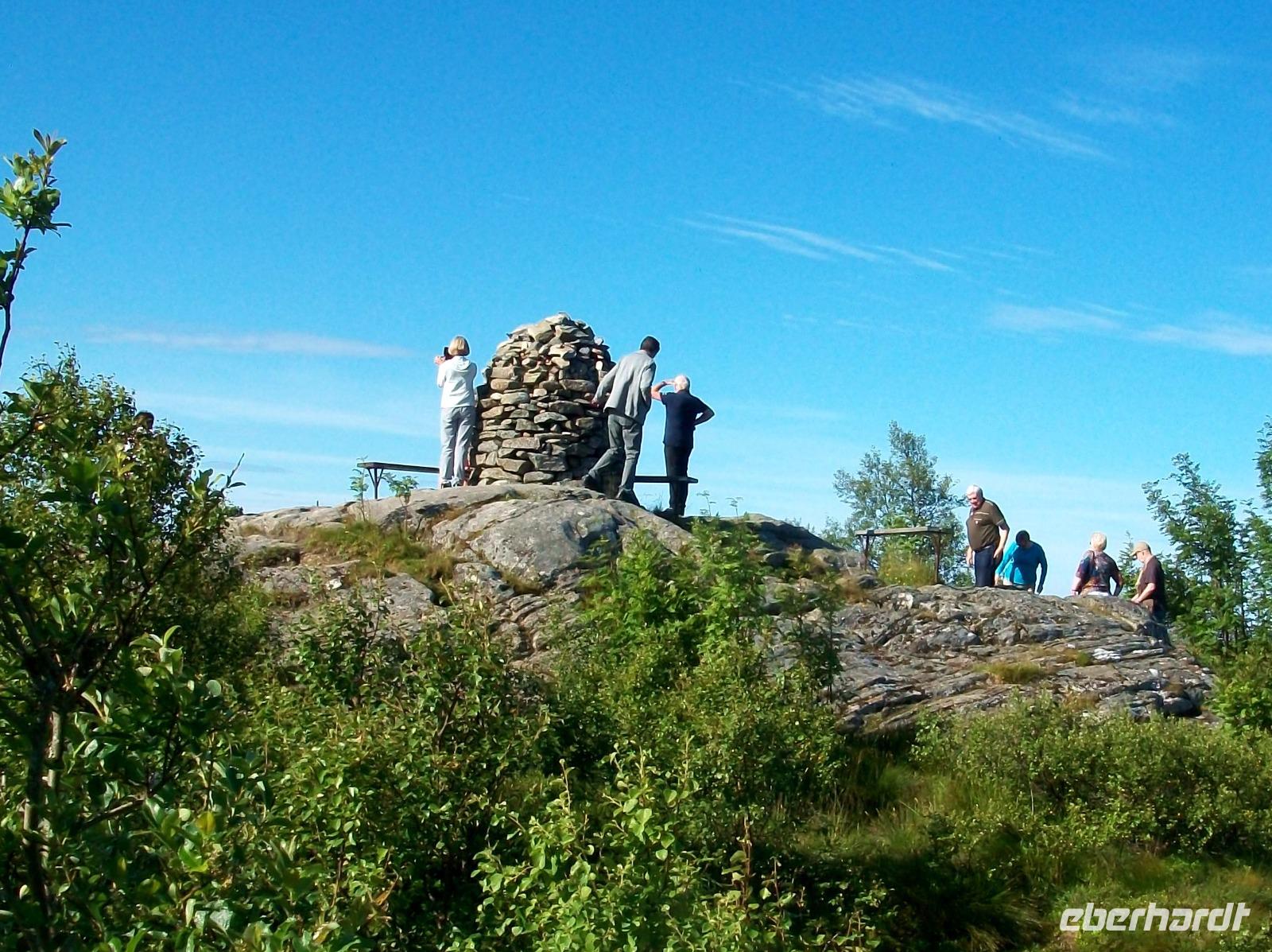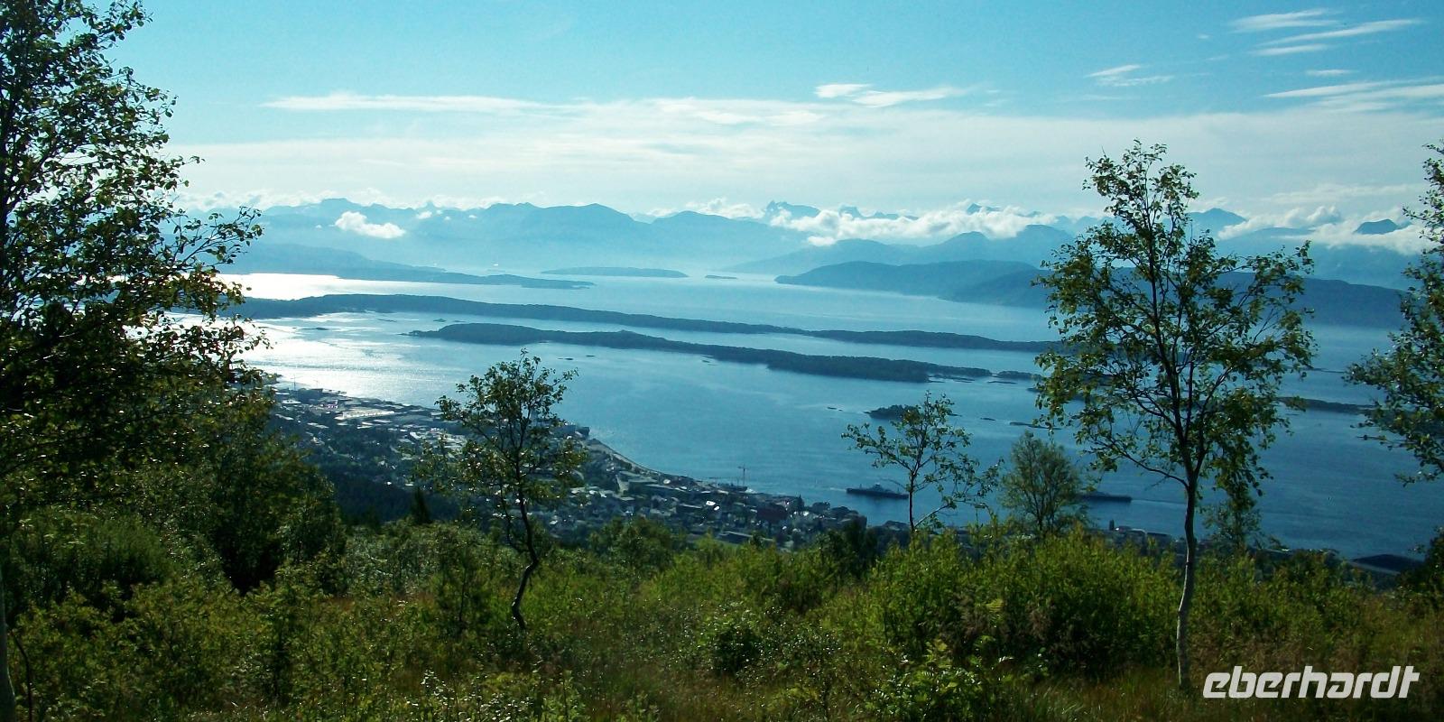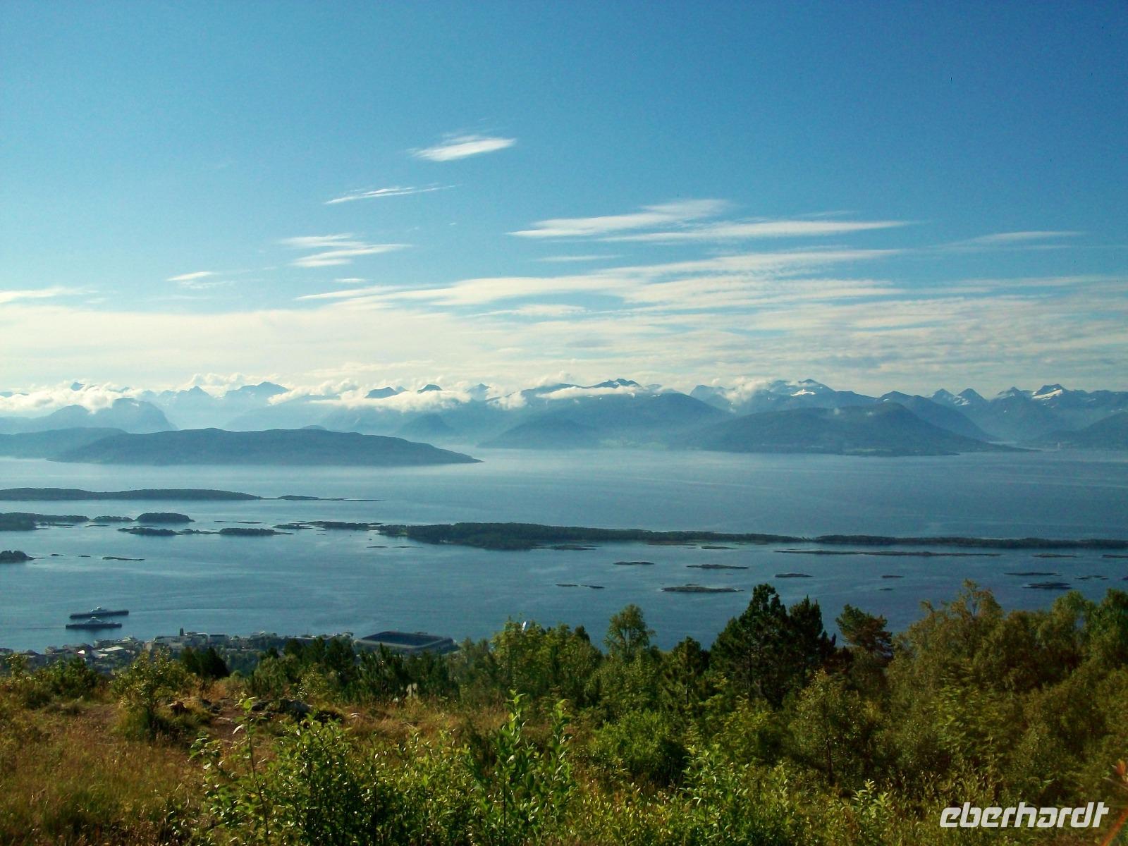 25.7.2017. Die Sonne lacht uns ins Gesicht bei der Fahrt hinauf zum Varden. Es ist der Hausberg von Molde und als wir oben anlangen, kann der Blick grandioser nicht sein! Unten am Meer liegt der Ort, im Hintergrund sind die schneebedeckten Spitzen der Romsdalalpen zu sehen und hinter uns dehnt sich die Wasserfläche des Atlantiks aus. Dazu eine himmlische Ruhe - ein schöner Auftakt des Tages.
