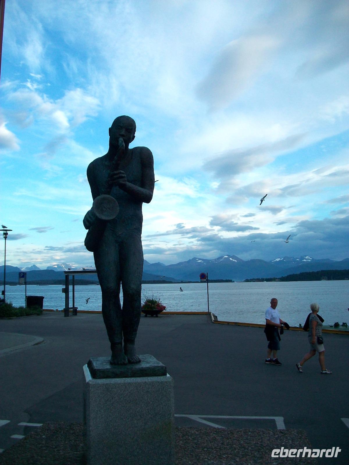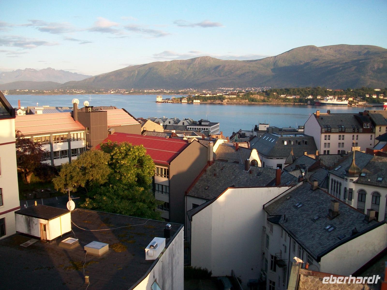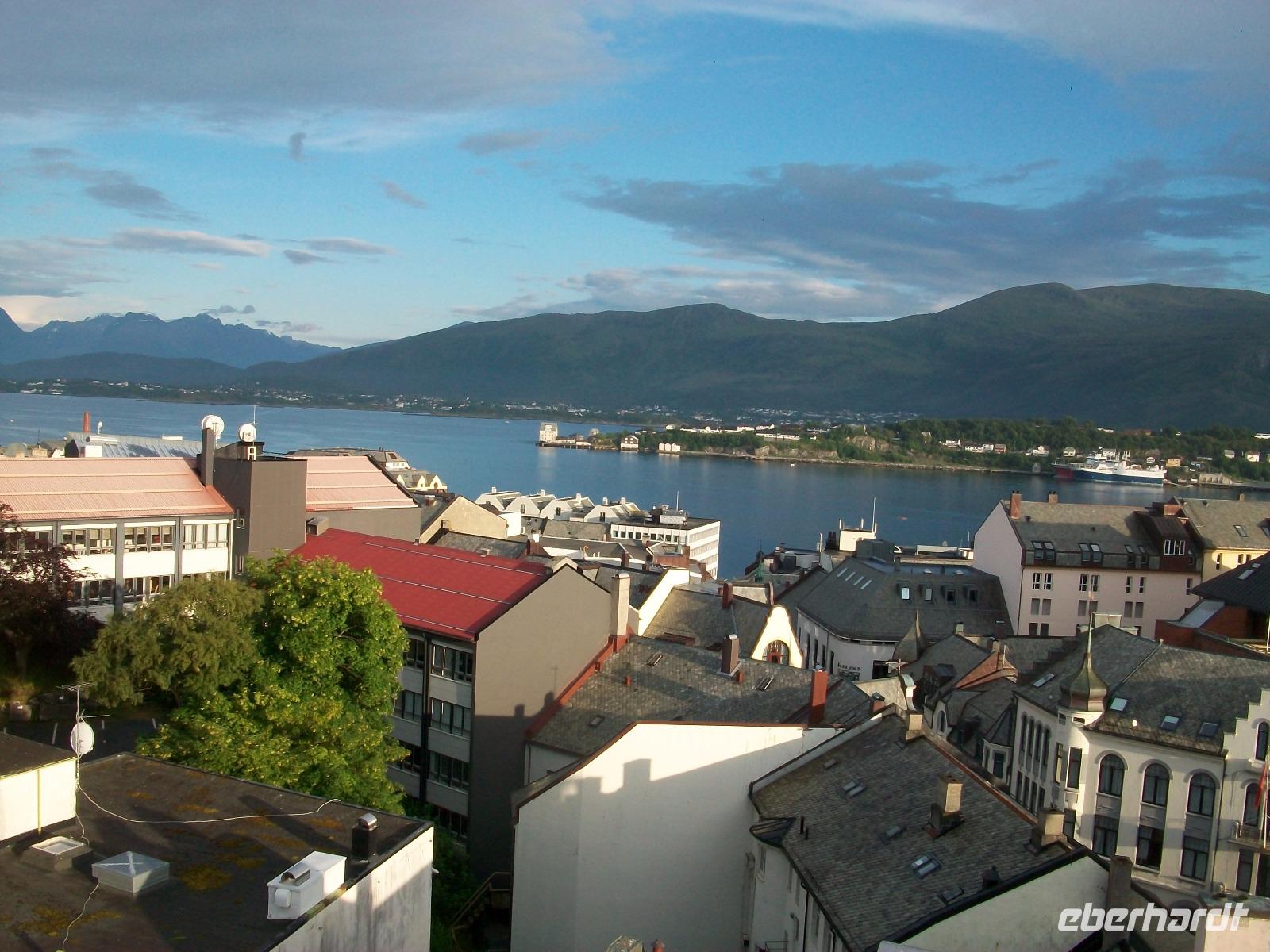 25.7.2017. Die Sonne lacht uns ins Gesicht bei der Fahrt hinauf zum Varden. Es ist der Hausberg von Molde und als wir oben anlangen, kann der Blick grandioser nicht sein! Unten am Meer liegt der Ort, im Hintergrund sind die schneebedeckten Spitzen der Romsdalalpen zu sehen und hinter uns dehnt sich die Wasserfläche des Atlantiks aus. Dazu eine himmlische Ruhe - ein schöner Auftakt des Tages.