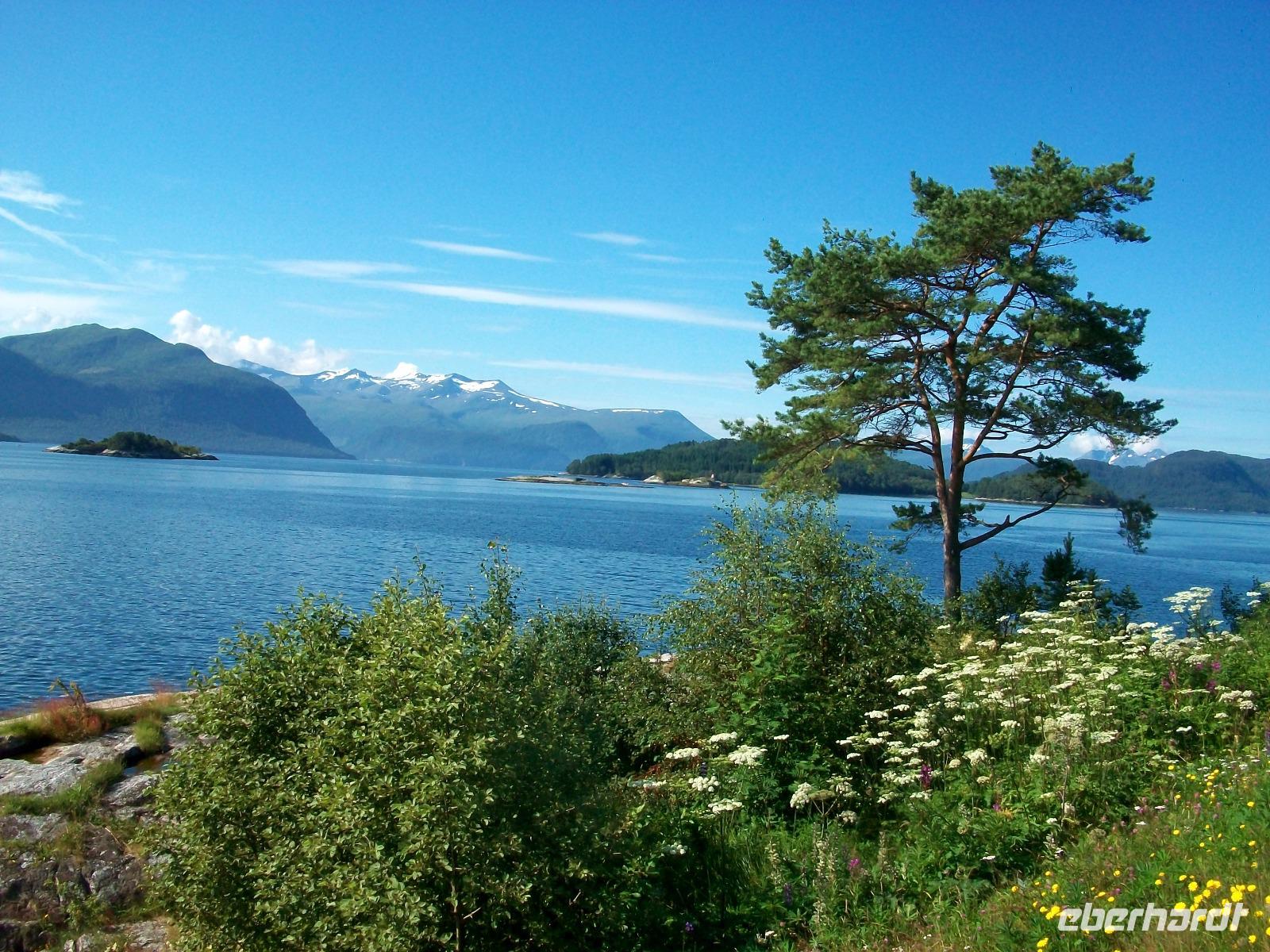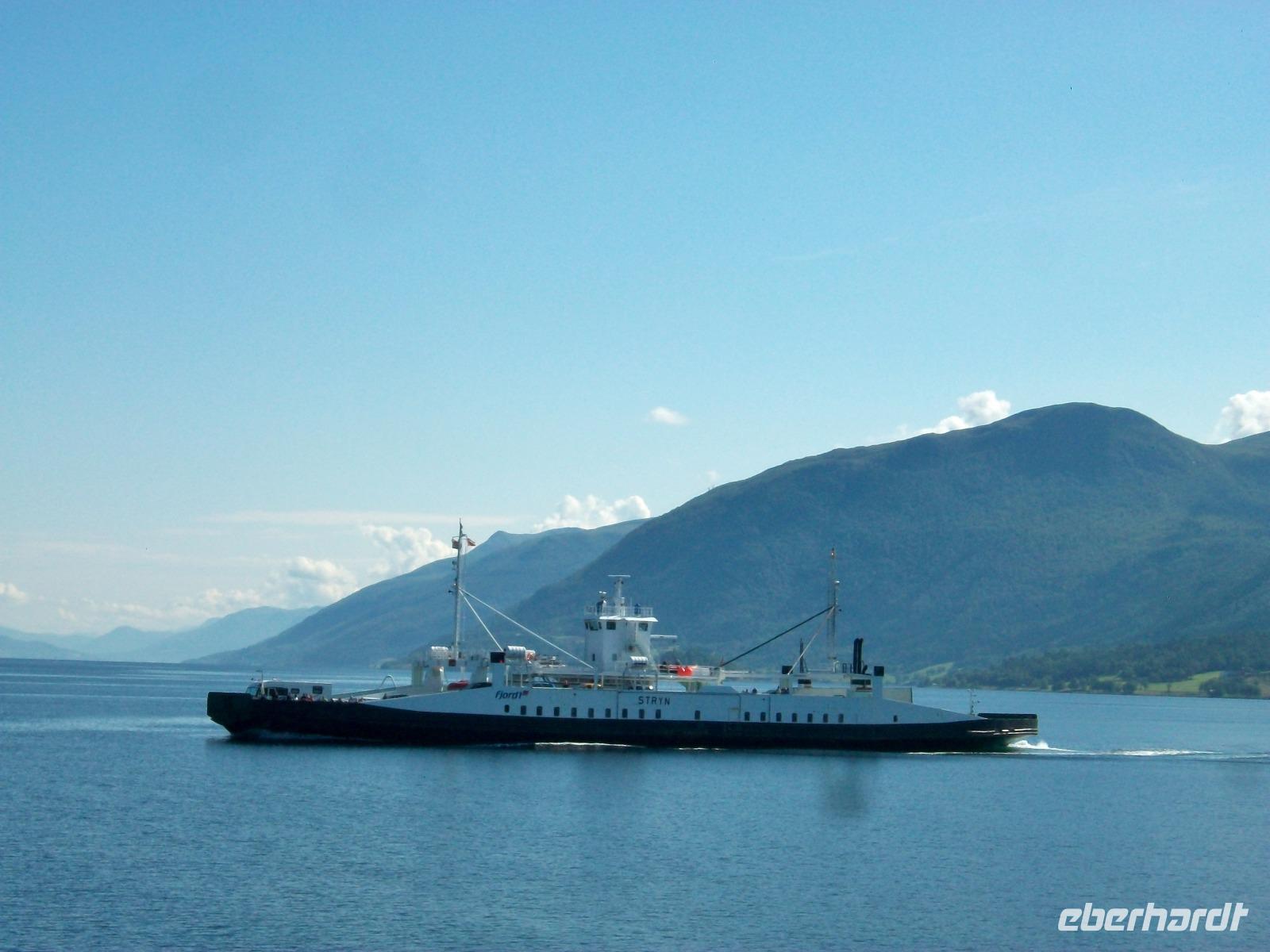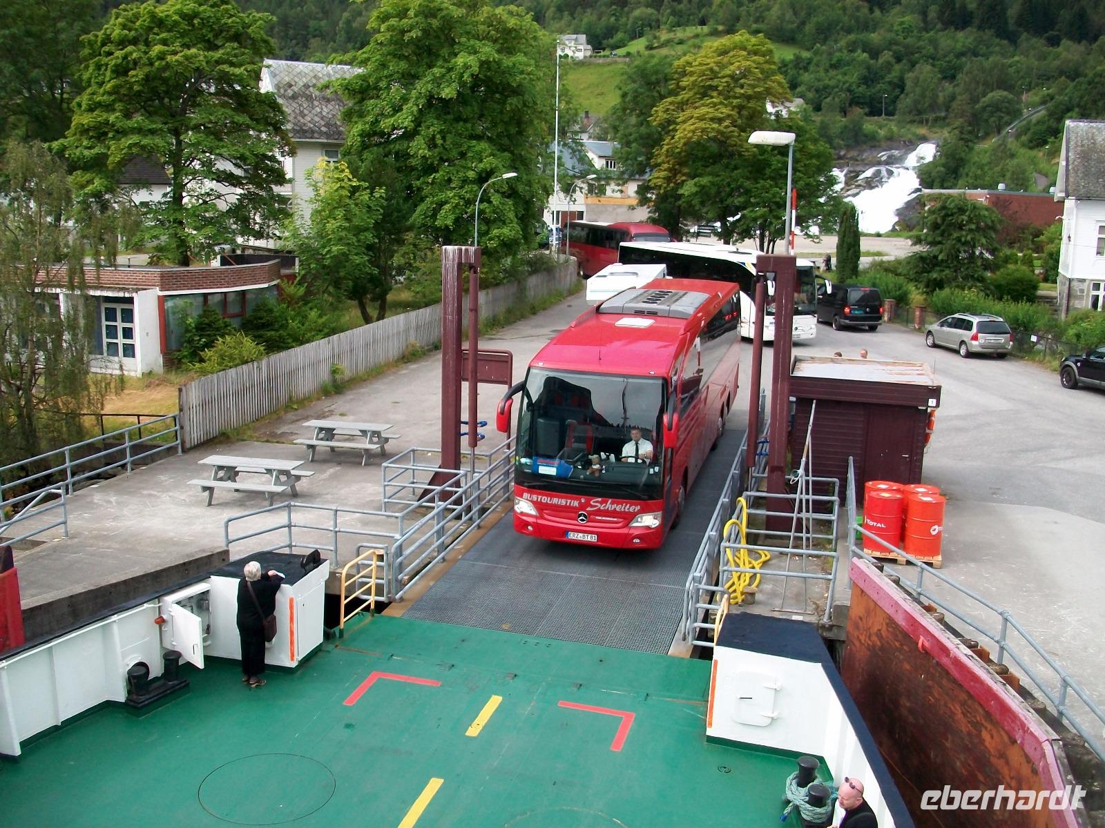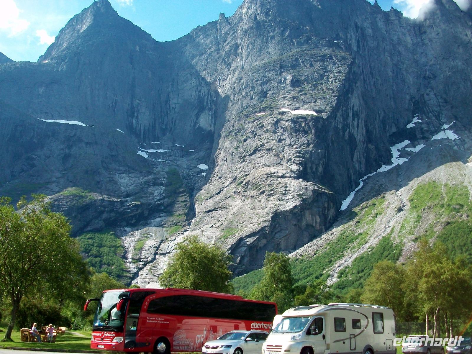 Dann geht es weiter in Richtung der Schneeberge; eine Fähre bringt uns über den Fjord und zu Füßen der mächtigen Trollwand, sie steigt einen Kilometer senkrecht an, genehmigen wir uns die Mittagspause.