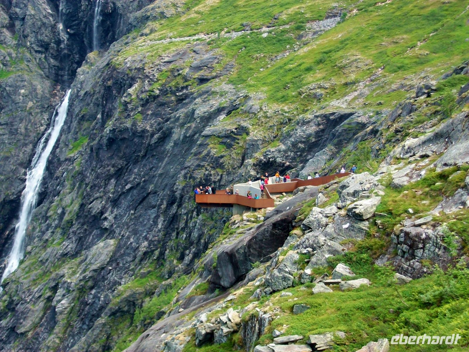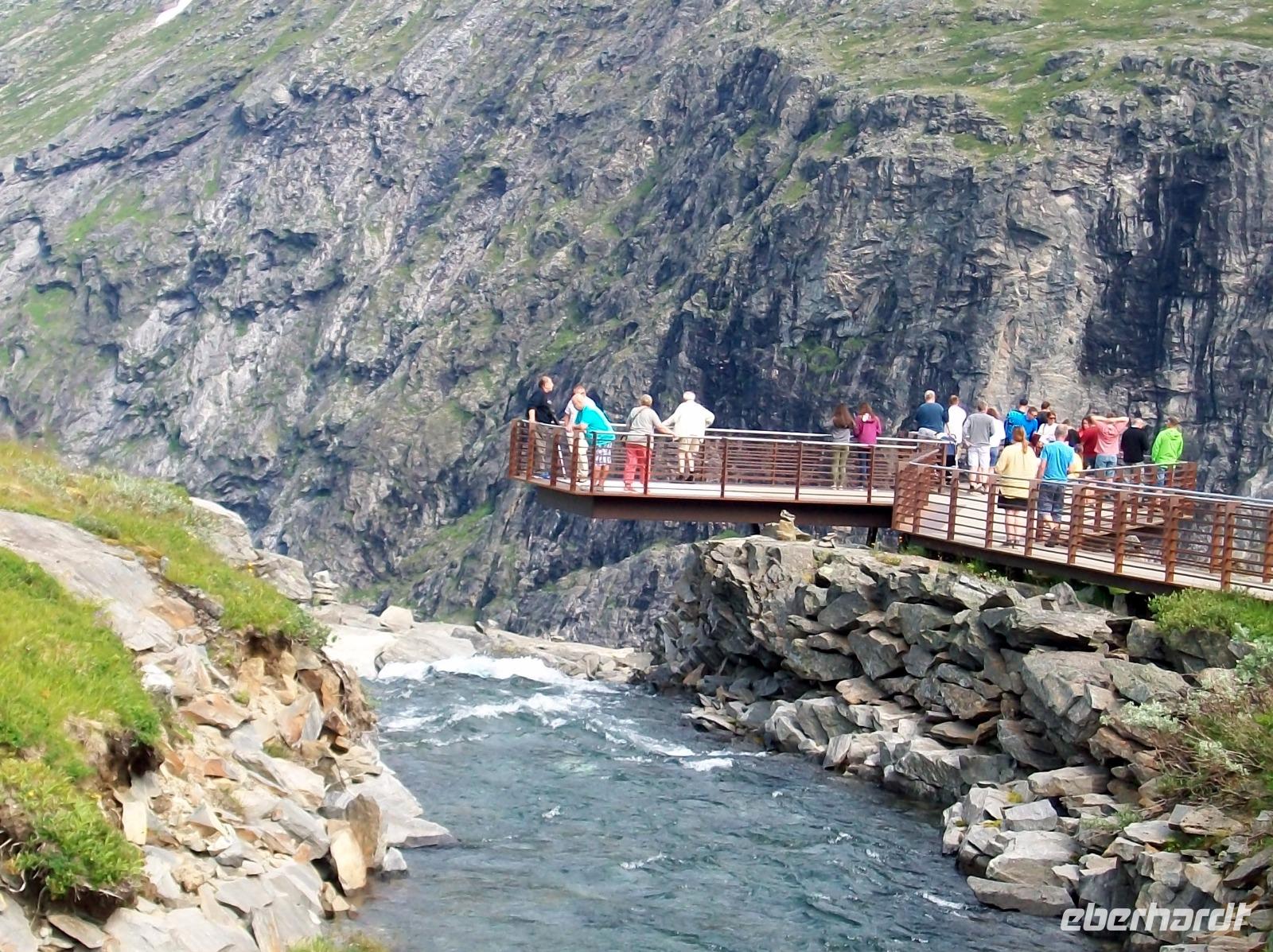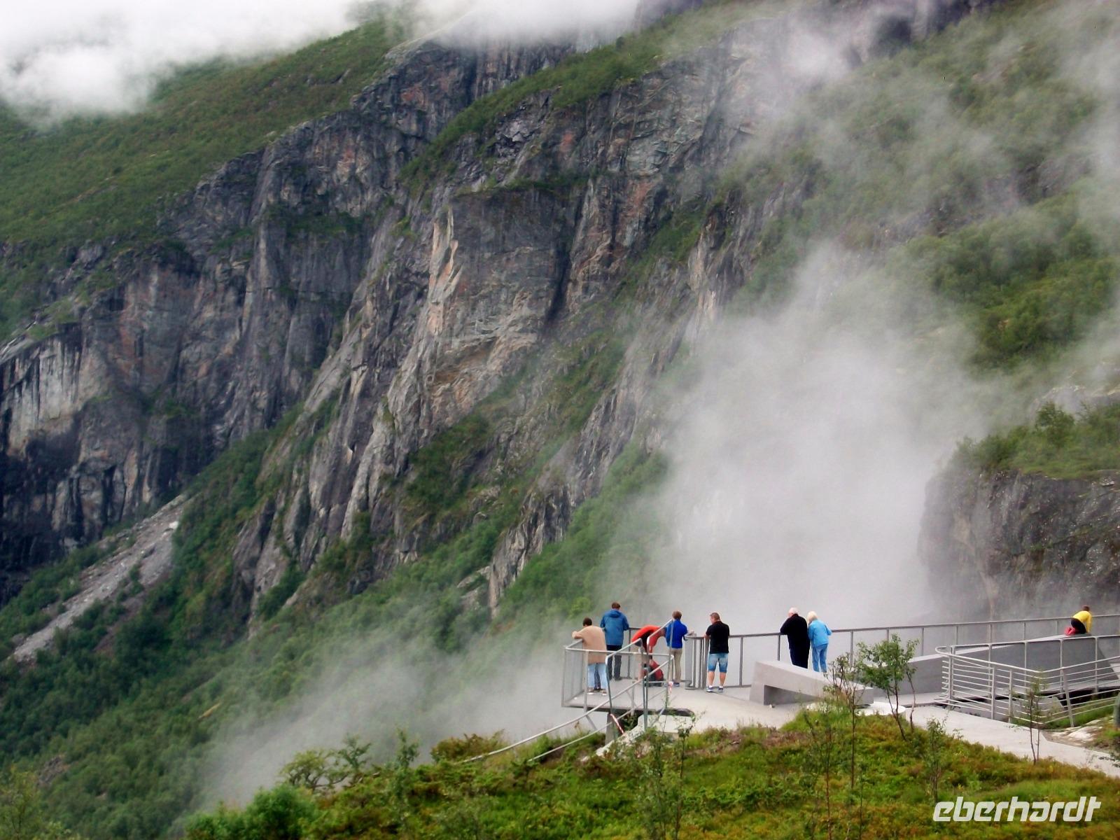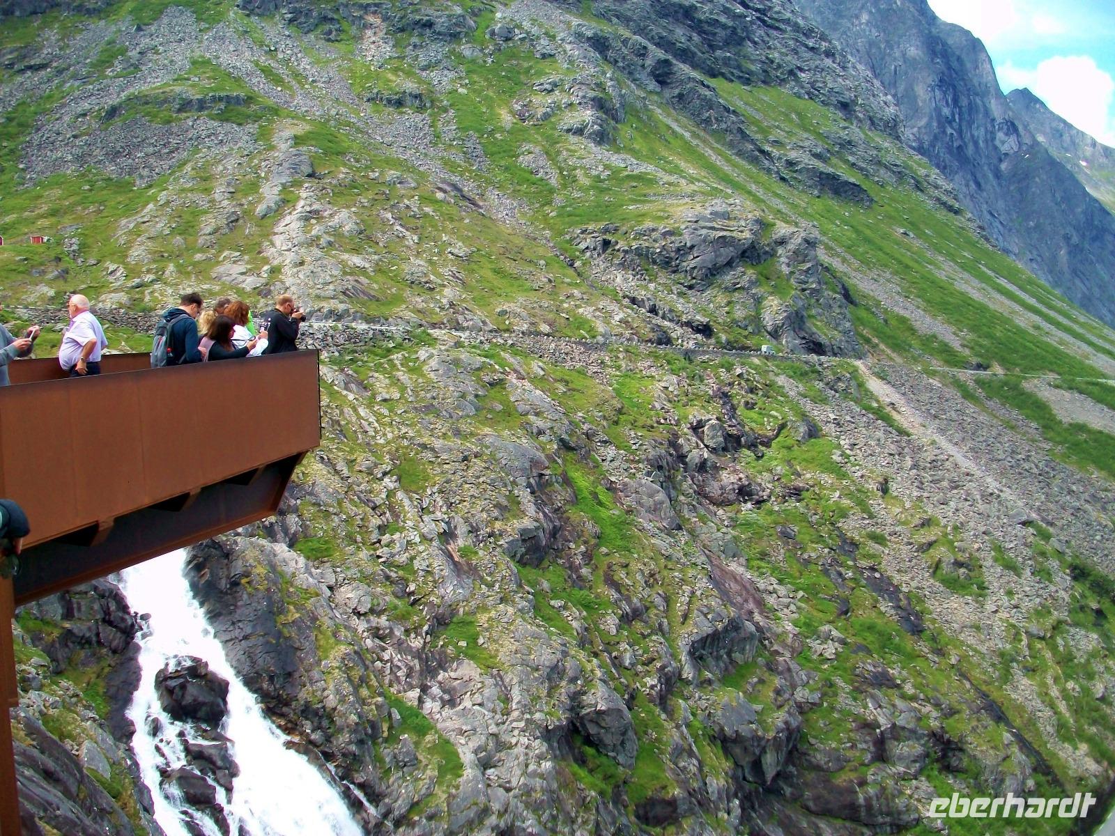 Vom Parkplatz führt uns der Weg zu den verschiedenen Aussichtspunkten die mit ihren abenteuerlichen Konstruktionen den Besucher über dem Abgrund schweben lassen. Der Blick kann dabei weit schweifen, vor uns das Tal von dem die Berge steil ansteigen, neben uns rauschen einige Wasserfälle zu Tal und über uns der blaue Himmel an dem weiße Wölkchen langsam ihre Bahn ziehen. Das sind die Wunder der Natur die Norwegen zum Traumland machen!