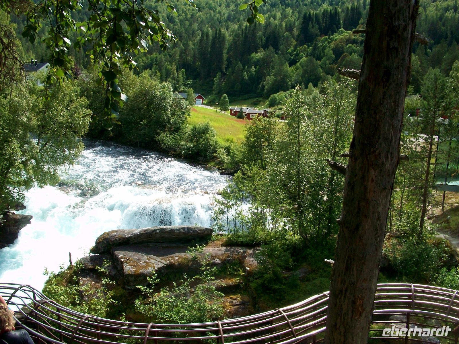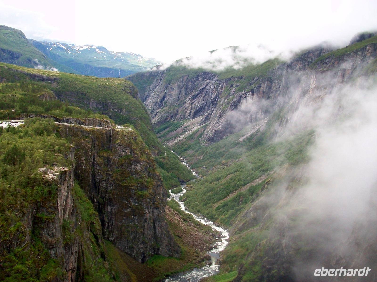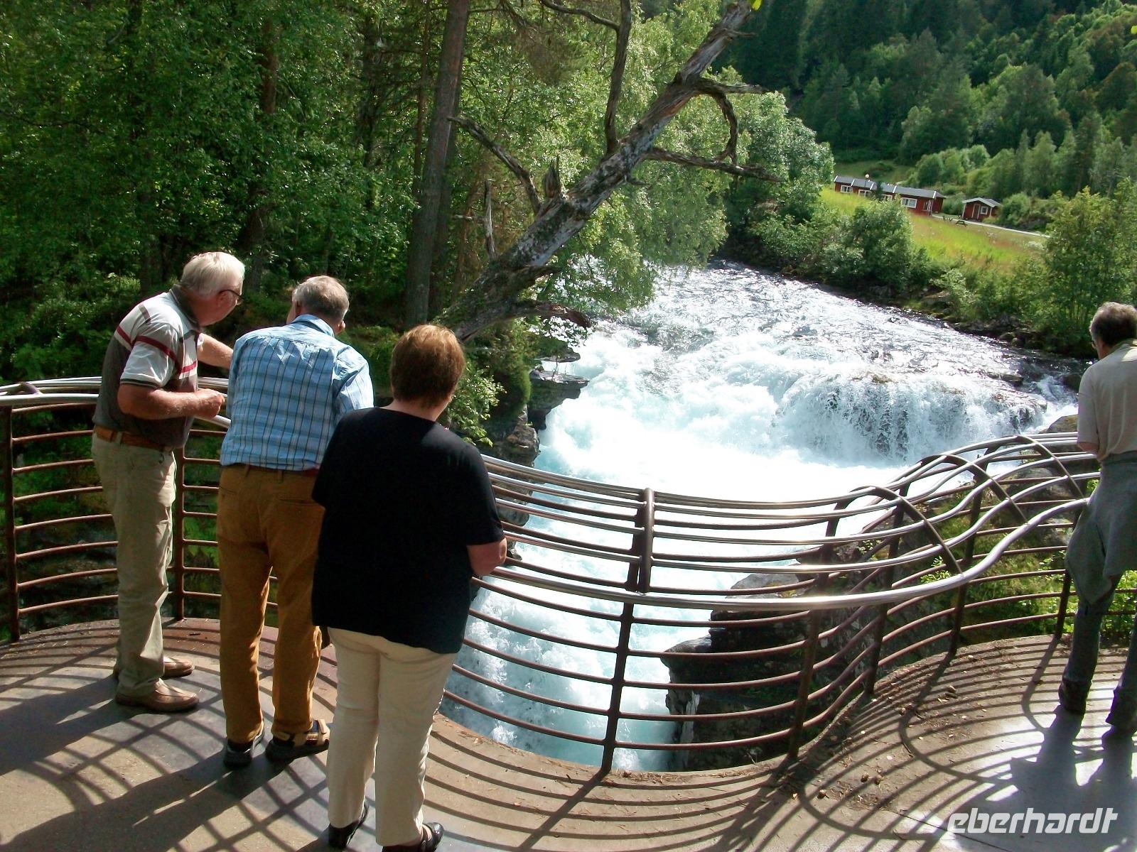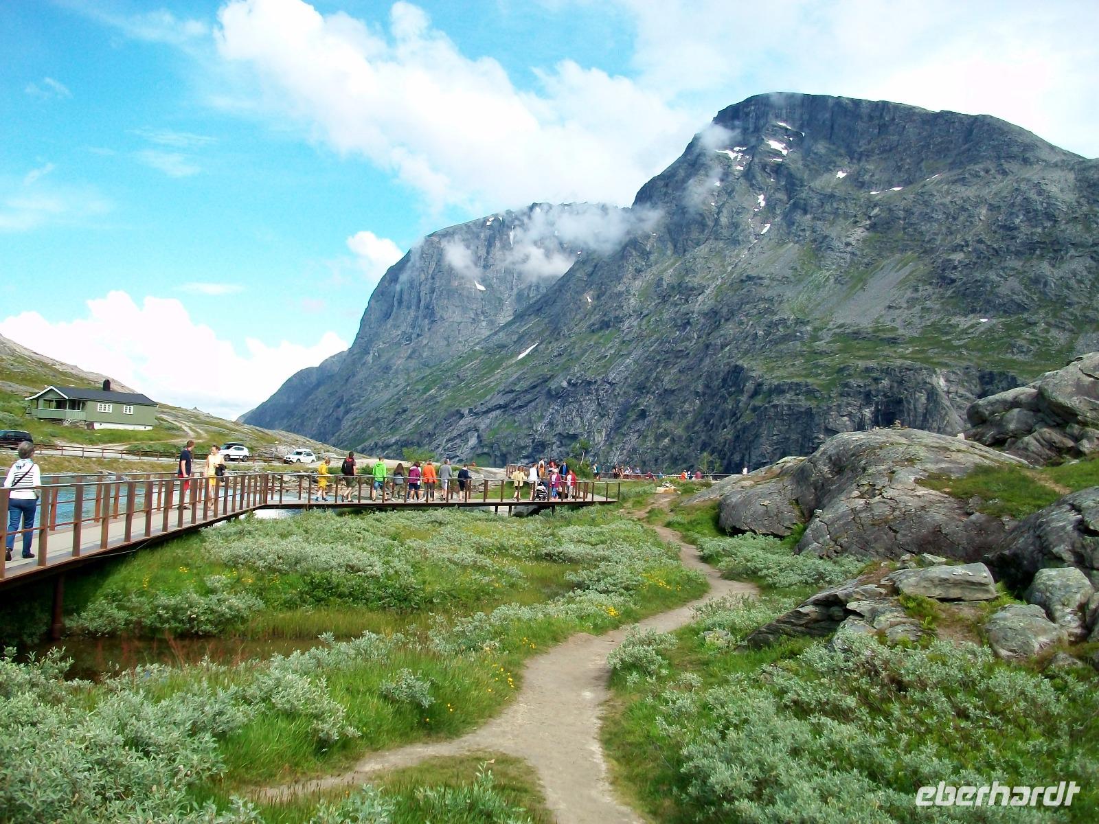 Vom Parkplatz führt uns der Weg zu den verschiedenen Aussichtspunkten die mit ihren abenteuerlichen Konstruktionen den Besucher über dem Abgrund schweben lassen. Der Blick kann dabei weit schweifen, vor uns das Tal von dem die Berge steil ansteigen, neben uns rauschen einige Wasserfälle zu Tal und über uns der blaue Himmel an dem weiße Wölkchen langsam ihre Bahn ziehen. Das sind die Wunder der Natur die Norwegen zum Traumland machen!