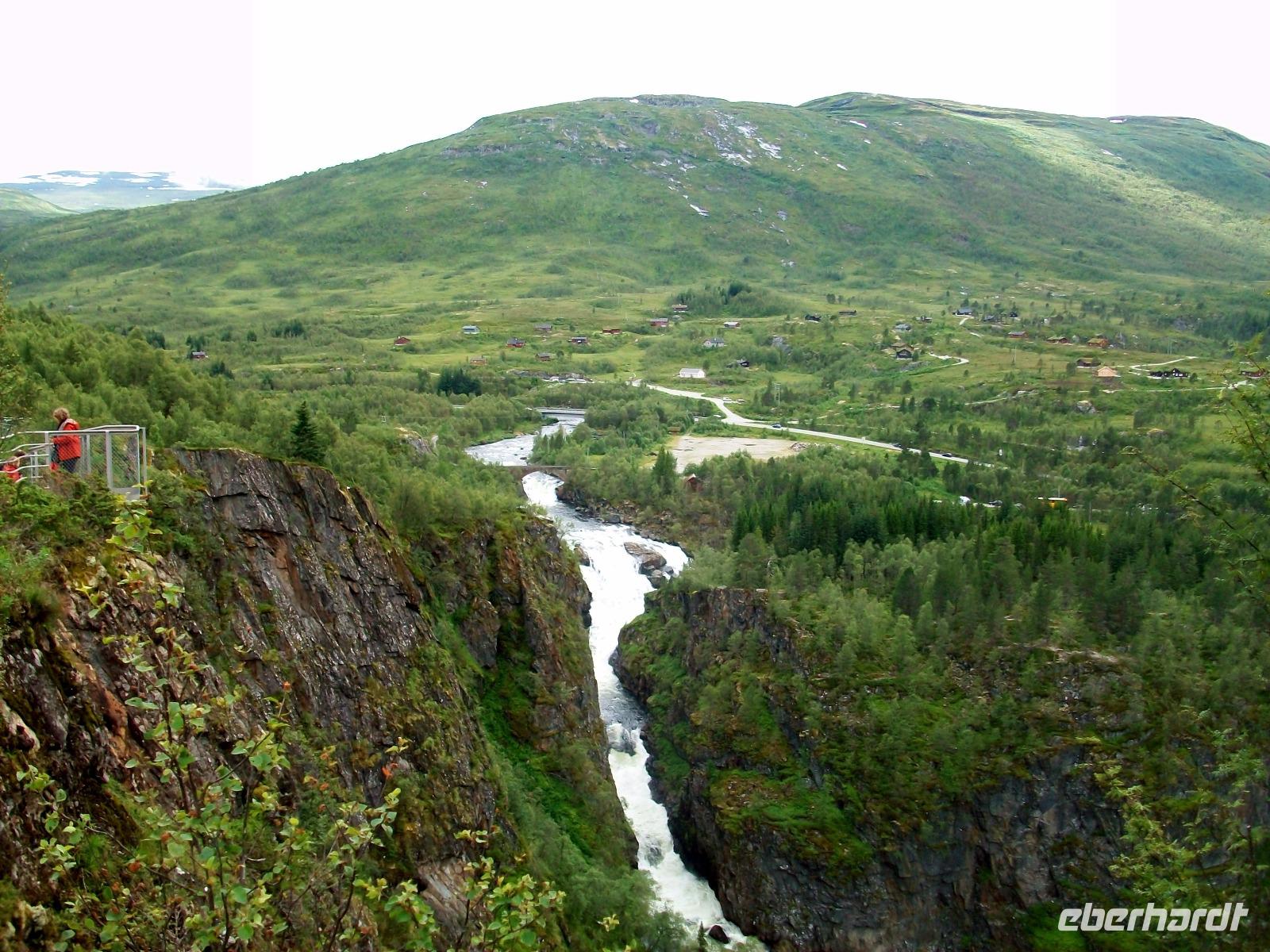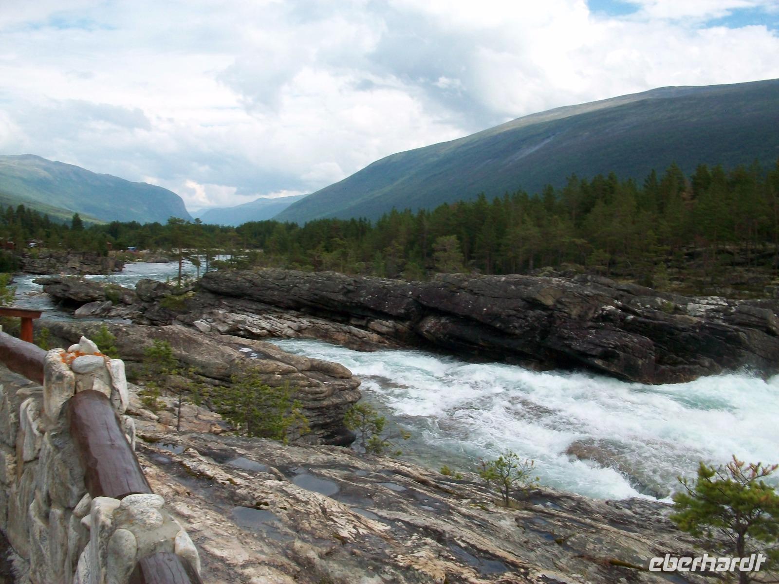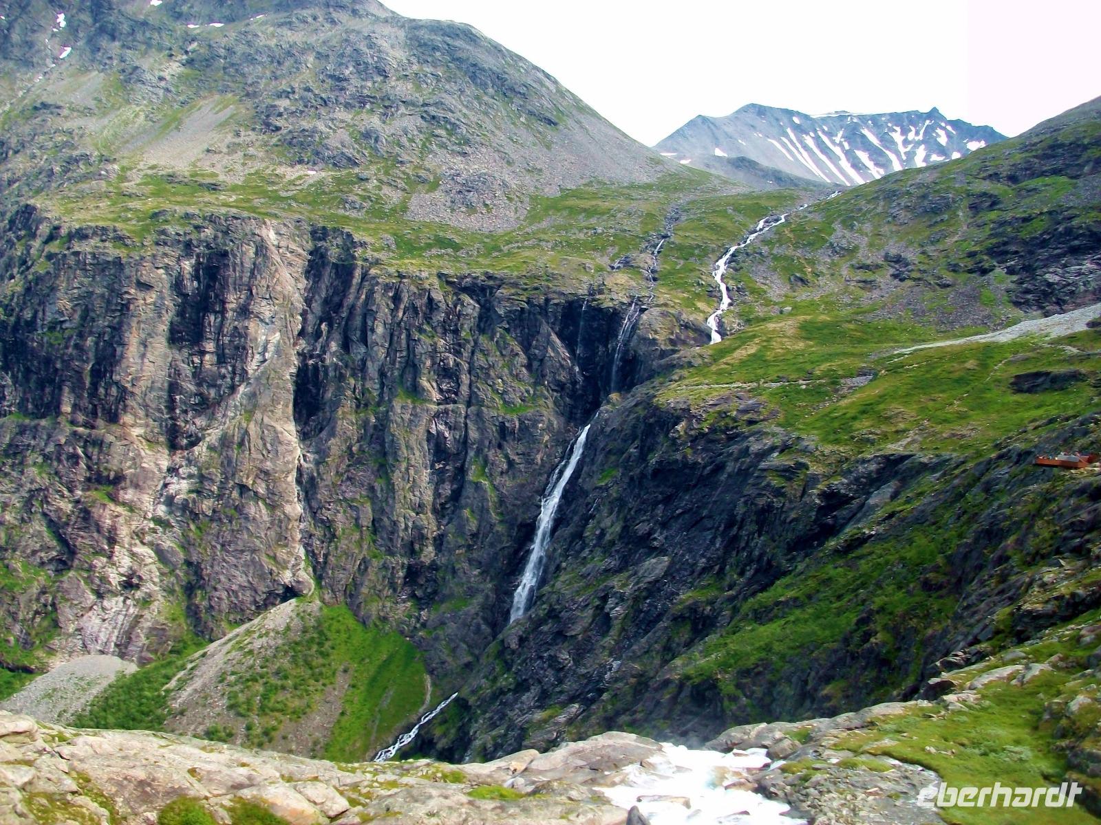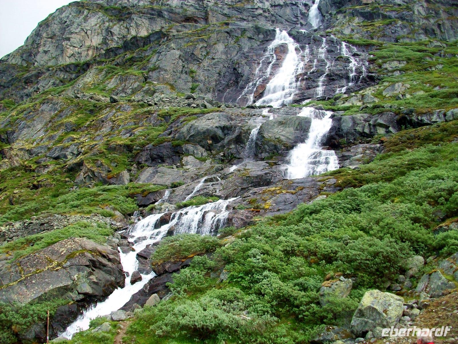 Vom Parkplatz führt uns der Weg zu den verschiedenen Aussichtspunkten die mit ihren abenteuerlichen Konstruktionen den Besucher über dem Abgrund schweben lassen. Der Blick kann dabei weit schweifen, vor uns das Tal von dem die Berge steil ansteigen, neben uns rauschen einige Wasserfälle zu Tal und über uns der blaue Himmel an dem weiße Wölkchen langsam ihre Bahn ziehen. Das sind die Wunder der Natur die Norwegen zum Traumland machen!