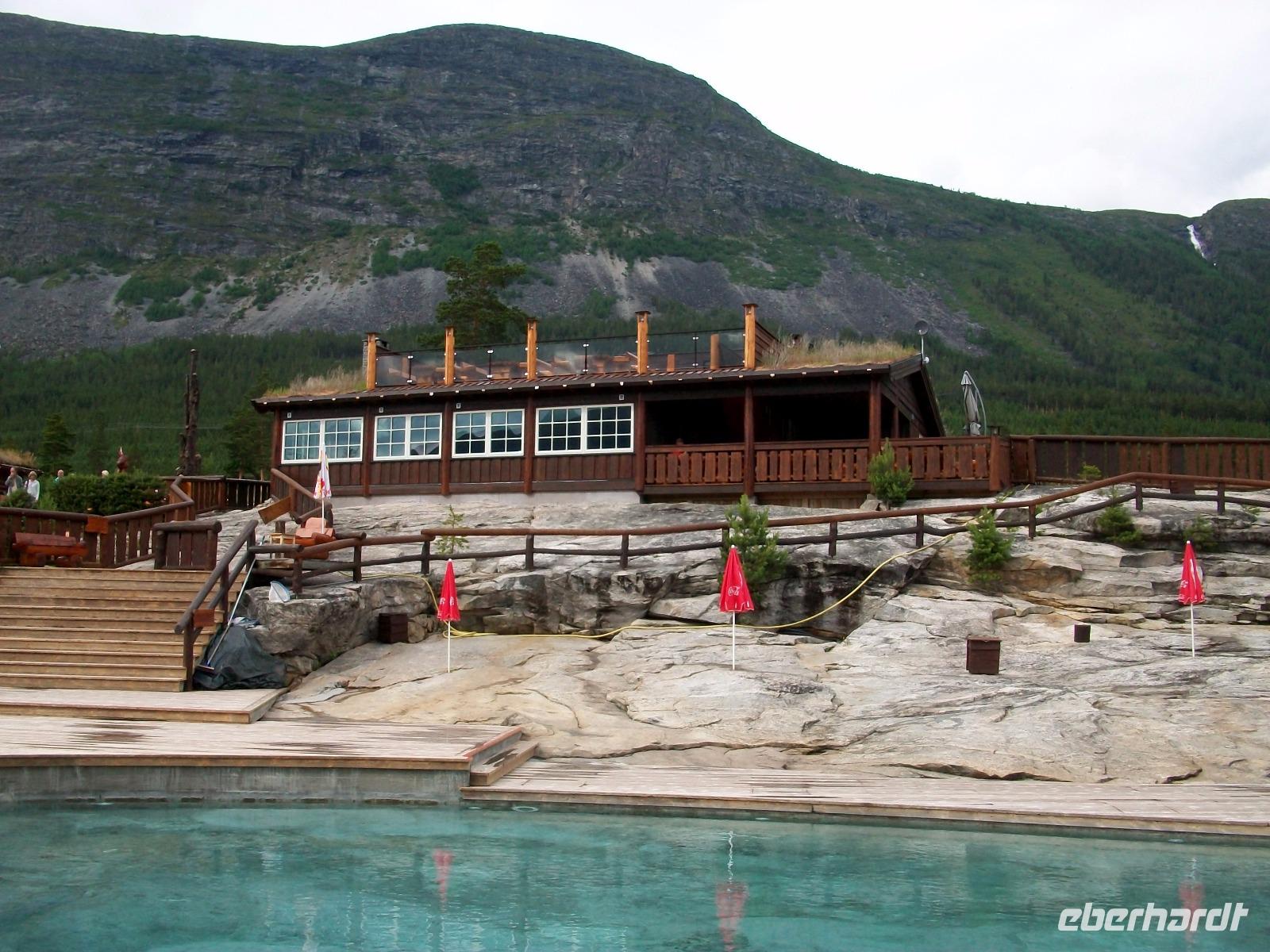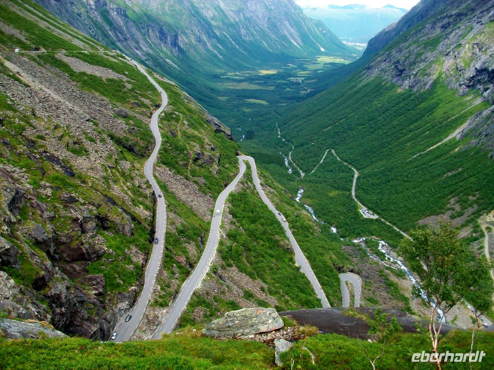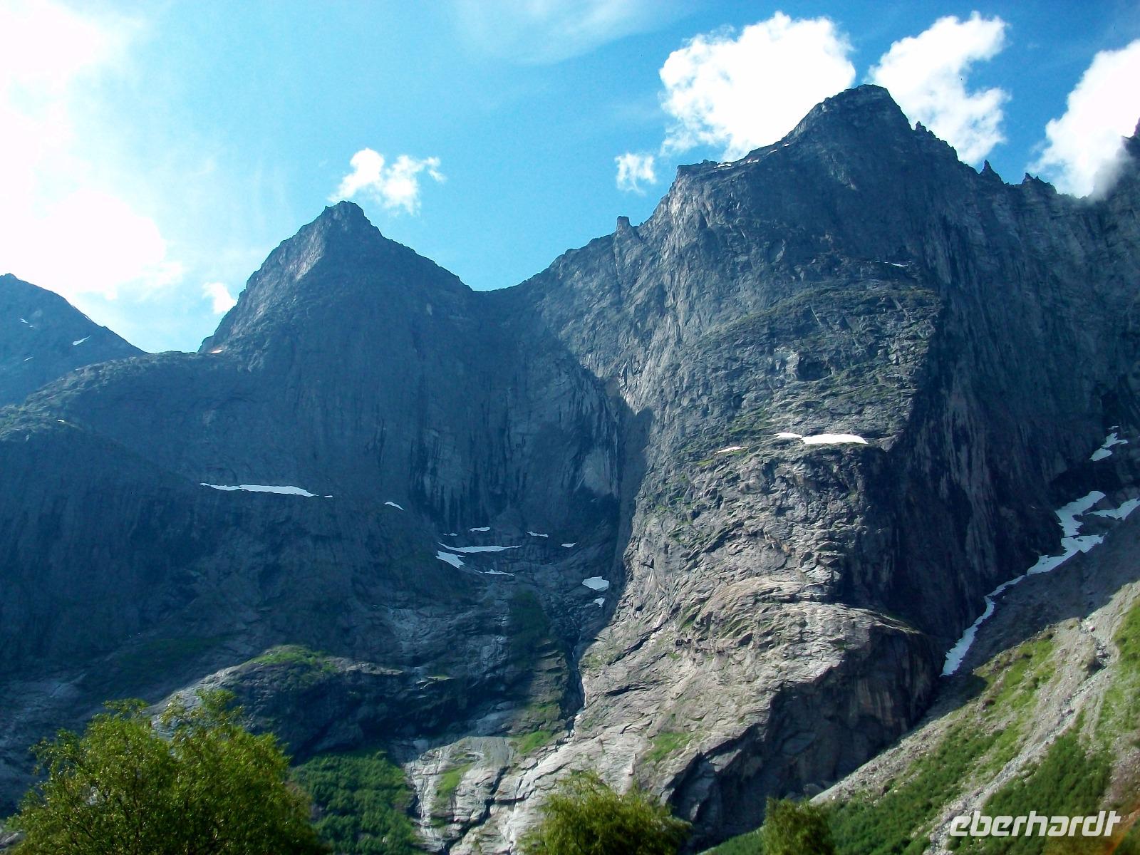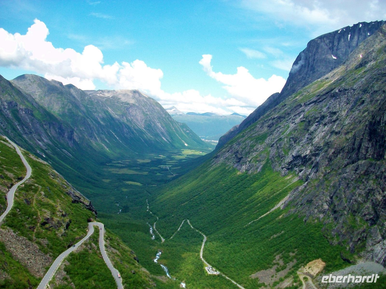 Vom Parkplatz führt uns der Weg zu den verschiedenen Aussichtspunkten die mit ihren abenteuerlichen Konstruktionen den Besucher über dem Abgrund schweben lassen. Der Blick kann dabei weit schweifen, vor uns das Tal von dem die Berge steil ansteigen, neben uns rauschen einige Wasserfälle zu Tal und über uns der blaue Himmel an dem weiße Wölkchen langsam ihre Bahn ziehen. Das sind die Wunder der Natur die Norwegen zum Traumland machen!
