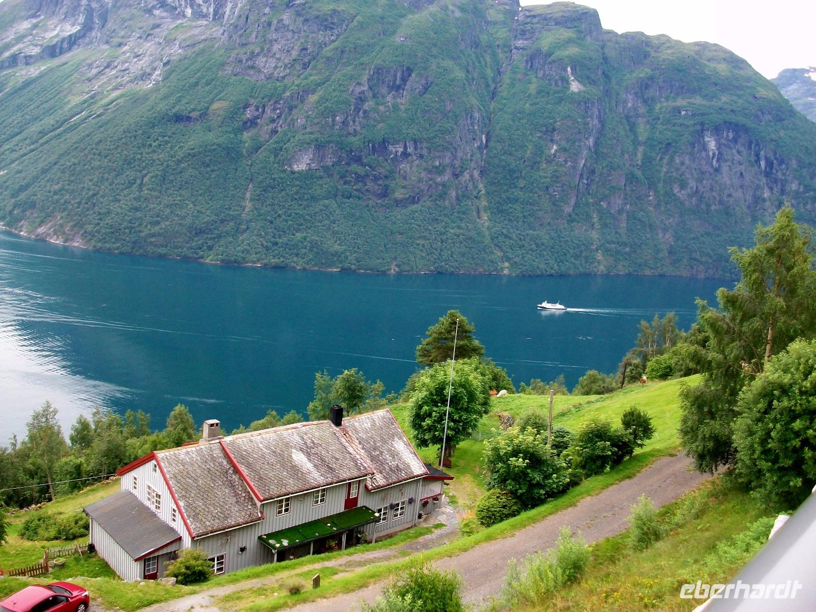 26.7.2017. Nach einem kräftigen Regenguss in der Nacht zeigt sich uns der skandinavische Himmel an diesem Morgen wieder von seiner schönsten Seite. Wir gelangen von Ålesund zur Fähre nach Manheller und von hier entlang des Wassers und der grünen Täler, in denen manch Kuhherde grast, zum „Fjord der Fjorde". Über hundert Meter über dem Wasser zeigt sich uns zum ersten Mal auf dieser Tour der Geirangerfjord. Eben verlässt ein Schiff den Hafen; wir sehen es spielzeugklein in den Fjord einschwenken, das macht Appetit auf diese besondere Schiffstour die auch wir eine Stunde später genießen können.