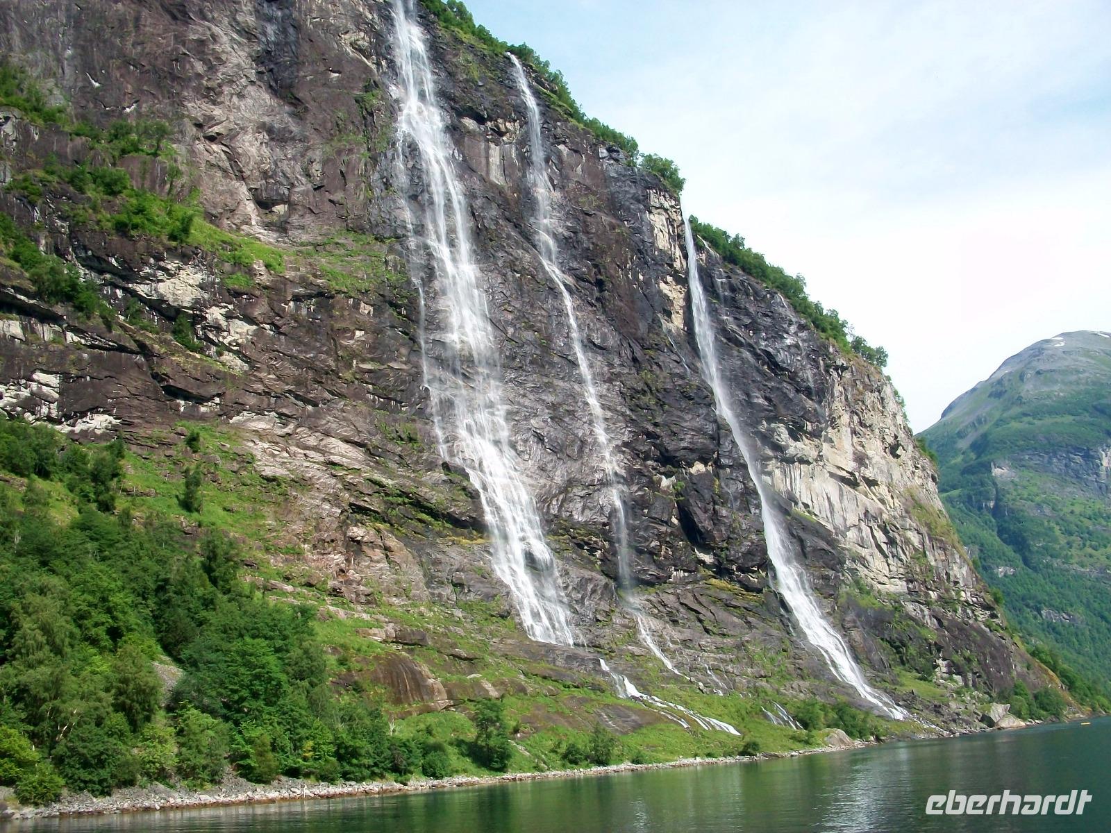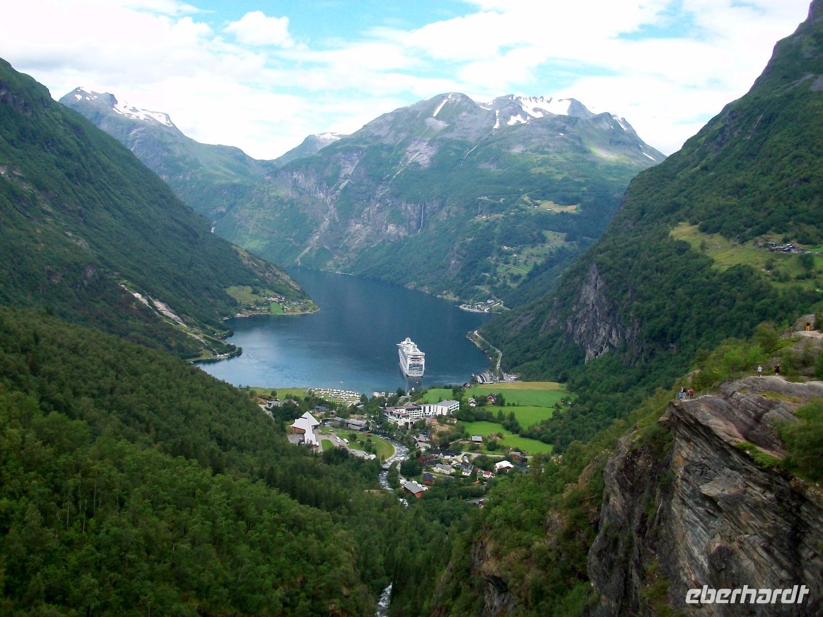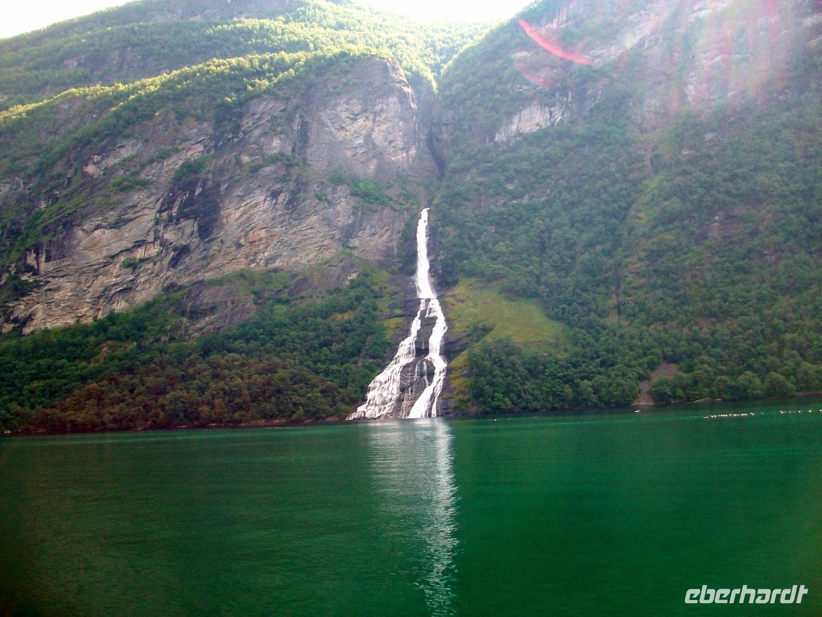 Das Schiff legt ab; schnell sind wir im Geirangerfjord angelangt, steil steigen die Berge vom Wasser aus an und wir kommen uns ob dieser beeindruckenden Natur irgendwie hilflos vor. Links rauscht der geteilte Wasserfall der „Sieben Schwestern" zu Tal, rechts wirbt der „Freier", auch ein Wasserfall, um die Schönen und im wahren Wortsinne endet diese Schifffahrt im Ort Geiranger legendär.