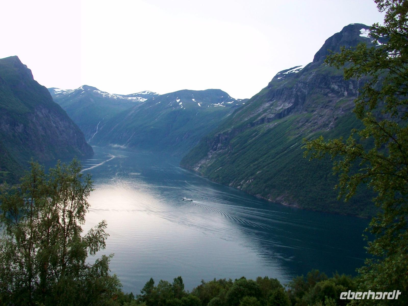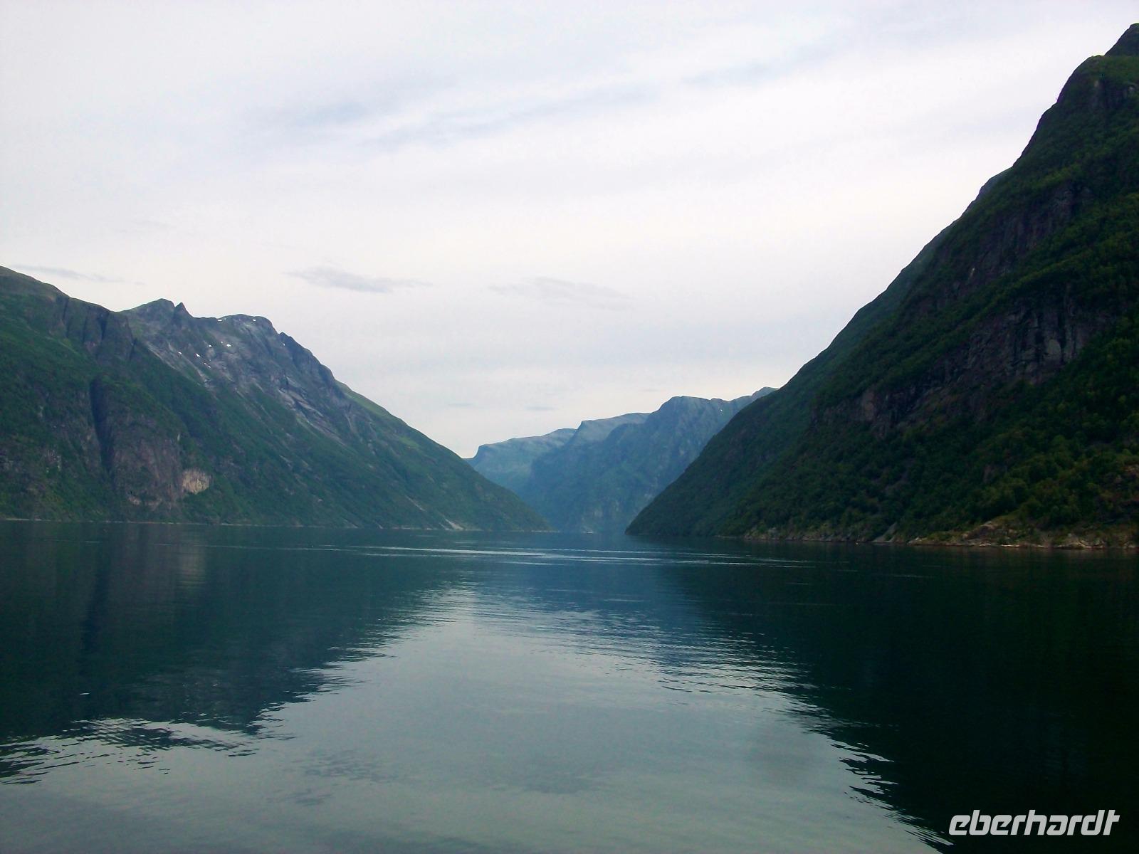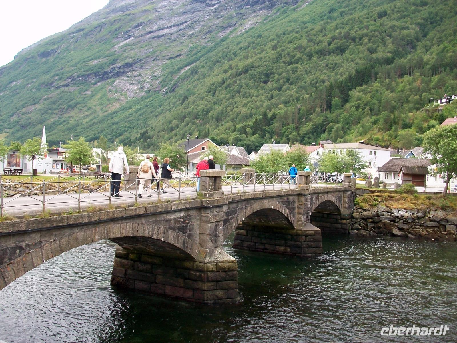 Das Schiff legt ab; schnell sind wir im Geirangerfjord angelangt, steil steigen die Berge vom Wasser aus an und wir kommen uns ob dieser beeindruckenden Natur irgendwie hilflos vor. Links rauscht der geteilte Wasserfall der „Sieben Schwestern" zu Tal, rechts wirbt der „Freier", auch ein Wasserfall, um die Schönen und im wahren Wortsinne endet diese Schifffahrt im Ort Geiranger legendär.