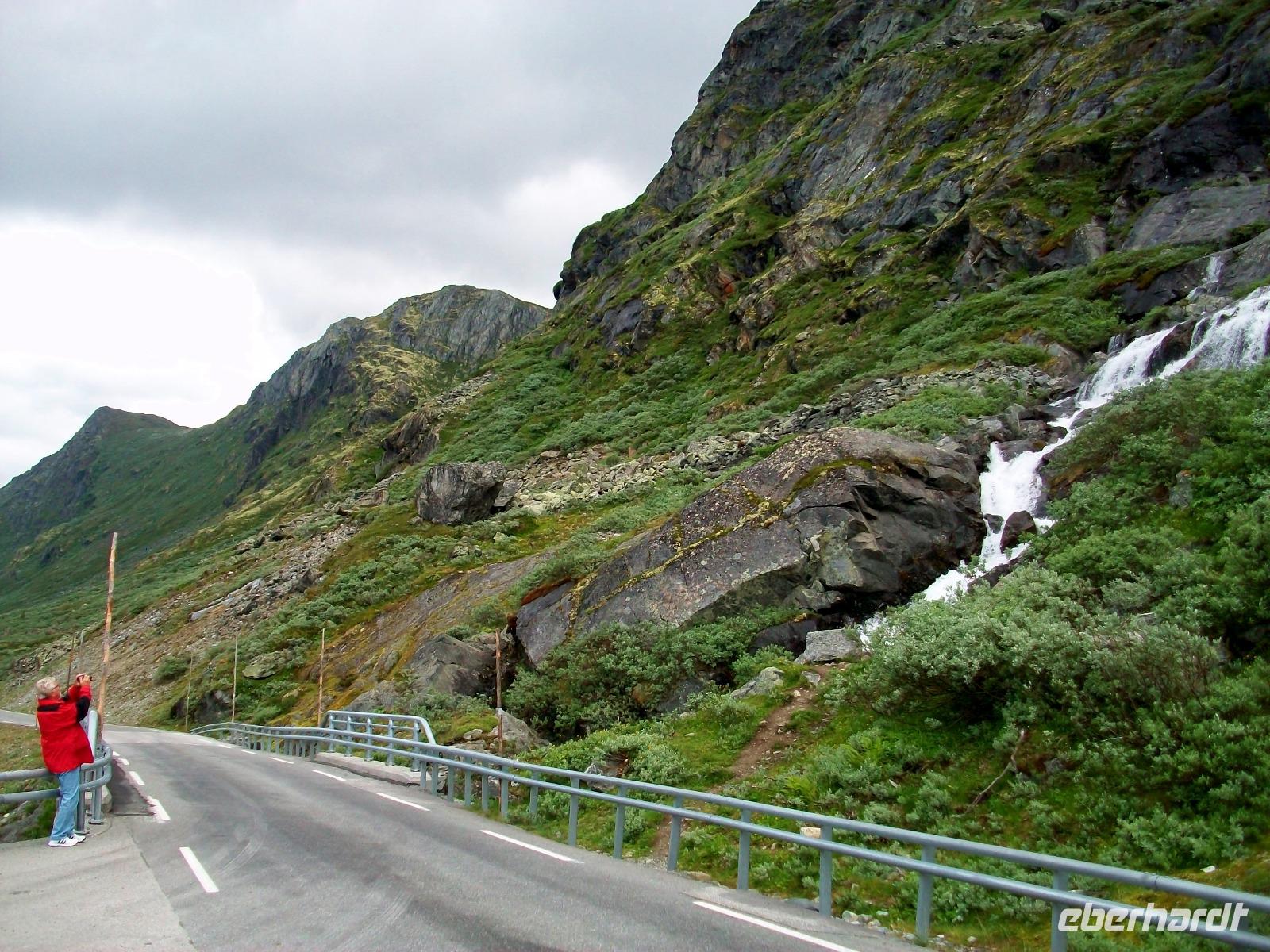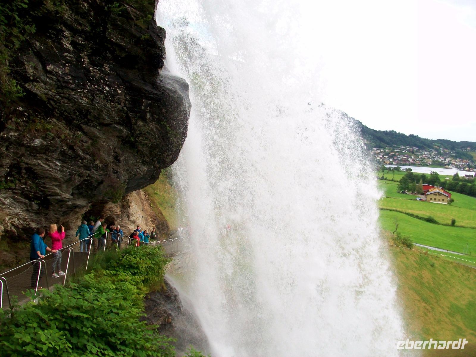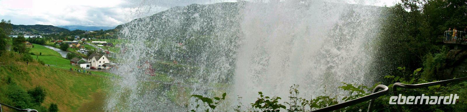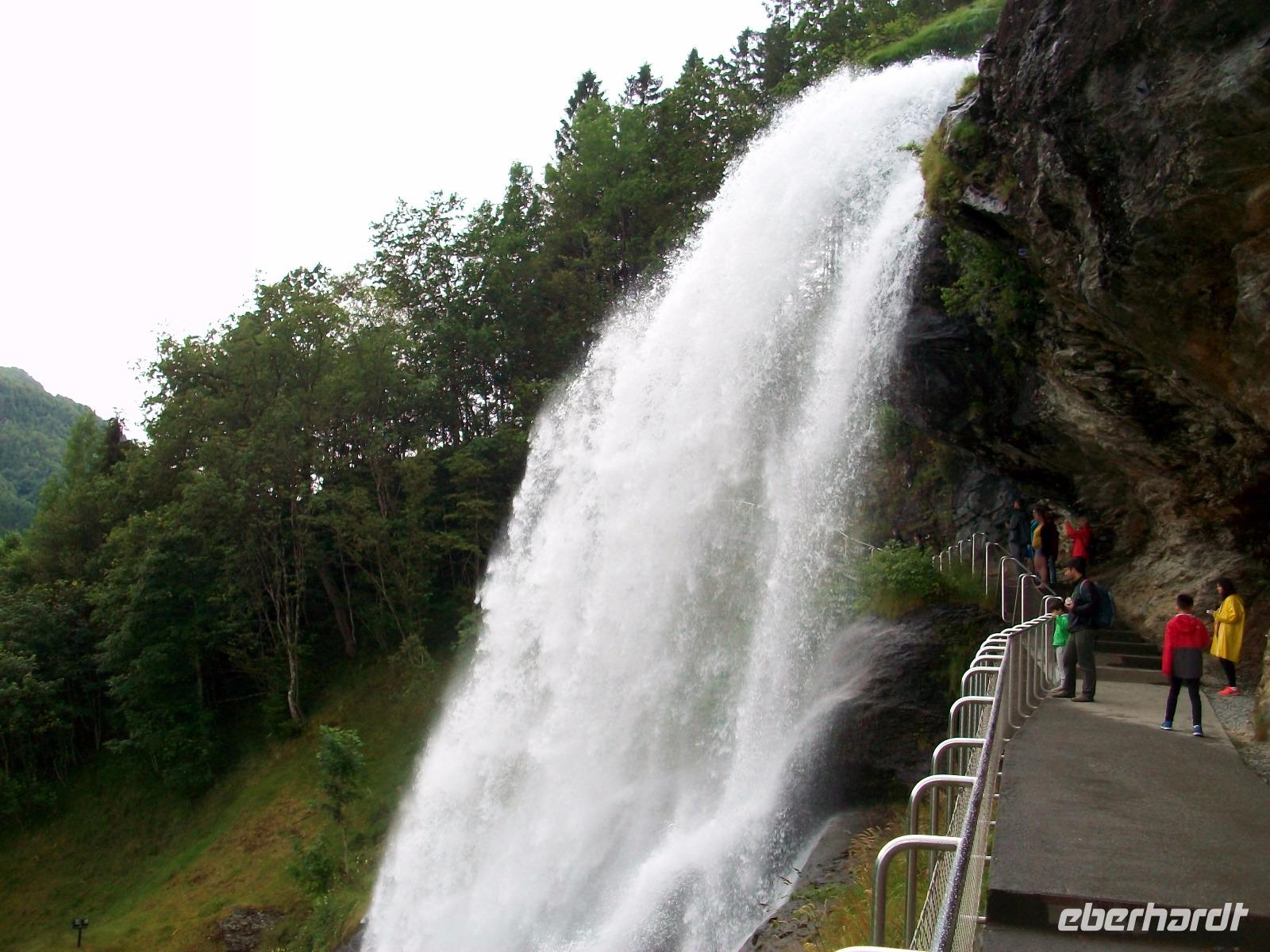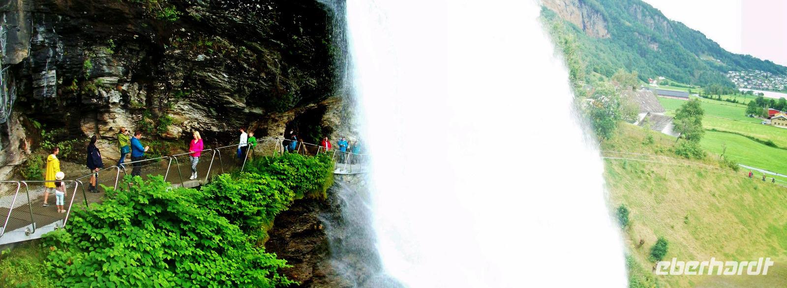 Zunächst geht es über Land; bald sehen wir zu unserer Linken einen weiteren Wasserfall der zu den Berühmtesten von Norwegen zählt. Es ist der Steindalfoss und das Besondere ist, der Besucher kann hinter den Wasserfall treten und durch den Schleier hinunter zur Straße schauen. Der Aufstieg hat sich gelohnt, so etwas Spektakuläres sieht man nun wirklich nicht jeden Tag!