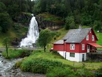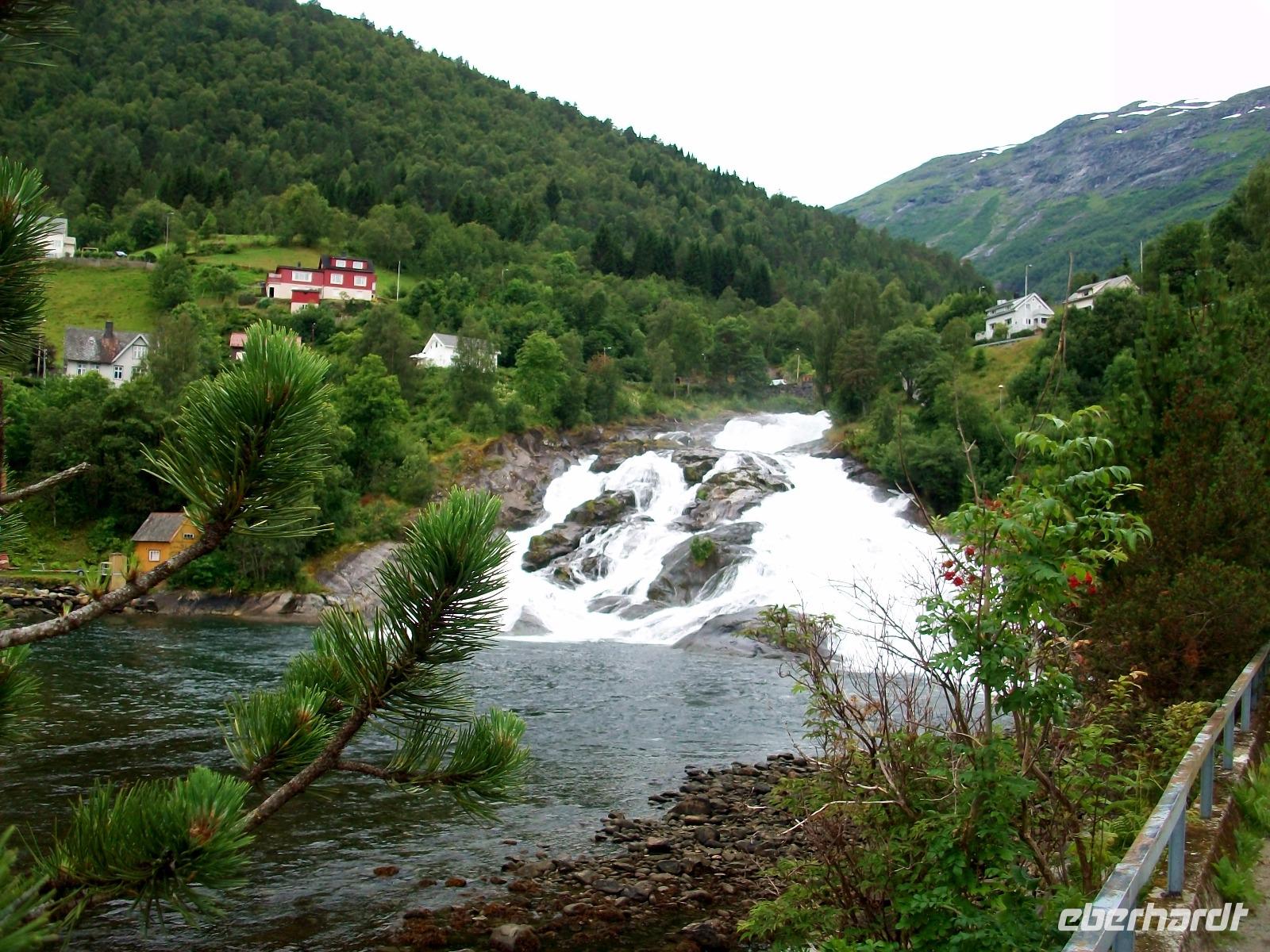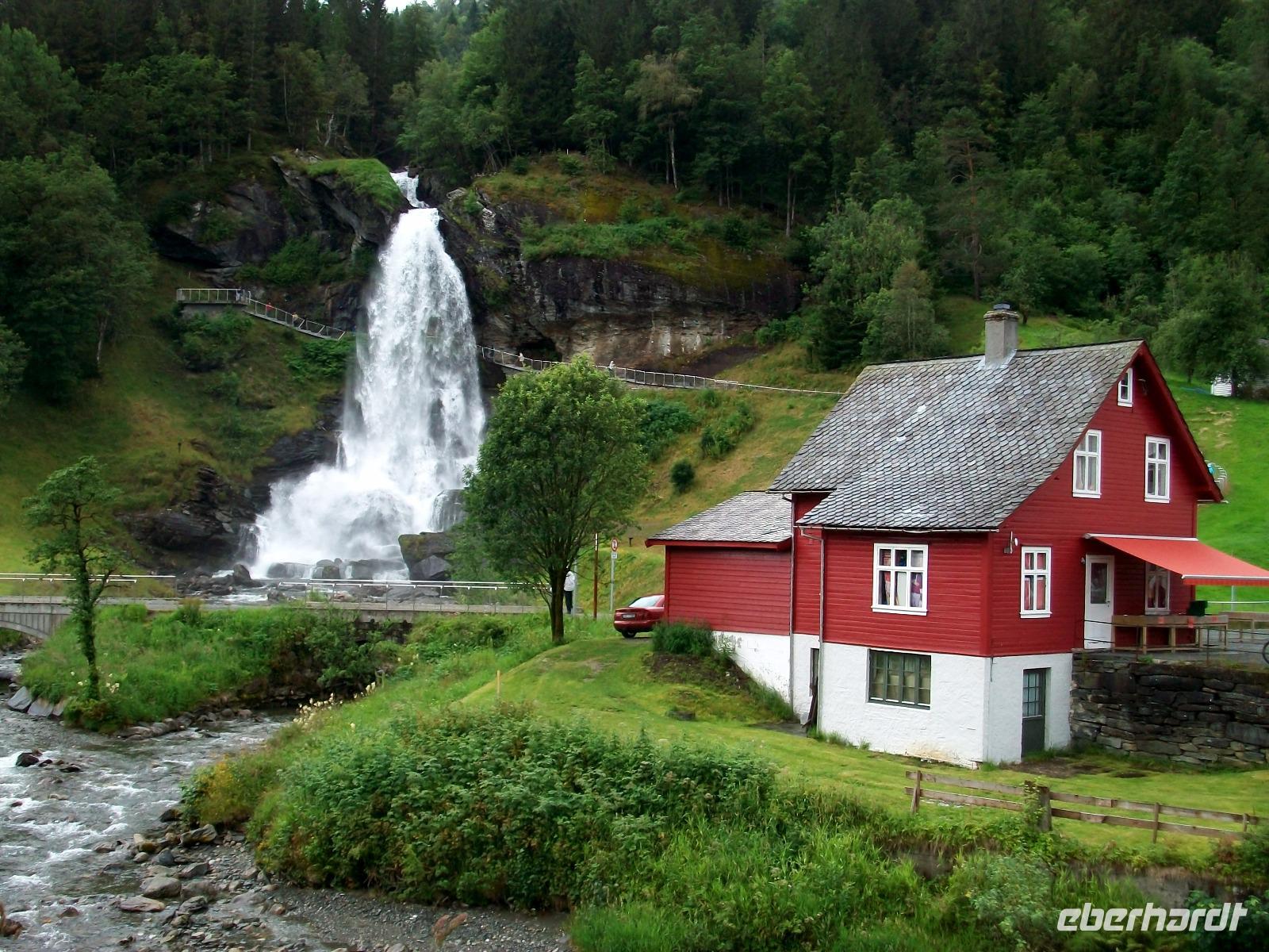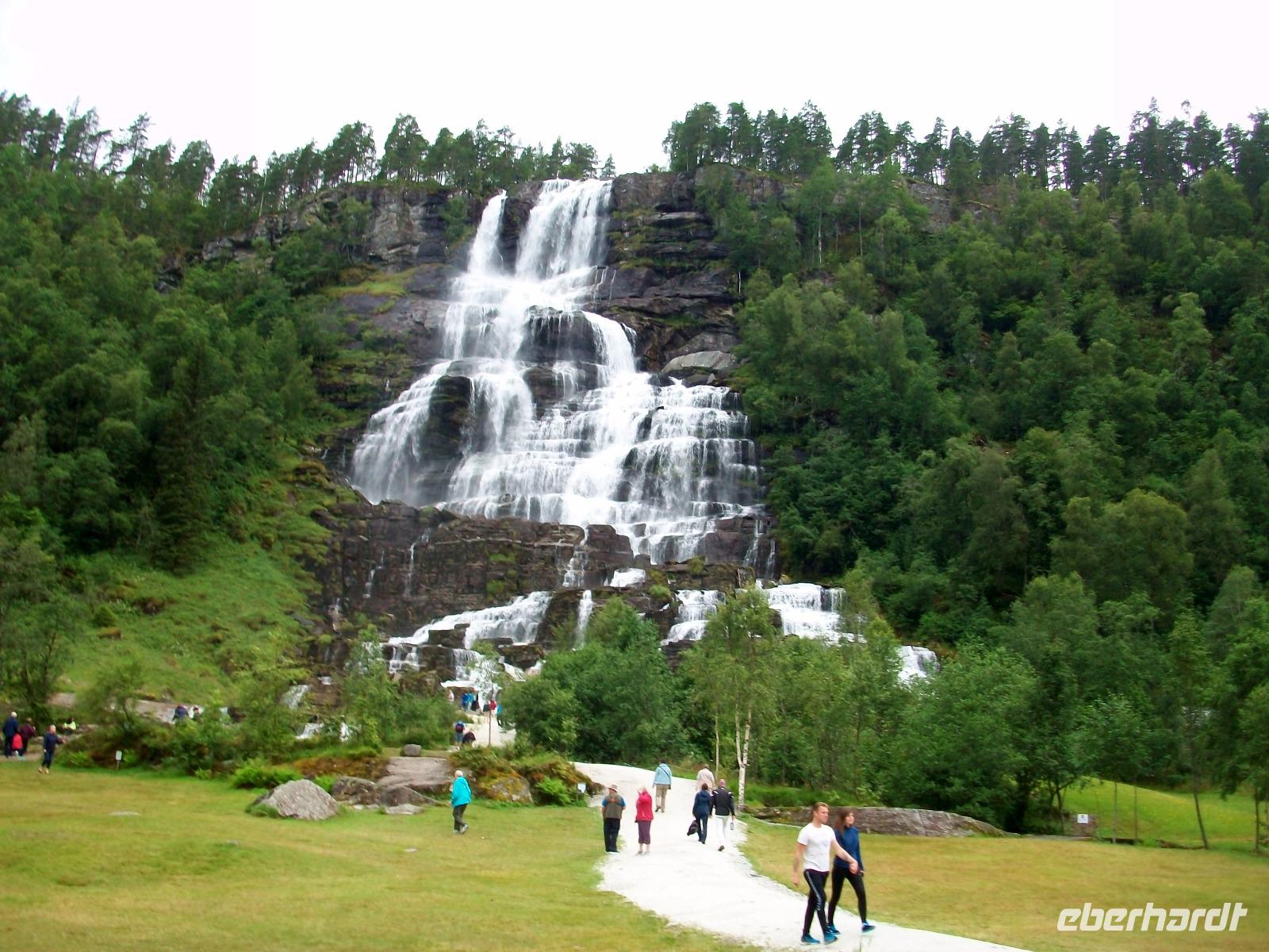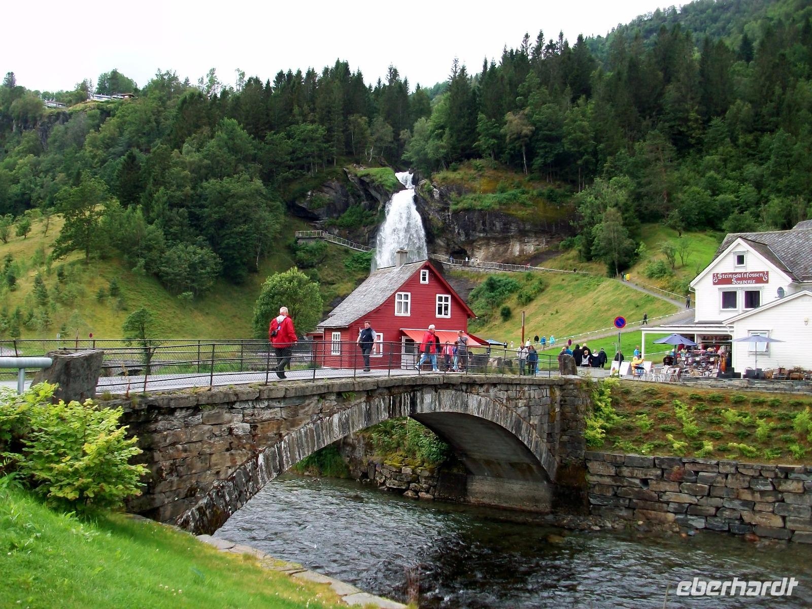 Zunächst geht es über Land; bald sehen wir zu unserer Linken einen weiteren Wasserfall der zu den Berühmtesten von Norwegen zählt. Es ist der Steindalfoss und das Besondere ist, der Besucher kann hinter den Wasserfall treten und durch den Schleier hinunter zur Straße schauen. Der Aufstieg hat sich gelohnt, so etwas Spektakuläres sieht man nun wirklich nicht jeden Tag!