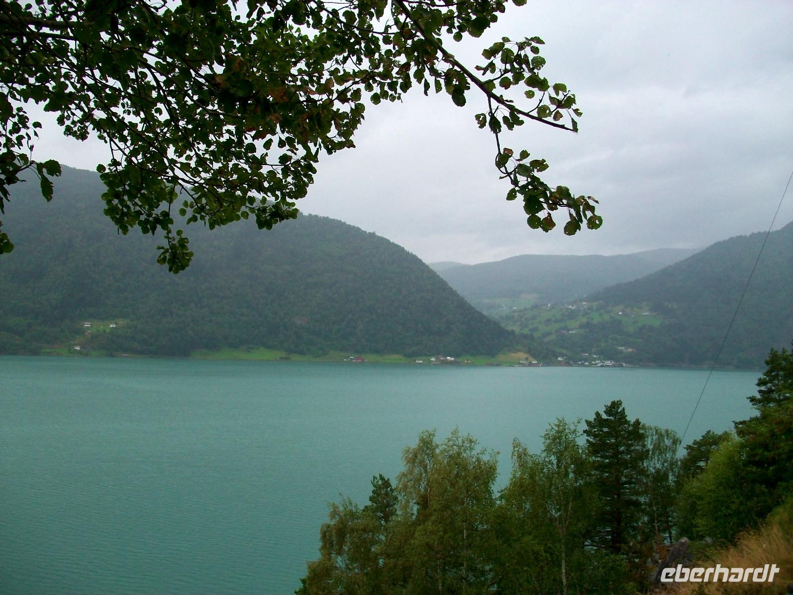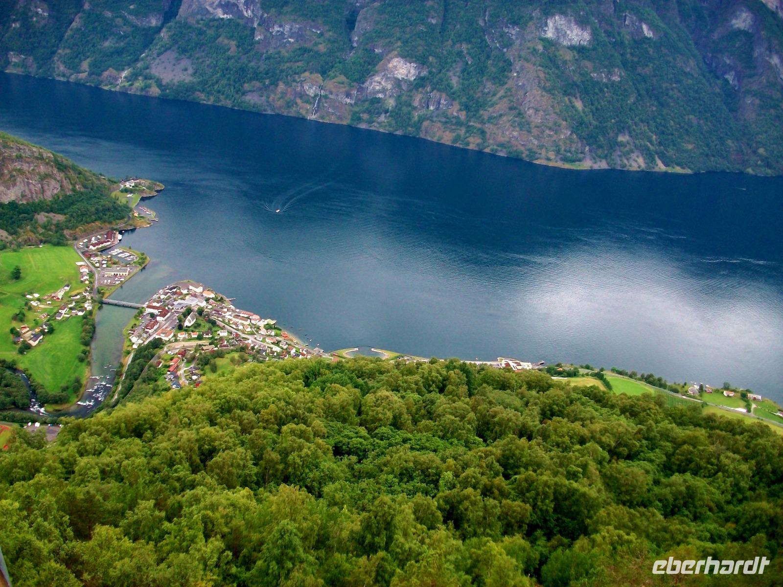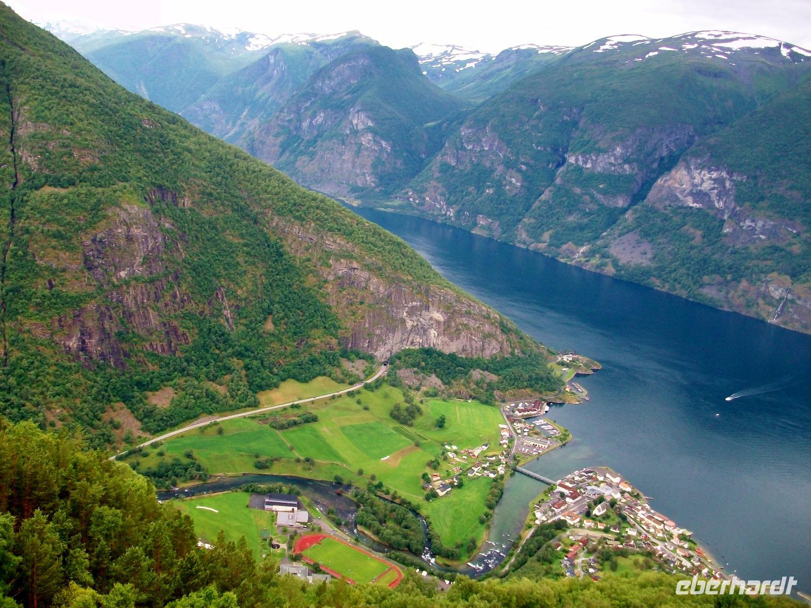 Dann geht es wieder abwärts; wir gelangen zu den Fjorden, überqueren das Wasser mit einer Fähre und im beschaulichen Ort Lærdal mit den uralten Holzhäusern gönnen wir uns eine Mittagspause.