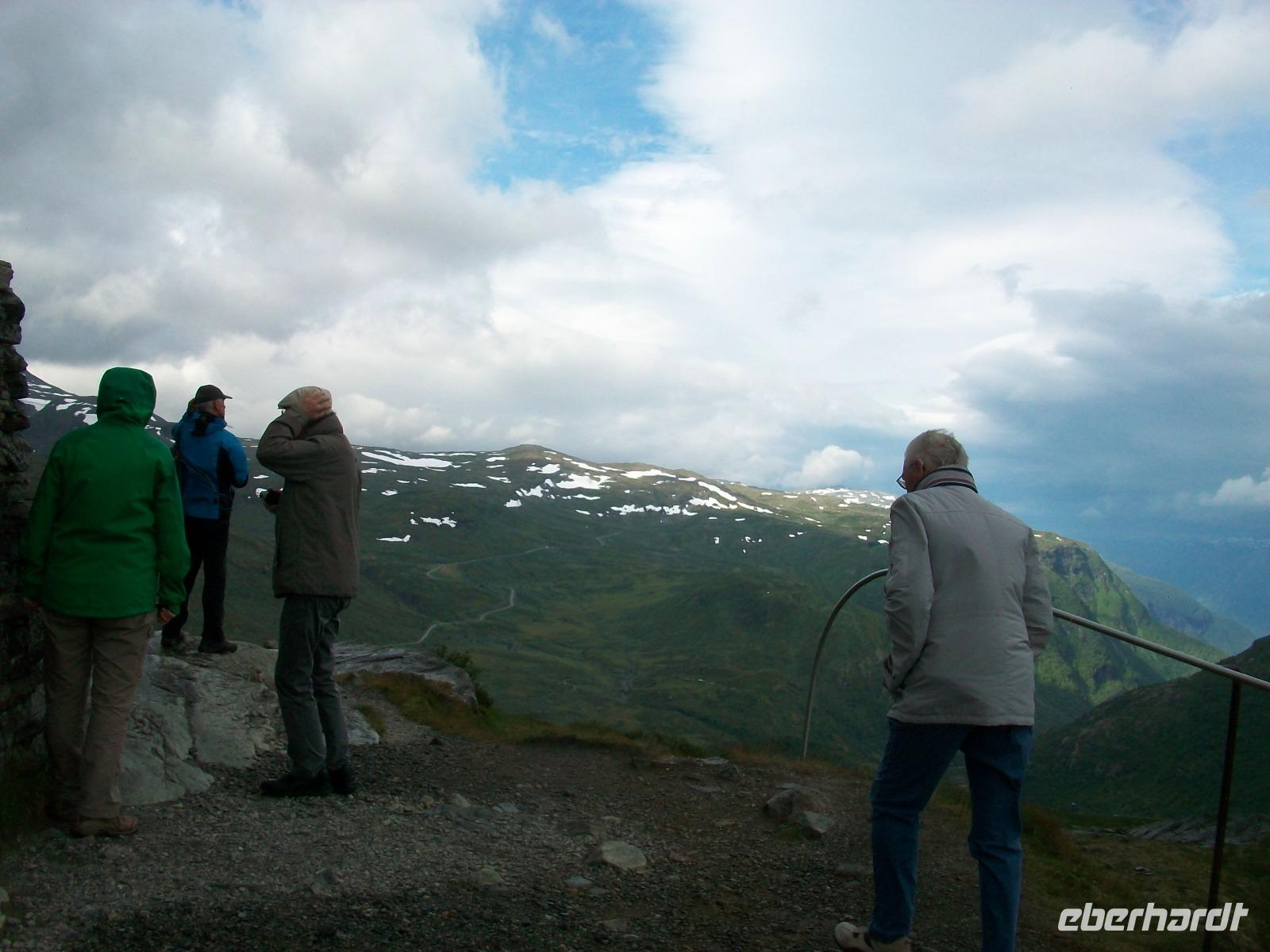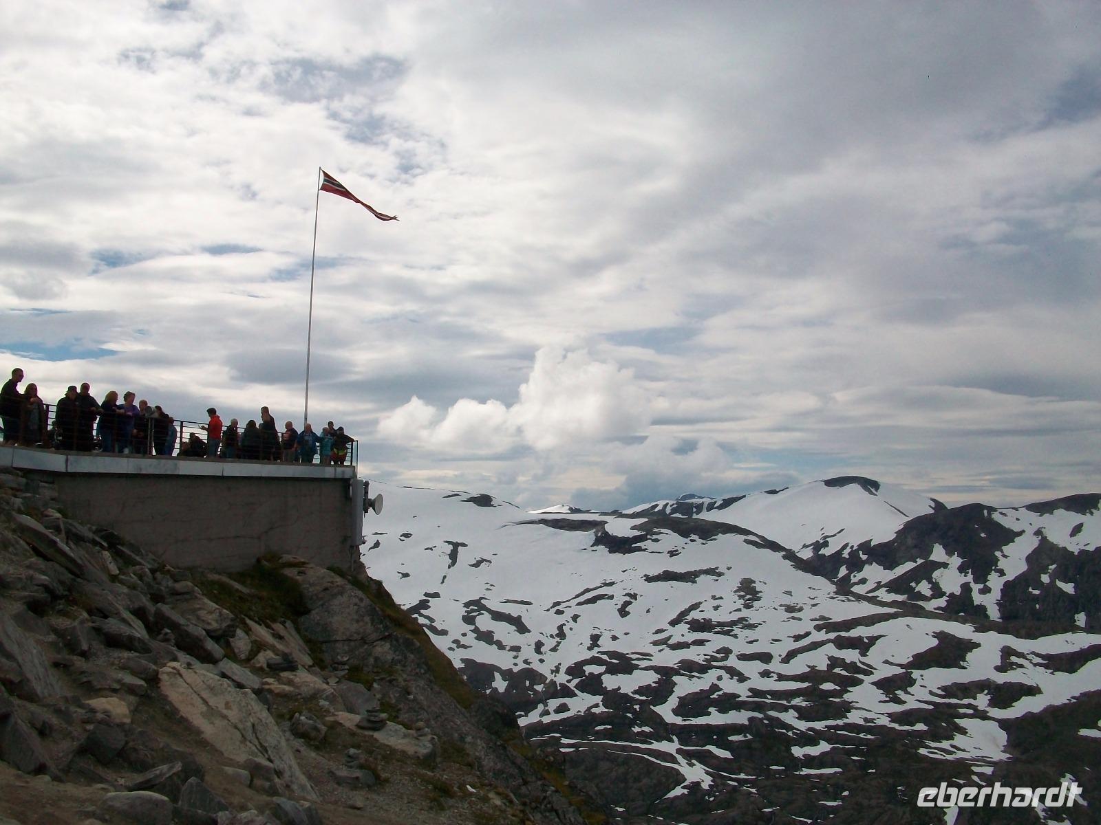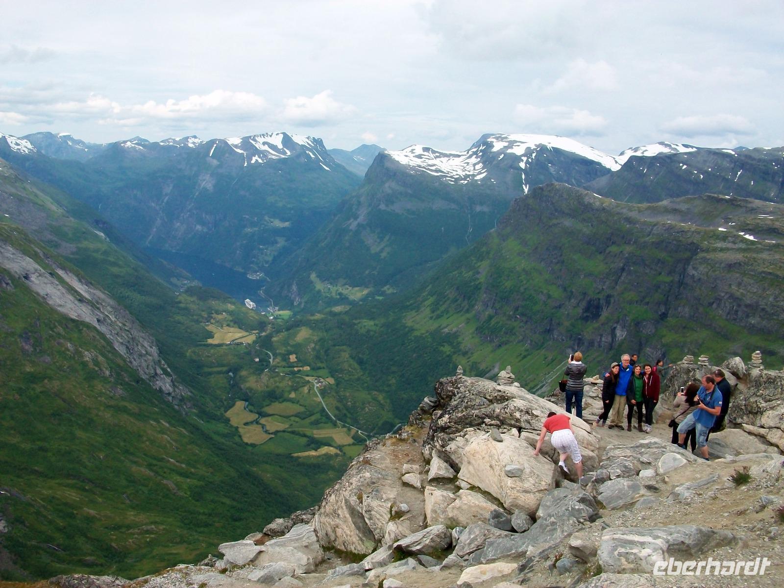 Hier liegt ein Kreuzfahrschiff vor Anker und im kleinen Ort ist es doch etwas hektisch; wir nehmen die Fahrt wieder auf um die Höhen des Dalsnibba, es ist der Hausberg von Geiranger, zu erklimmen. Eine Stunde später und wir sind 1 500 Meter angestiegen; oben vom Plateau gibt es einen wunderbaren Blick über den Fjord und die Schneeberge, ein weiterer großer Höhepunkt unserer Reise.