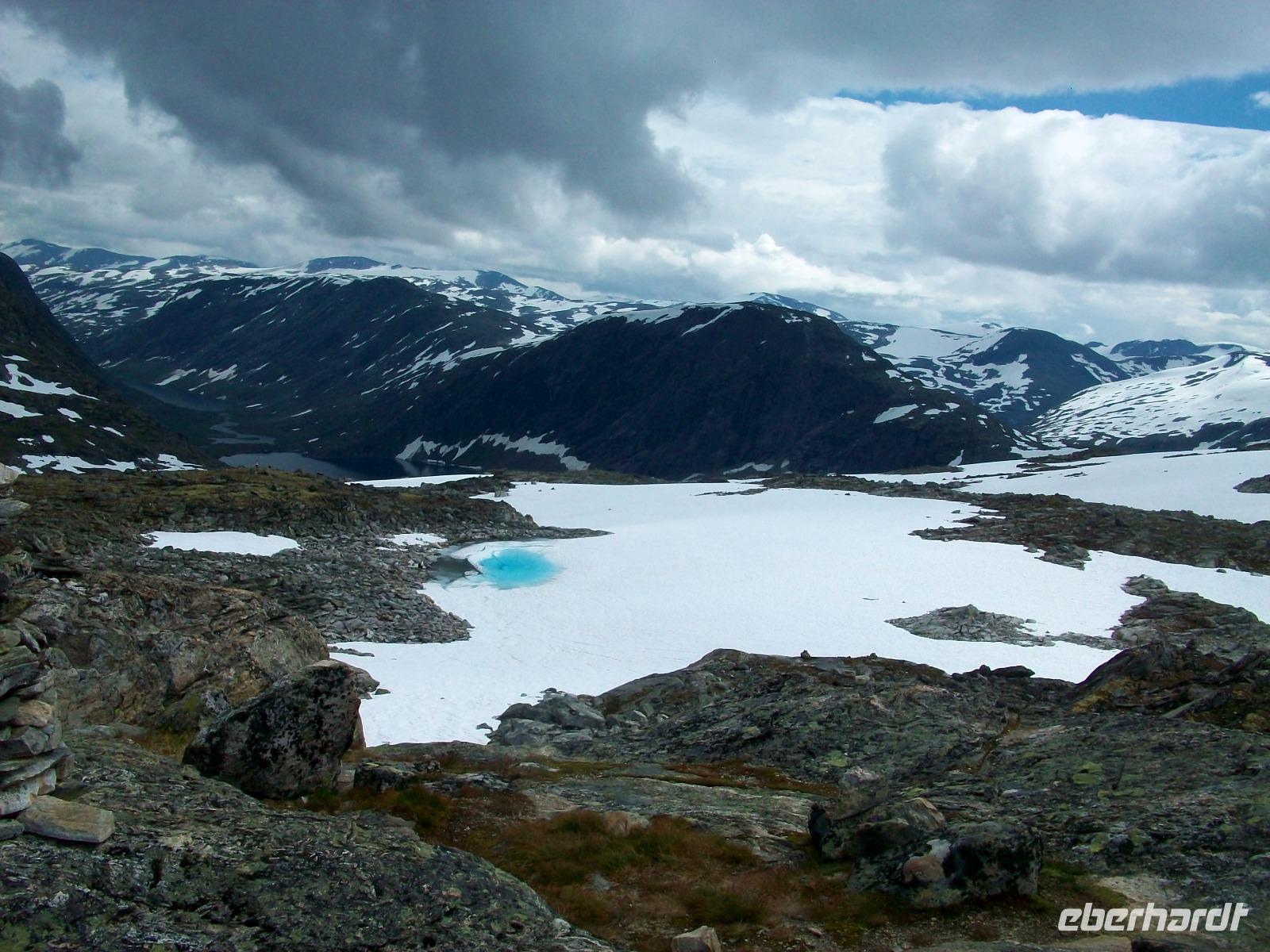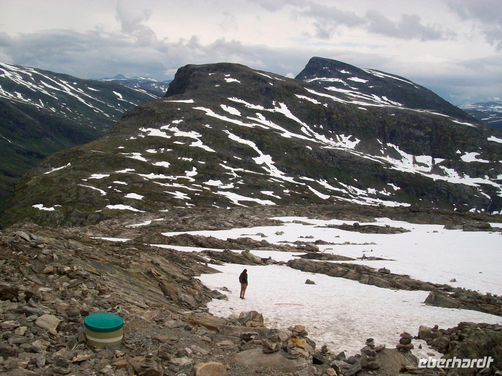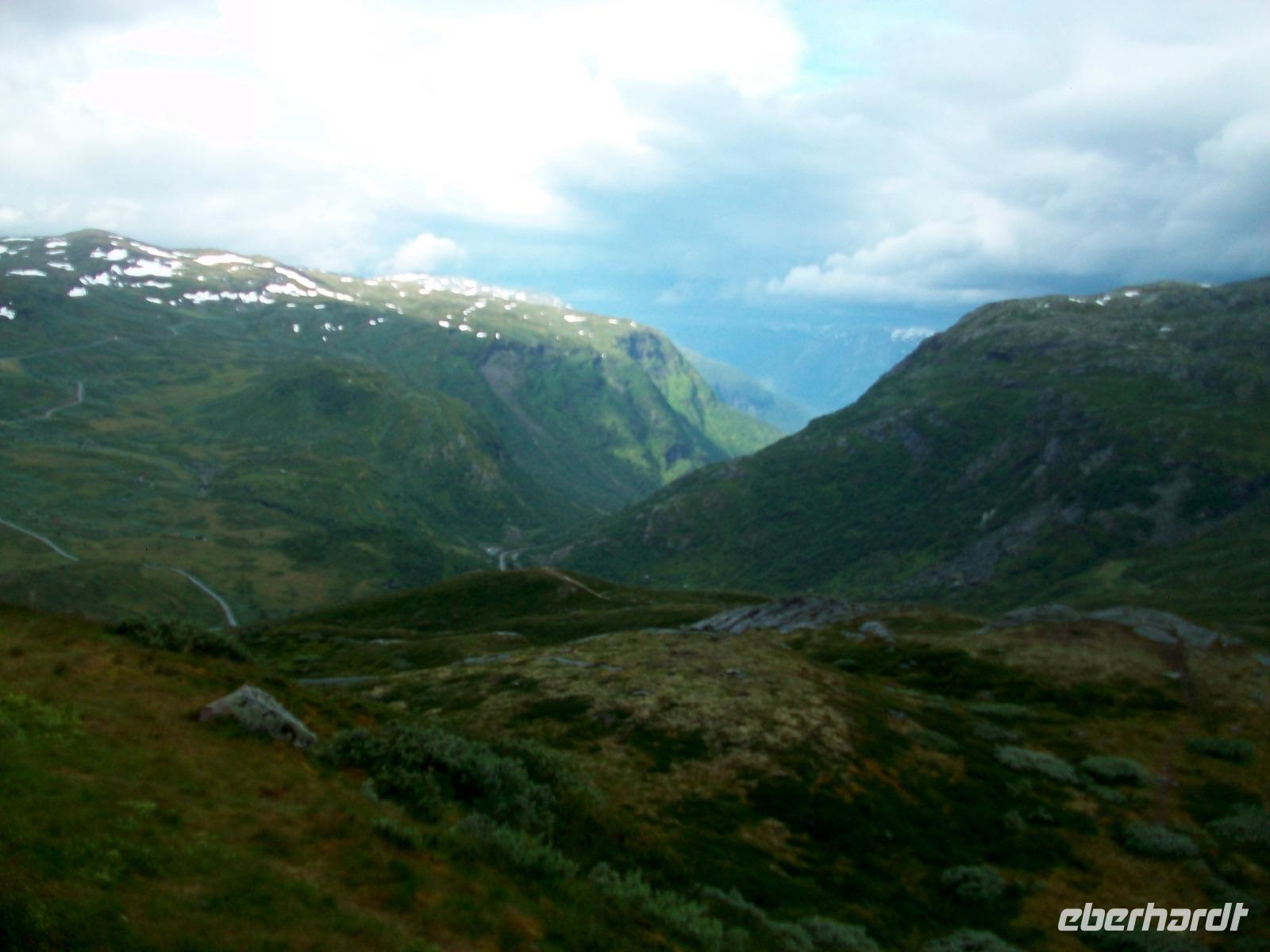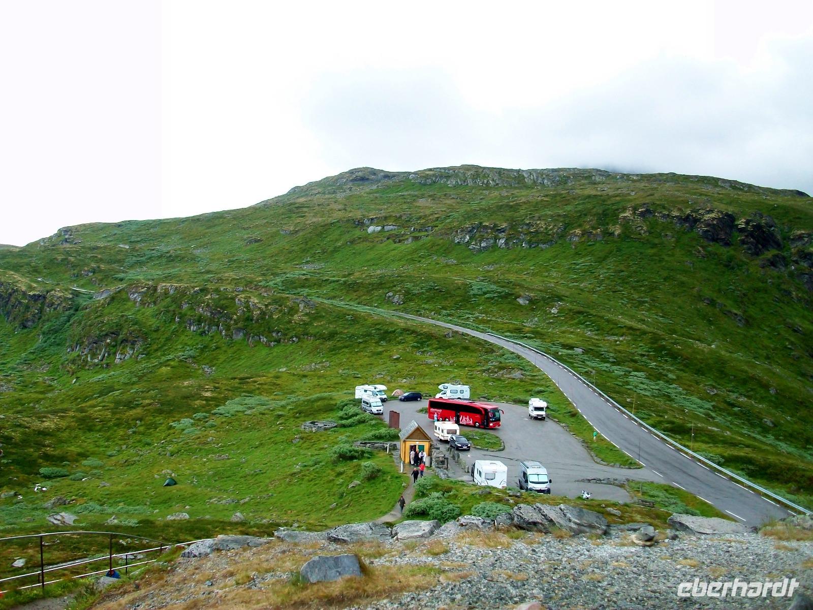 Hier liegt ein Kreuzfahrschiff vor Anker und im kleinen Ort ist es doch etwas hektisch; wir nehmen die Fahrt wieder auf um die Höhen des Dalsnibba, es ist der Hausberg von Geiranger, zu erklimmen. Eine Stunde später und wir sind 1 500 Meter angestiegen; oben vom Plateau gibt es einen wunderbaren Blick über den Fjord und die Schneeberge, ein weiterer großer Höhepunkt unserer Reise.