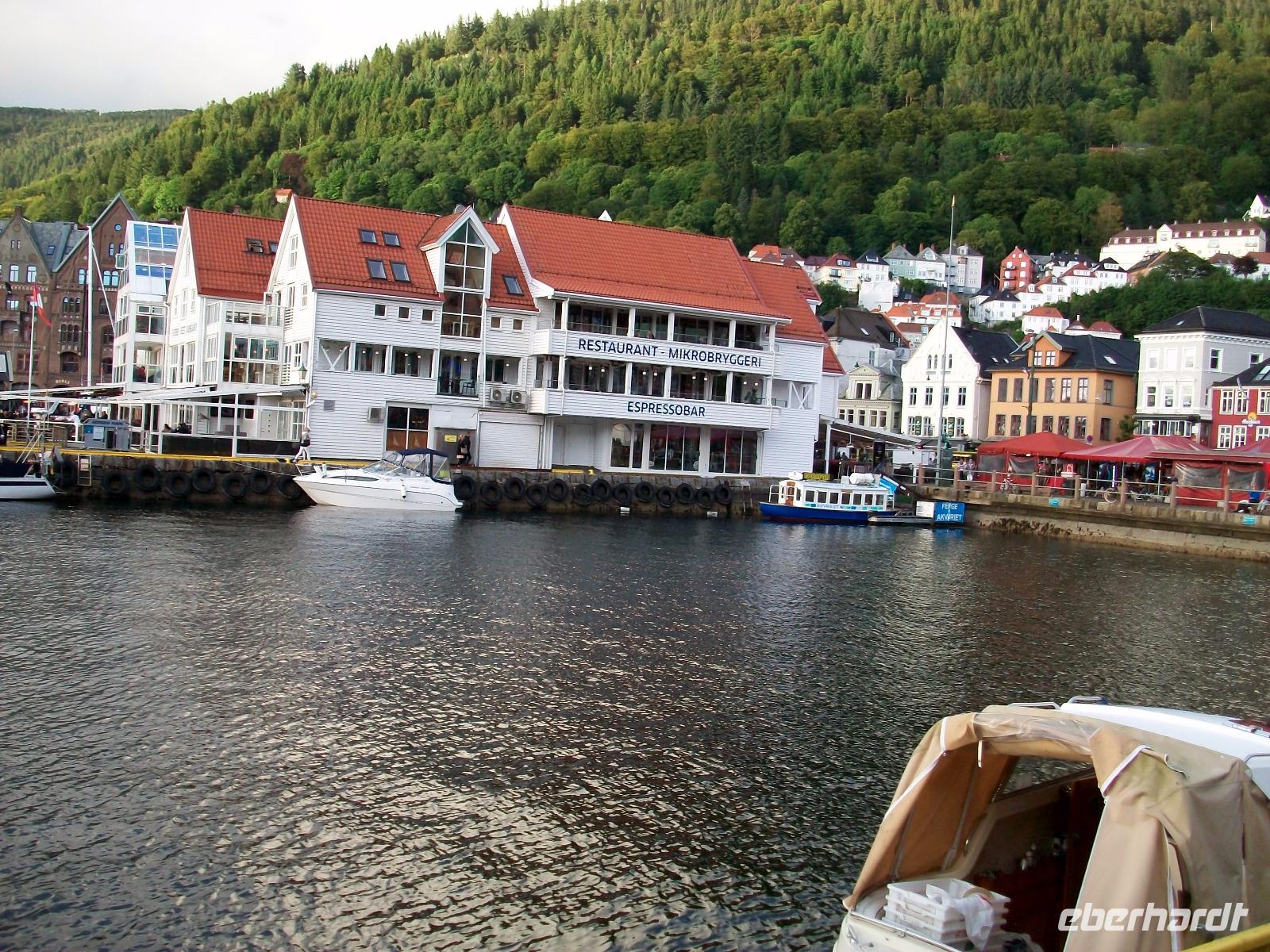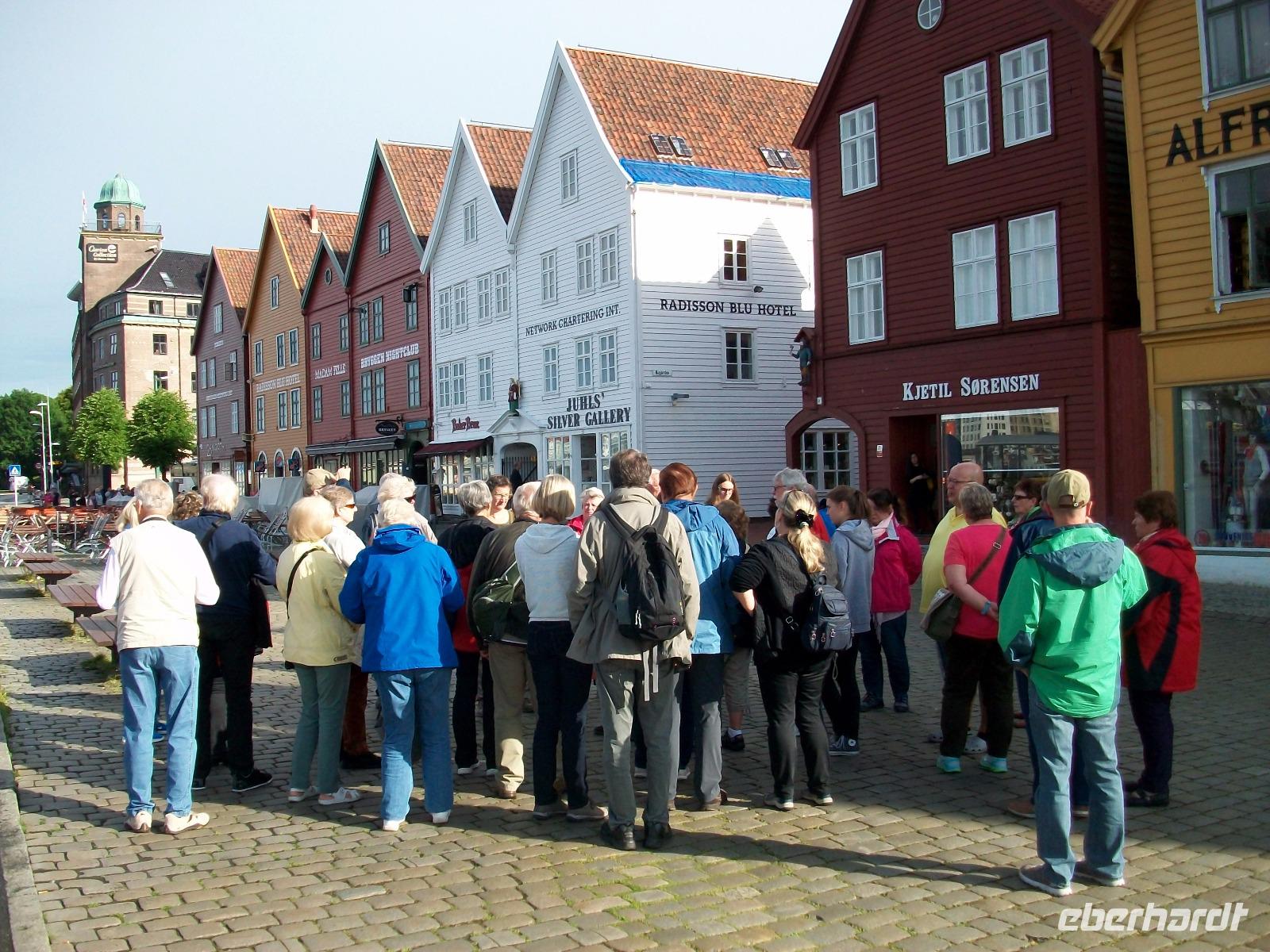 28.7.2017. Man sagt Bergen sei der regenreichste Ort Skandinaviens. Keine Spur davon am heutigen Tag! Sonne und warme Temperaturen begleiten uns bei den Entdeckungen in dieser Stadt. Mit dem örtlichen Führer Bernard geht es nun auf Erkundung. Wir lernen den Hafen kennen, machen einen Abstecher auf einen Hügel mit den historischen Häusern aus Holz und erkunden wenig später das alte hanseatische Viertel Bryggen zu Fuß. Hier wurde einst viel Geld verdient, und die etwas windschiefen Häuser legen Zeugnis vom einstigen Reichtum dieser Stadt ab.