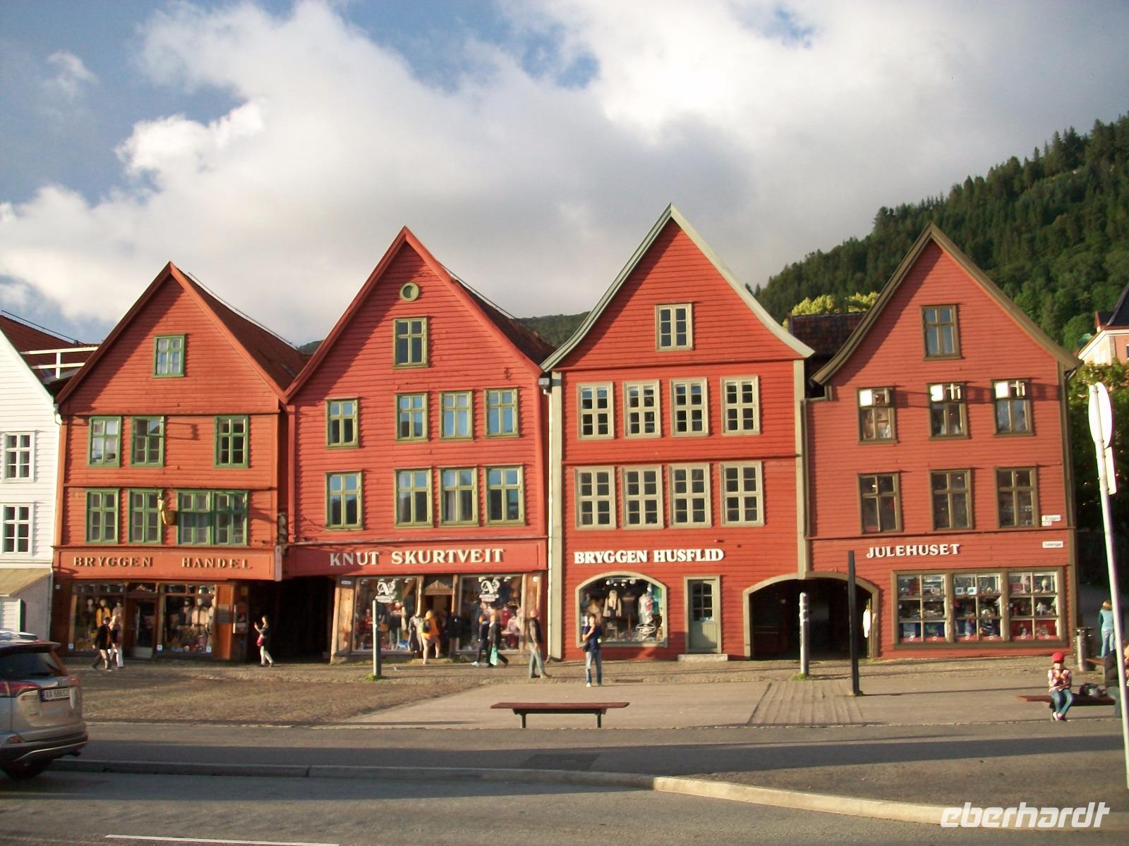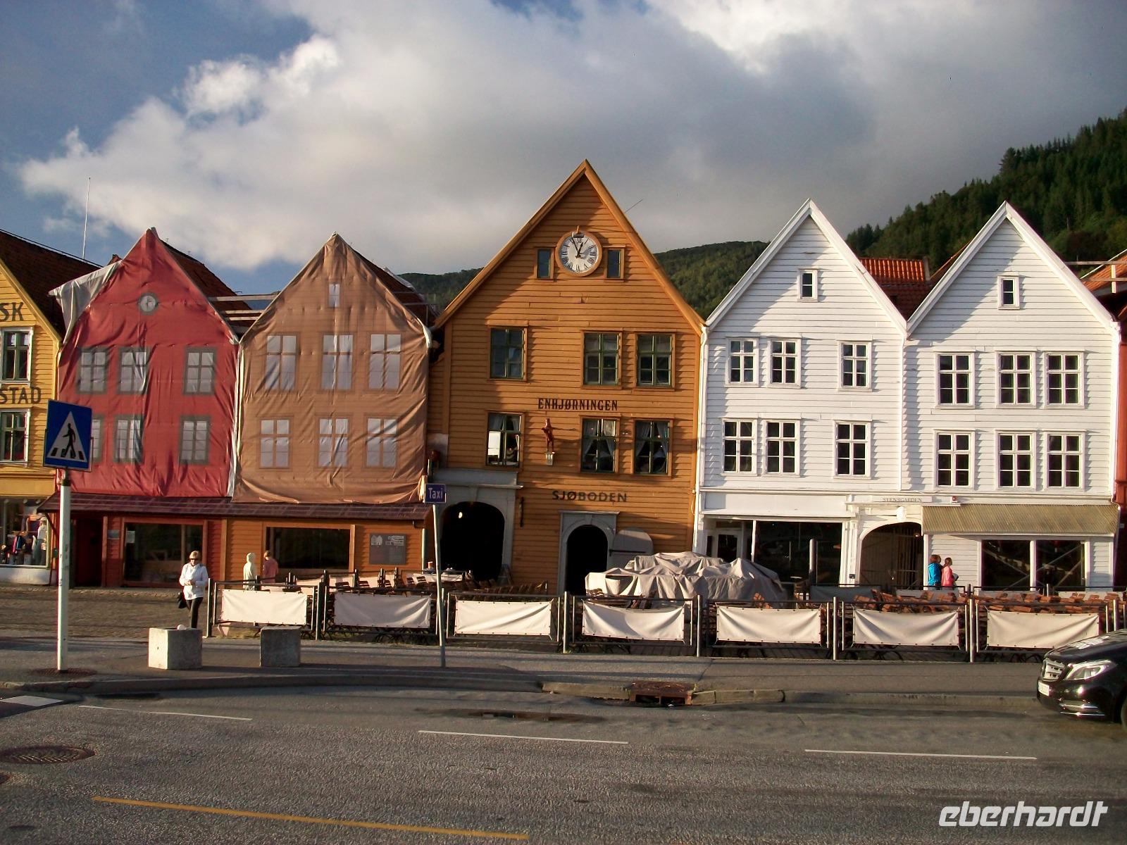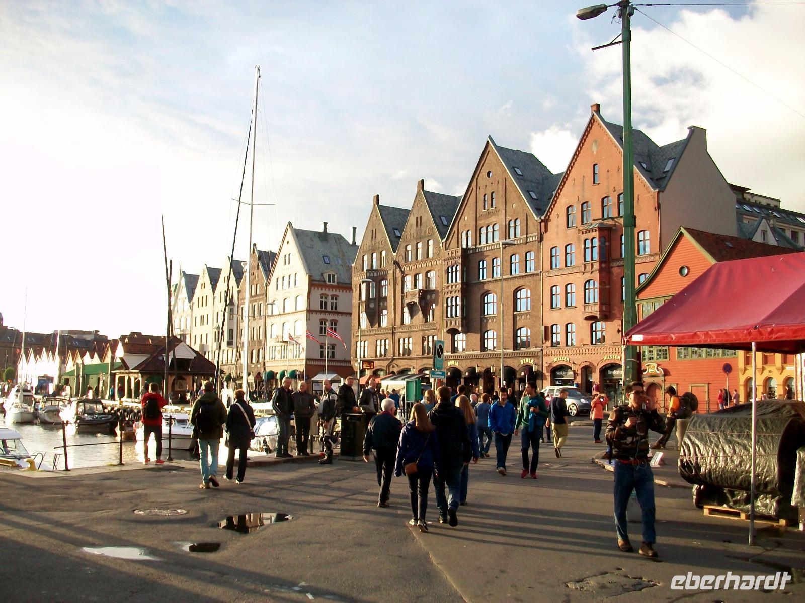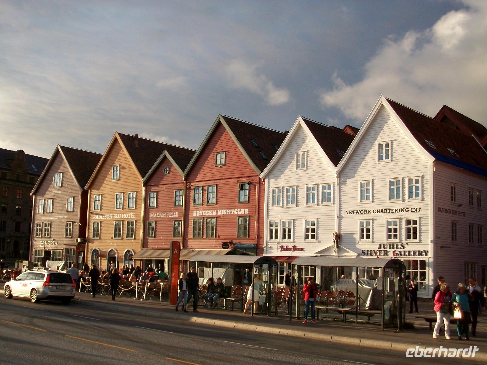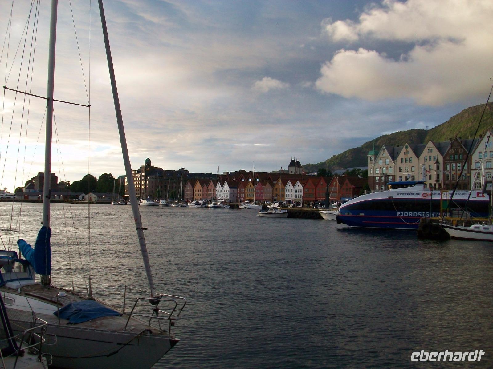 Hier tröpfelt uns doch etwas Regen ins Gesicht, als wir aber weiterfahren und uns unserem Ziel nähern, reißt der Himmel auf und als wir in Bergen anlangen lacht die Sonne und lädt uns zu einem ersten Bummel in dieser reizenden Stadt ein.