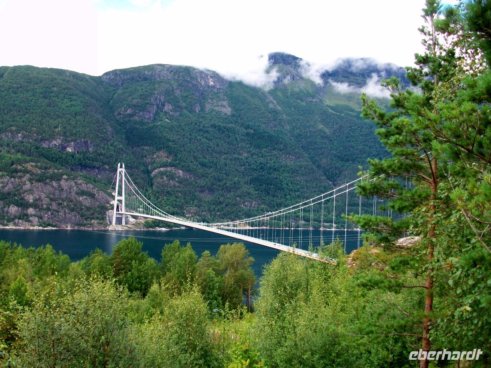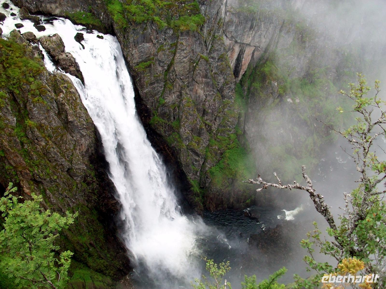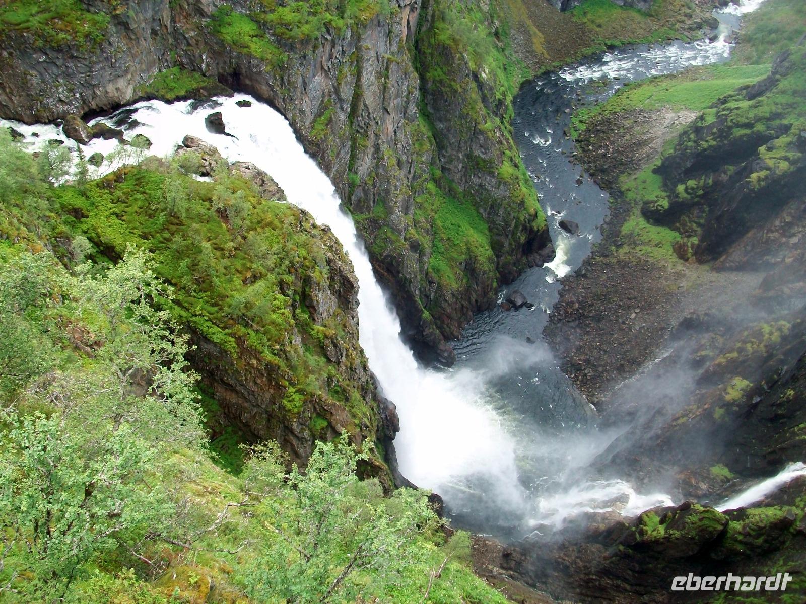 Unser weiterer Weg führt uns entlang der mächtigen Wasserfläche des Hardangerfjords zu einem weiteren beeindruckenden Wasserfall der zu den höchsten in Norwegen zählt. Als wir durch mehrere Kehrtunnels aufsteigen sehen wir schon einen mächtigen Schleier aus Wasserstaub der vom Vøringfoss gebildet wird. Oben, von den verschiedenen Aussichtspunkten, wird die Macht des Wassers so richtig offenbar. Der Fall sendet das rauschende Nass fast 200 Meter hinab in einen Talkessel wo es donnernd zerstiebt und eine Wolke aus Millionen von Wassertröpfchen bildet die über dem Tal schwebt.