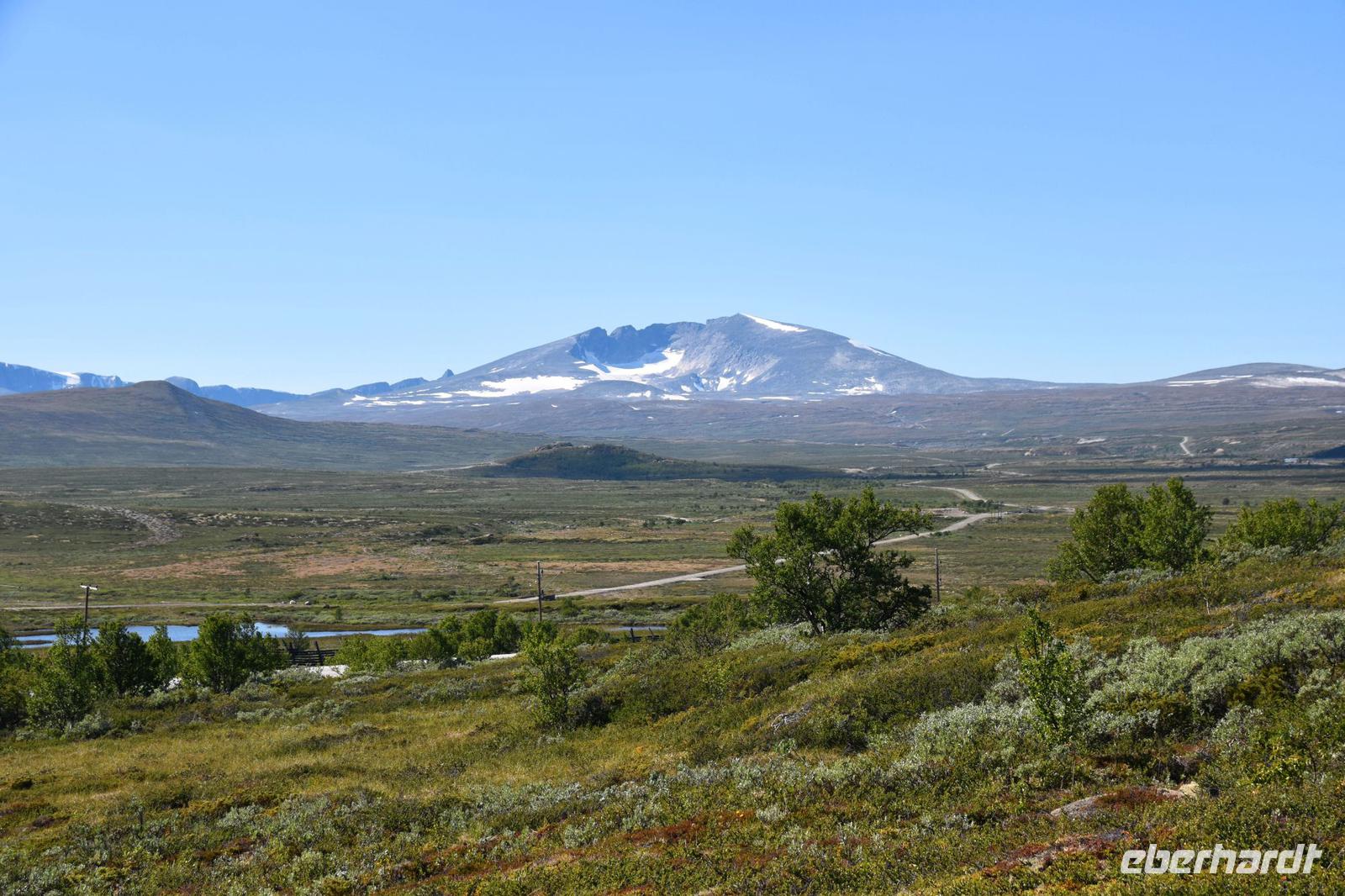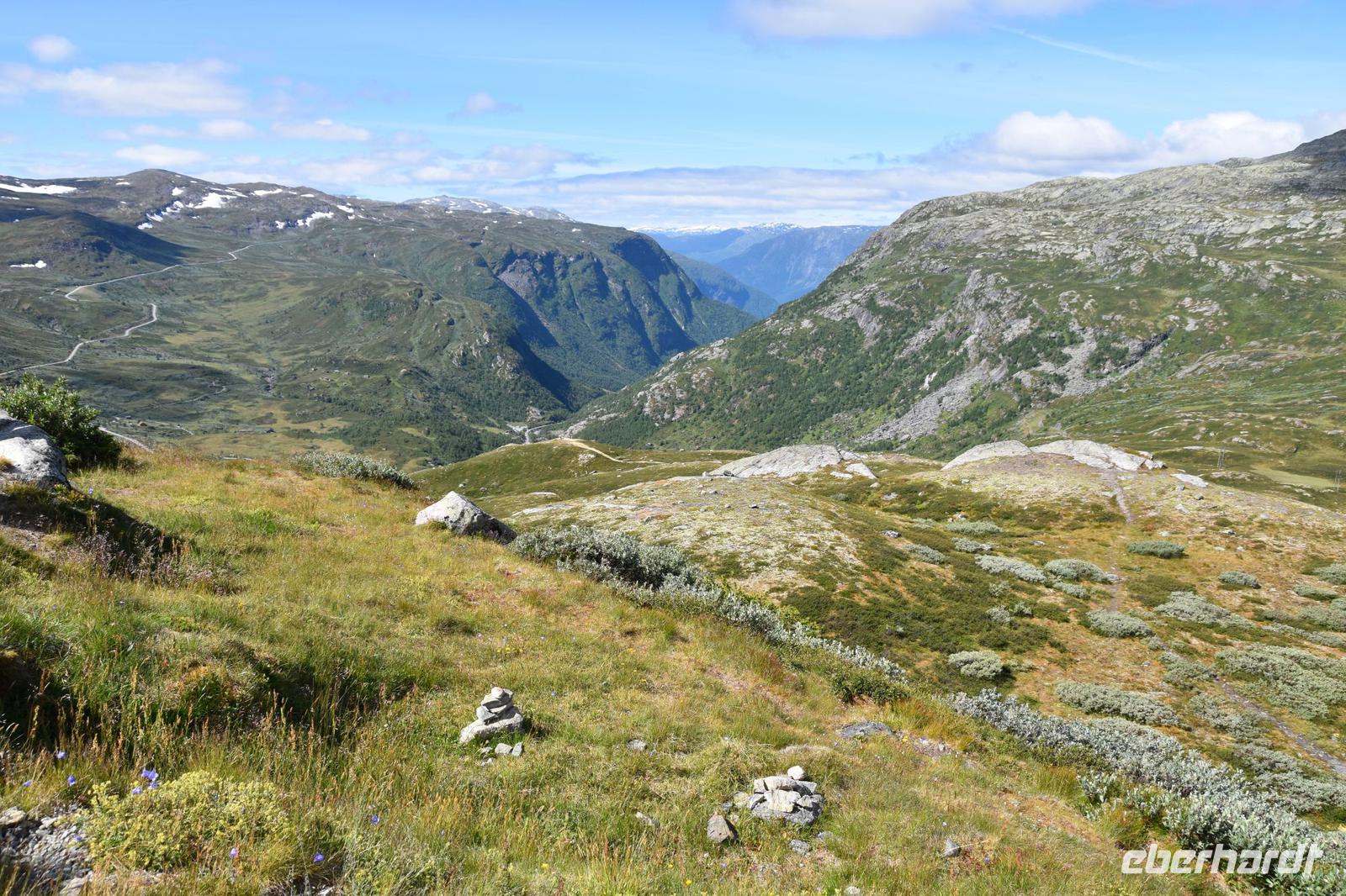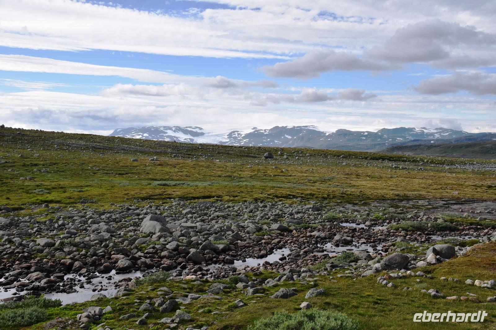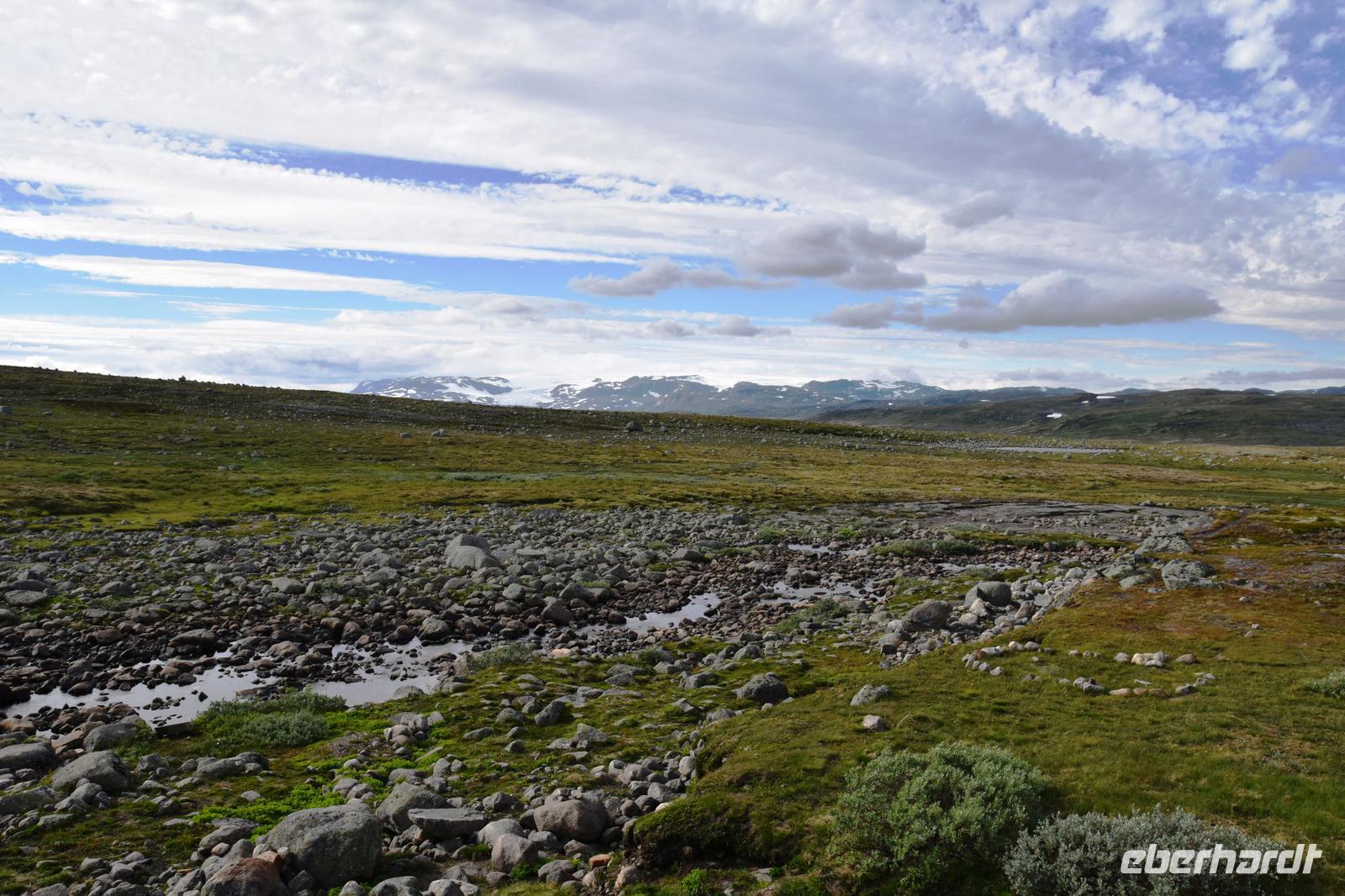Oben, an einer Aussicht in den Weiten der Harddangervidda, machen wir nochmals Halt und schauen über diese tundraähnliche Landschaft zu den Gletscherbergen im Norden.